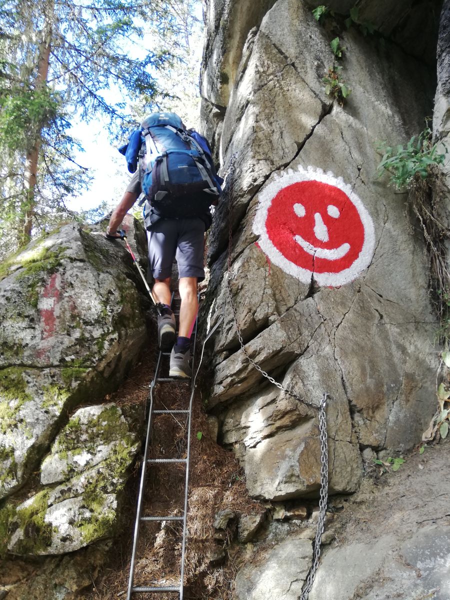 Am Sonntag Wanderung zum Lehnerjoch und weiter über den Südrücken auf den Schafhimmel. Markiert, einfach. Auf etwa 50m führt der Weg knapp unterhalb des Grates in der felsigen Ostflanke. Dort lag Schnee, hier sind aber auch Seilsicherungen vorhanden, daher ebenfalls problemlos. Der Abstieg am Nachmittag dann wieder fast schneefrei.