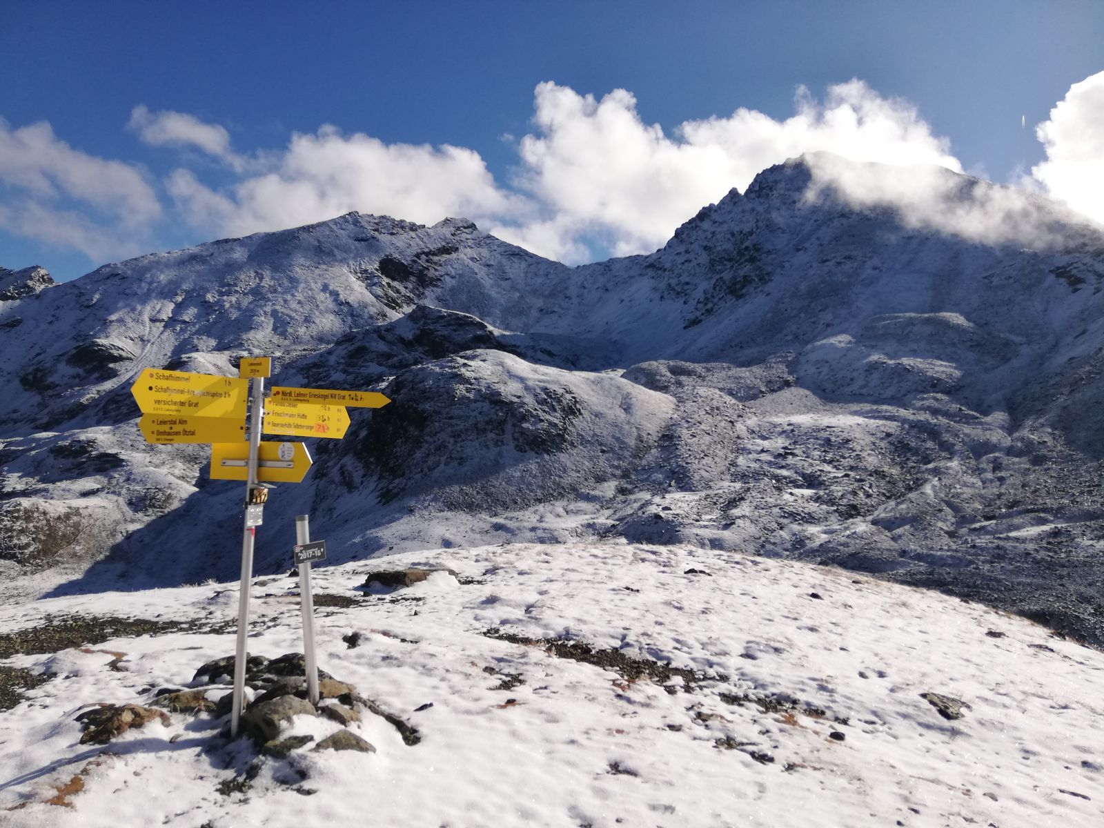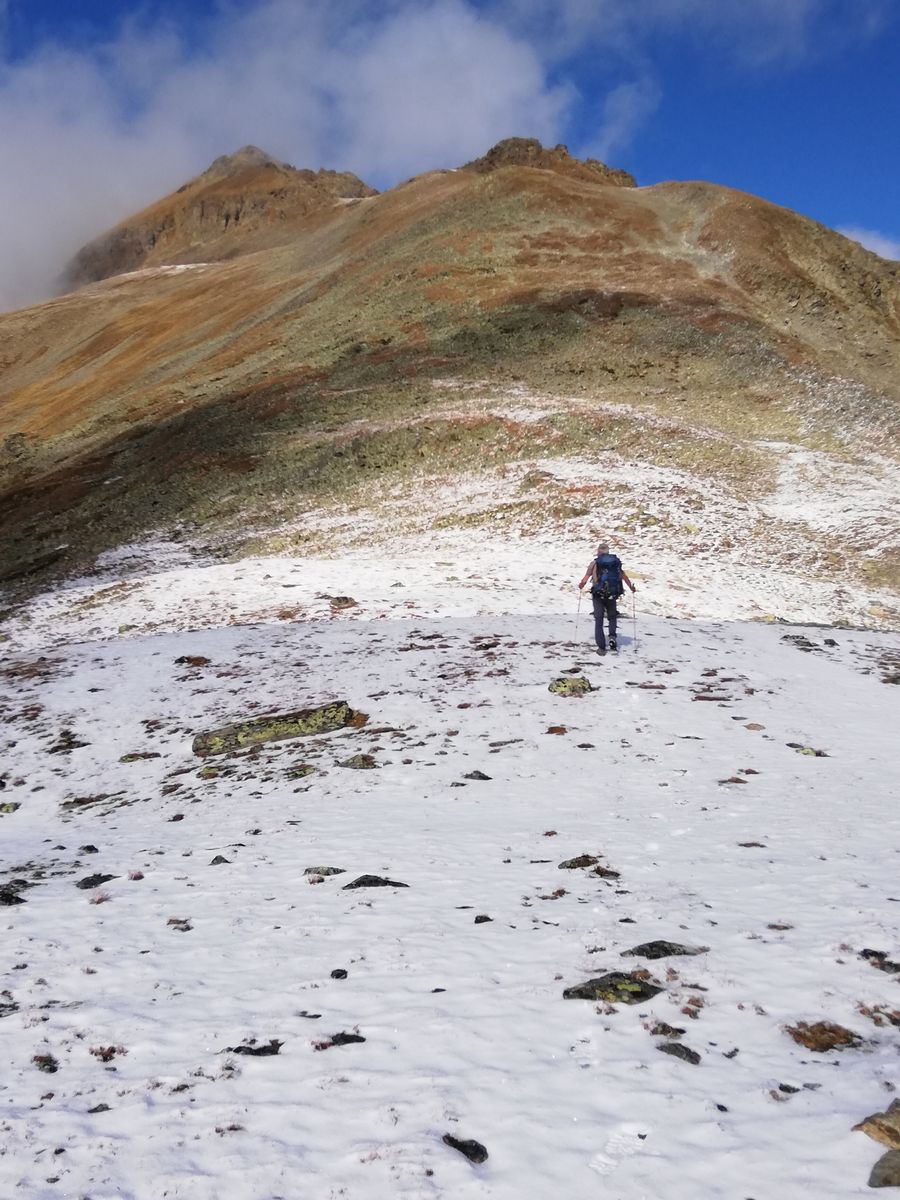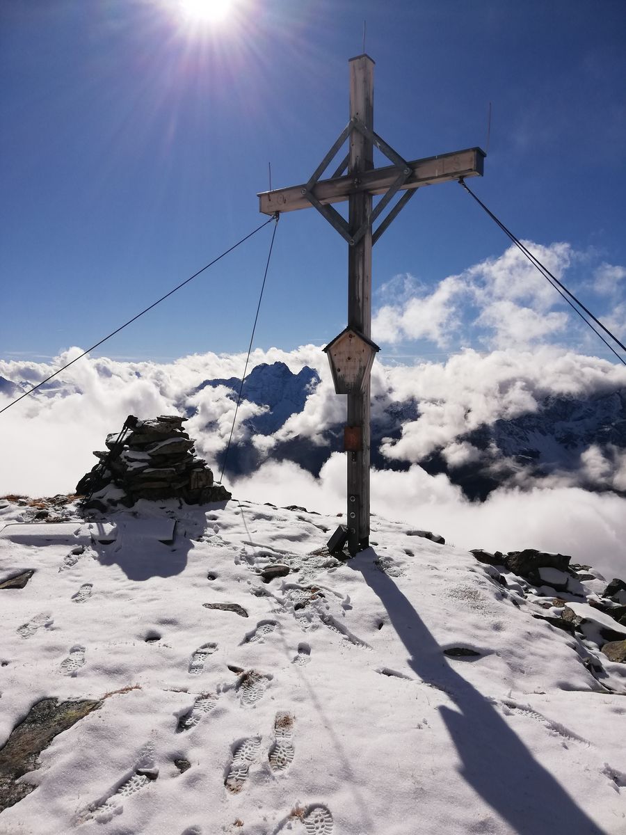 In der Nacht schneite es bis Hüttennähe herab, liegengeblieben ist er morgens bis etwa 2200m herab, tagsüber taute es süd- und westseitig bis in die Gipfelbereiche, nord- und ostseitig blieb der Schnee bis etwa 2300-2400m herab liegen. Es waren aber nur 2-3cm, die jetzt auch wieder weitgehend weg sein dürften.