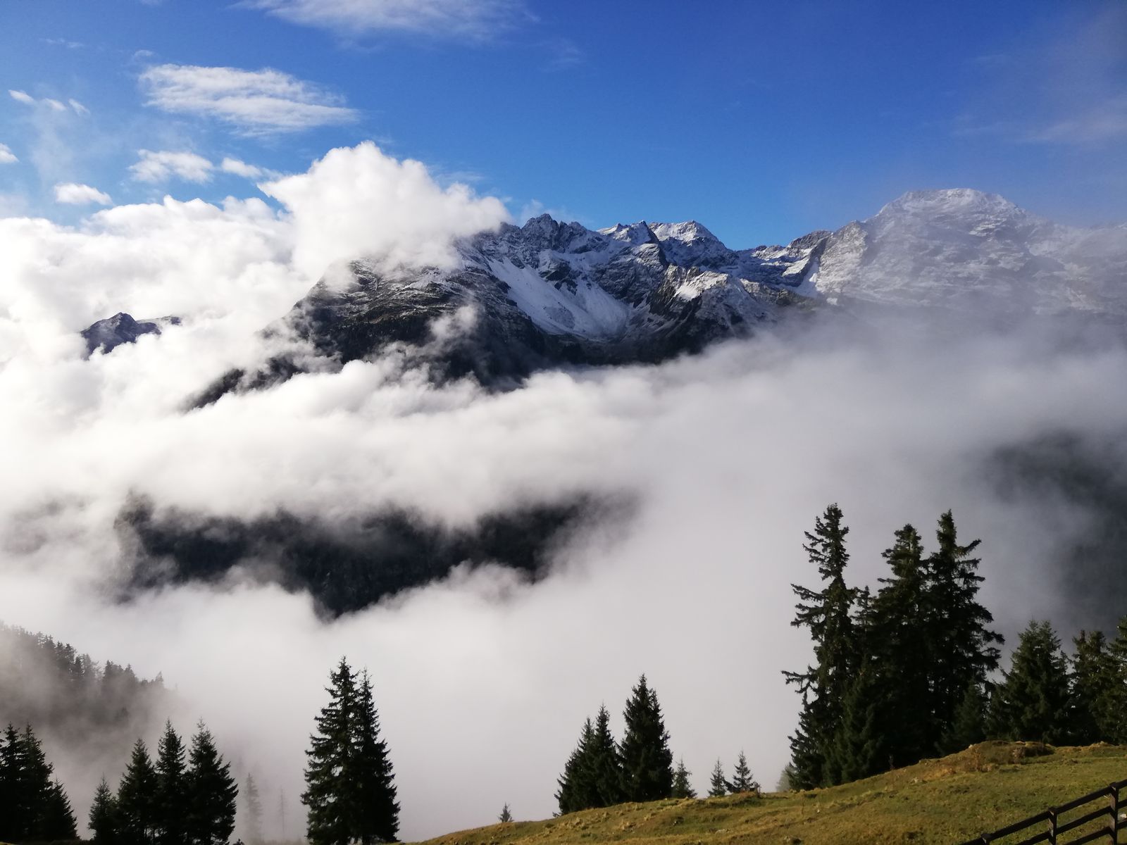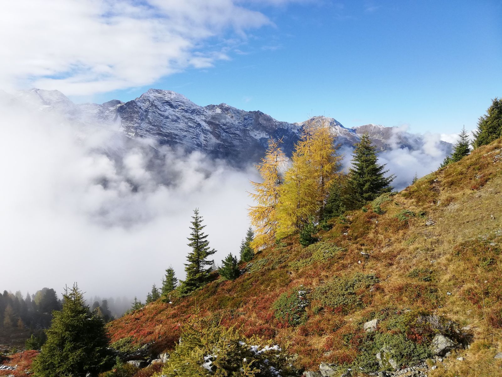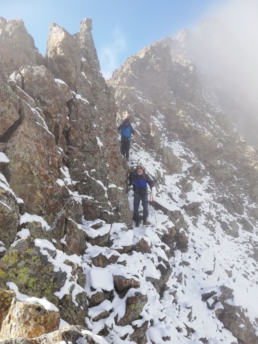 In der Nacht schneite es bis Hüttennähe herab, liegengeblieben ist er morgens bis etwa 2200m herab, tagsüber taute es süd- und westseitig bis in die Gipfelbereiche, nord- und ostseitig blieb der Schnee bis etwa 2300-2400m herab liegen. Es waren aber nur 2-3cm, die jetzt auch wieder weitgehend weg sein dürften.