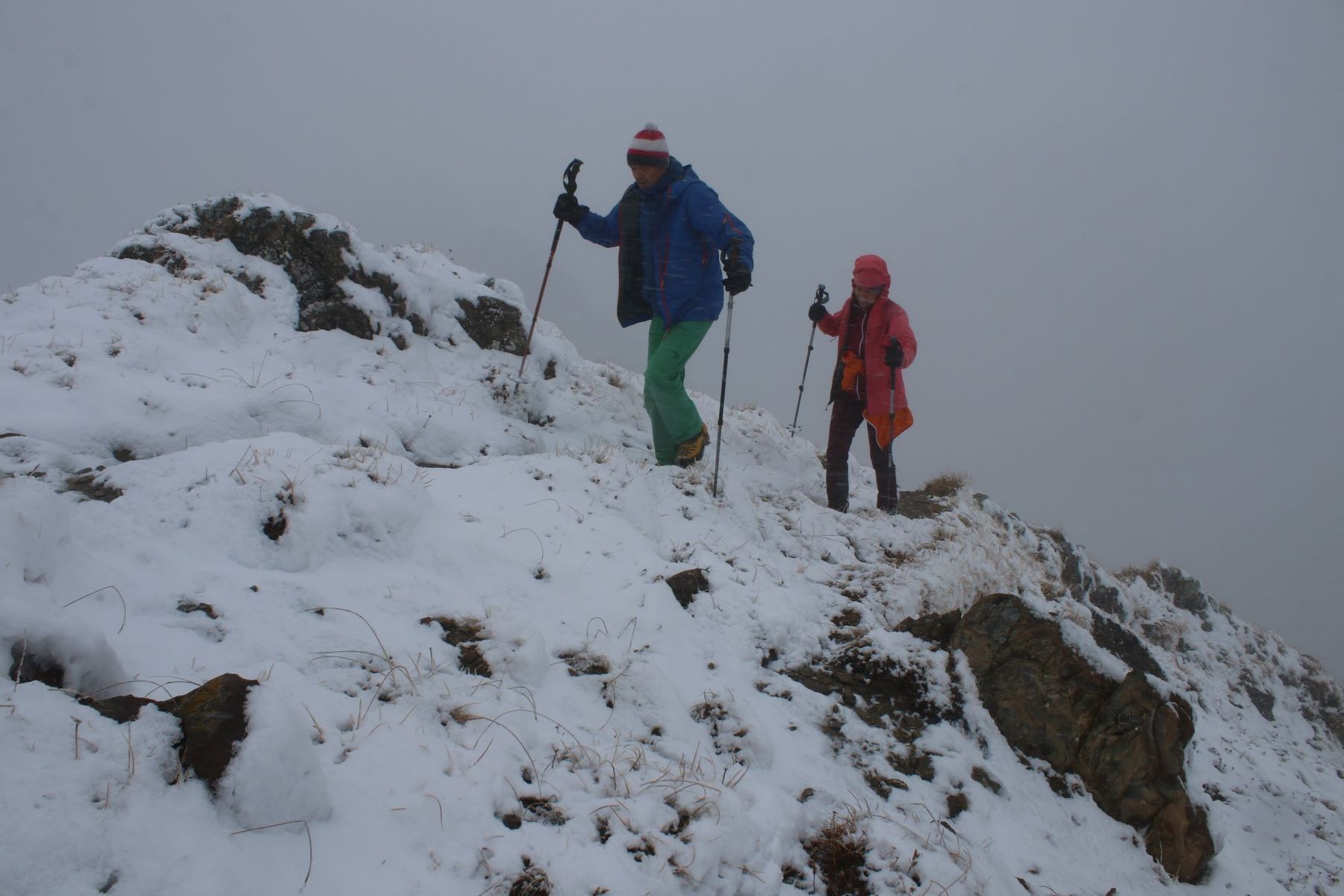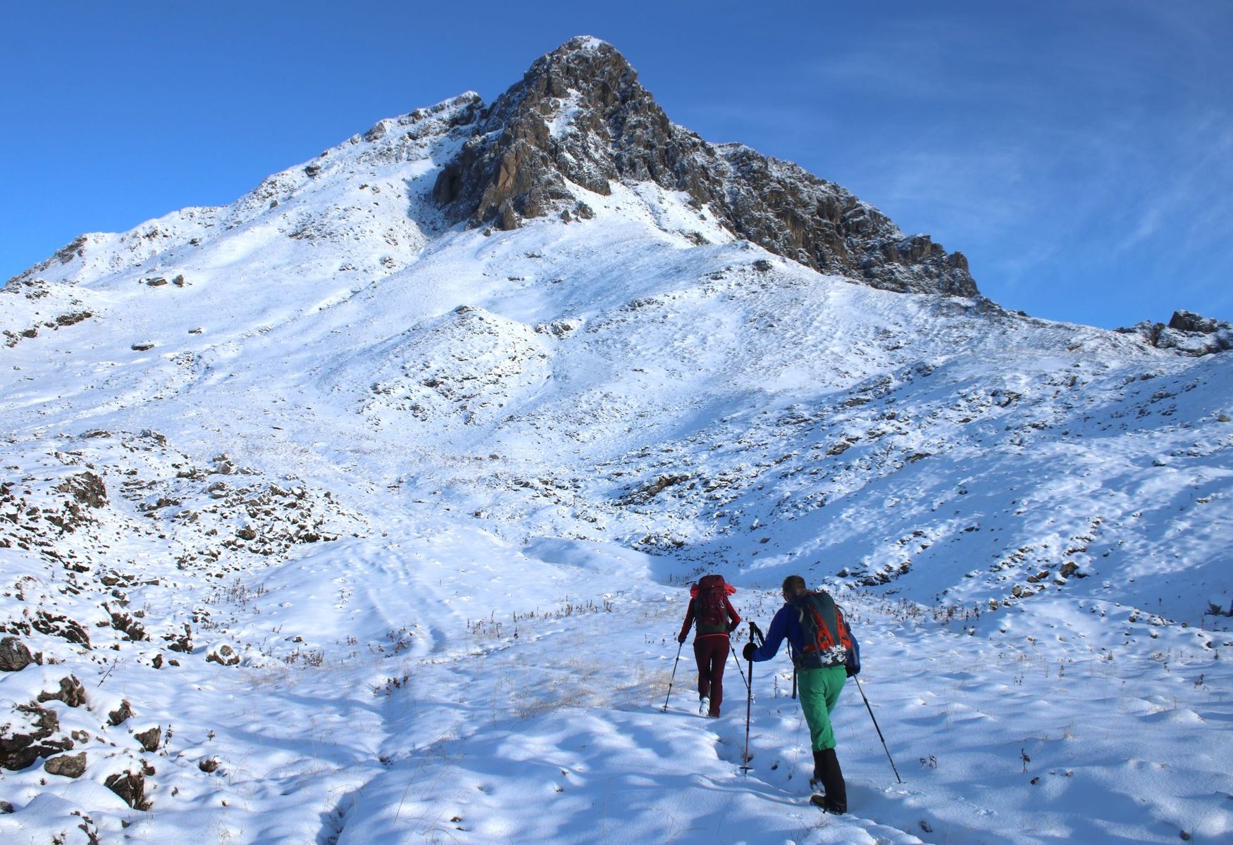 Höhepunkt der 25 km langen Tour war natürlich die knapp 2400 m hohe Hochkünzlespitze, die sich nach nächtlichen Schneefällen bis 1800 m hochwinterlich zeigte. Auf 2200 m liegen im Lechquellengebirge ca. 10 cm Schnee.