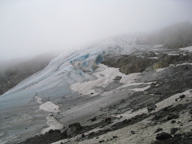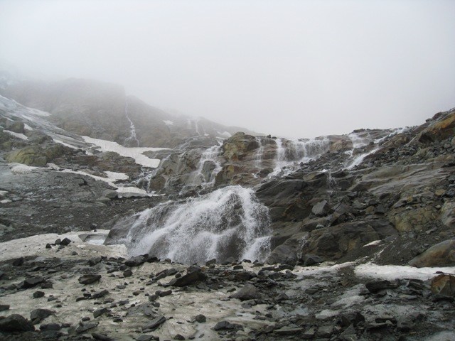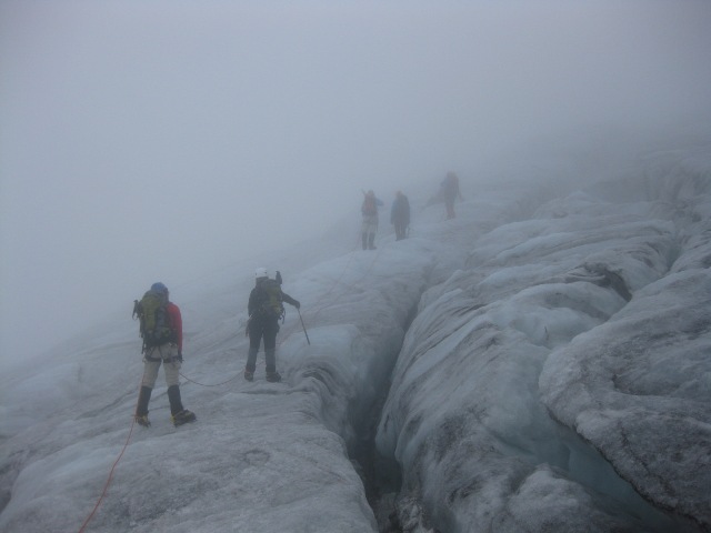 Tourenverhältnisse: Am Samstag bei bedecktem Himmel von der Grawaalm zur Sulzenau Hütte. Start am Sonntag bei Nebel in Richtung Zuckerhütl. Zum Ferner am besten den markierten Weg in Richtung Sulzenauferner folgen. Bei den Steinmännern weiter nach Süden über die flache Zunge des Gletschers. Dann westlich über Schotter den ersten Steilaufschwung umgehen. Ab ca. 2800m ist anseilen angesagt. Der in der AV-Karte eingezeichnete Weg wird immer spaltiger und ist durch Steinschlag vom Pfaffengrat bedroht. Wir sind weiter in der Mitte gegangen, wobei wir den riesigen Spalten im großen Zickzack umgangen haben. Bei guter Sicht ist die Orientierung definitiv einfacher;-). Wegen der nicht eingetroffenen Wetterbesserung, Umkehr auf ca. 3100m.