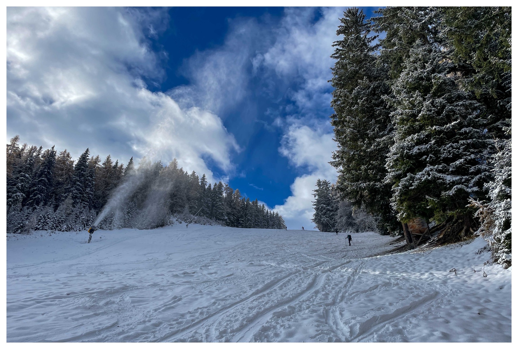 Hätte ich nicht erwartet: Der Aufstieg ist direkt ab Parkplatz möglich. Ich habe heute für den Aufstieg die Herrenabfahrt gewählt - da sind weniger Leute unterwegs. Die Schneekanonen, die heute in Betrieb waren, haben sich in Grenzen gehalten. Beim Aufstieg hatte ich für mich die Einschätzung, dass die Abfahrt über die Herrenabfahrt zwar möglich, aber vermutlich kein skifahrerisches Highlight darstellen wird (weiter unten relativ wenig Schnee auf der Piste, weiter oben teilweise ruppig durch den gepressten Schneekanonenschnee. Von daher für die Abfahrt die Damenabfahrt gewählt, was vermutlich die deutlich bessere Wahl war. Wer ein wenig kontrolliert fährt, braucht nicht einmal die Steinski (also zumindest ich hätte sie heute nicht gebraucht, aber jeder sucht sich ja so seine eigene Spur und von daher möchte ich ob meiner verwegenen Aussage nicht schuld an dem einen oder anderen Kratzer im Belag schuld sein