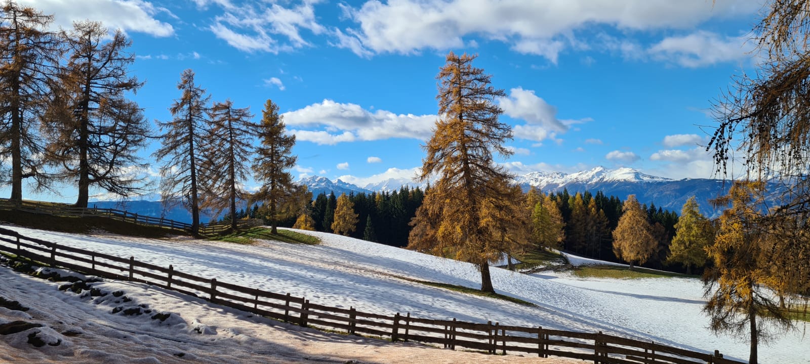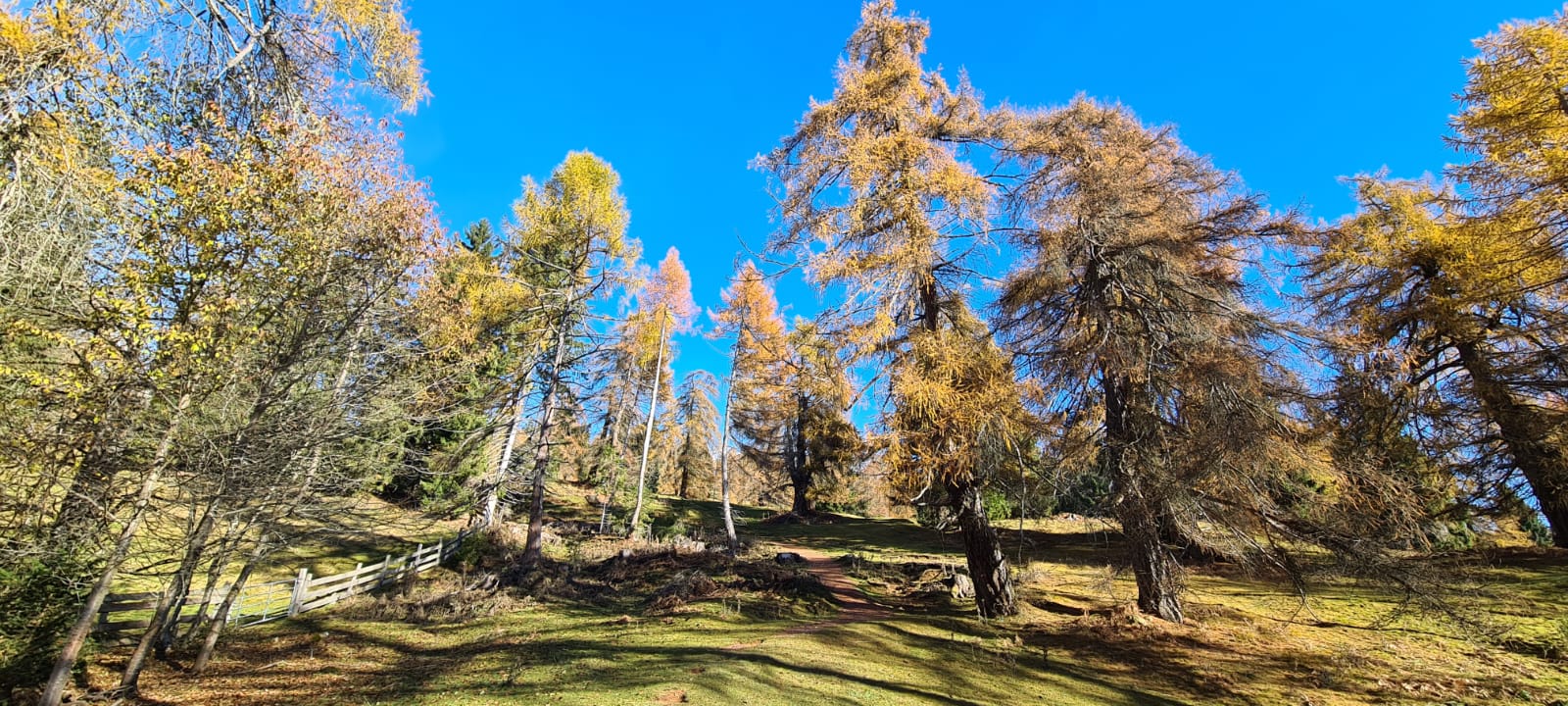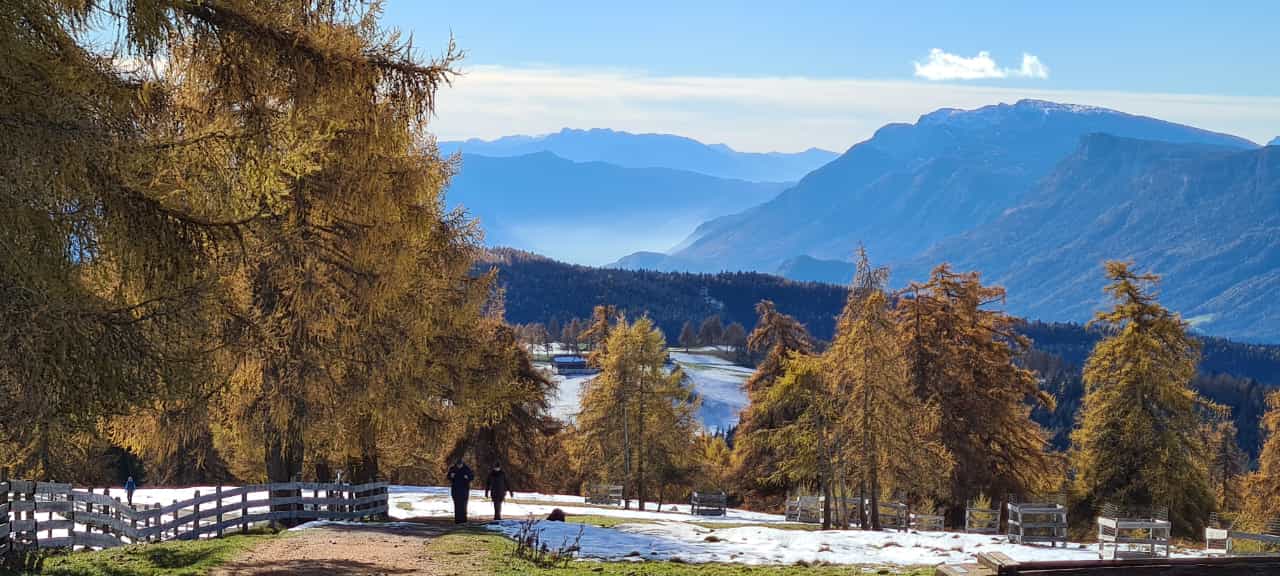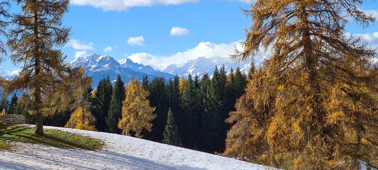 Eine ideale Wanderung für den Spätherbst mit grandiosem Dolomitenblick und herrlich braunen Lärchen.