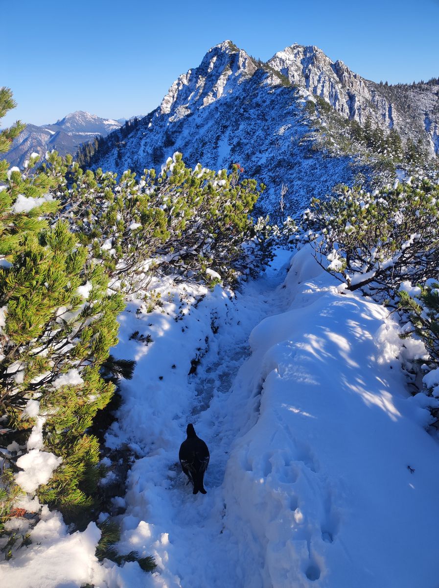 Ich bin über die Ostroute auf den Heimgarten, dann über den Grat zum Herzogstand und auf dem Südsteig wieder runter. Schnee liegt südseitig ab ca. 1500, nordseitig ab 1100. Die Schneehöhe liegt bei maximal 10-15 cm; zum Wandern also perfekt. Grödel brauchte es heute Nachmittag nicht (Ich bin mittags nach der Arbeit gestartet.)