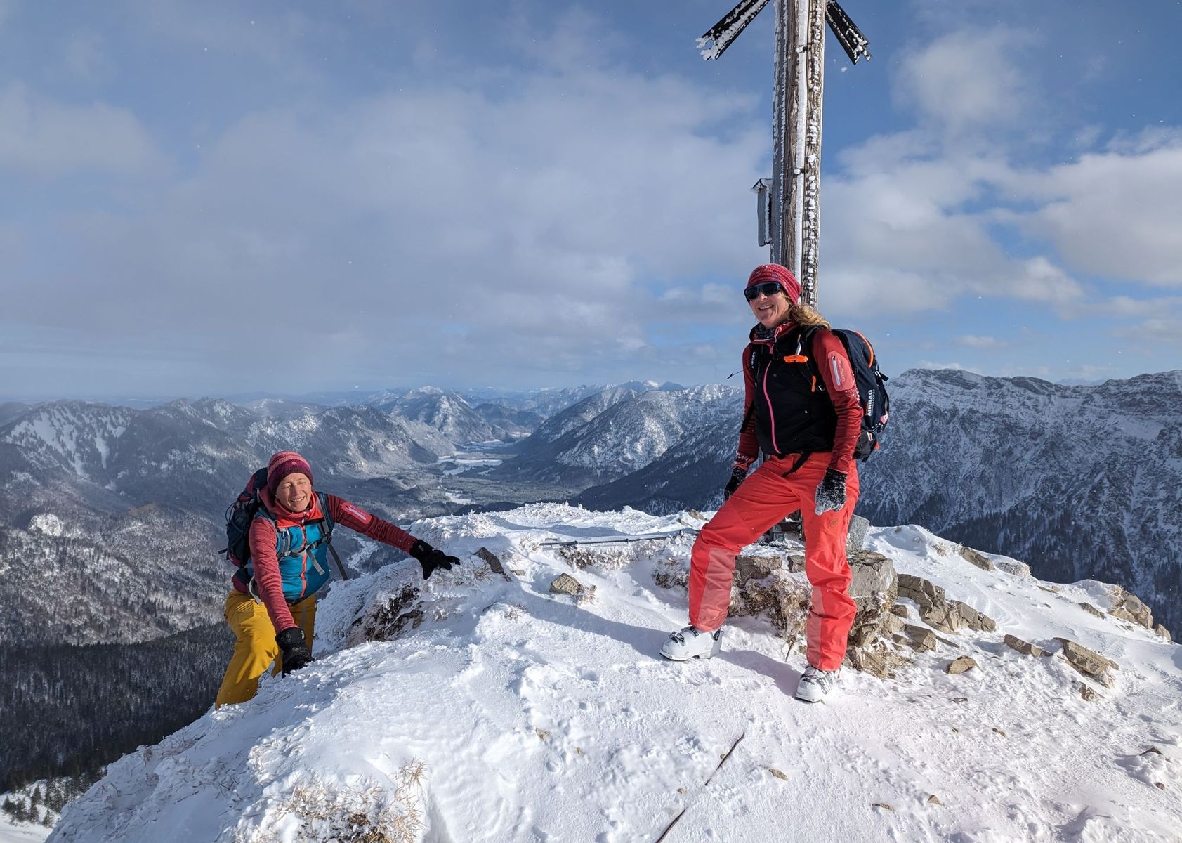 Der Gipfelanstieg – den wohl weniger als 10 % der Tourengeher*innen unternehmen – war heute etwas heikler als sonst, da am abgewehten Grat der splittrige Kalkgestein zum Vorschein kam. Dafür waren die Stahlseile, die ganz zum Schluss den Anstieg erleichtern komplett frei.