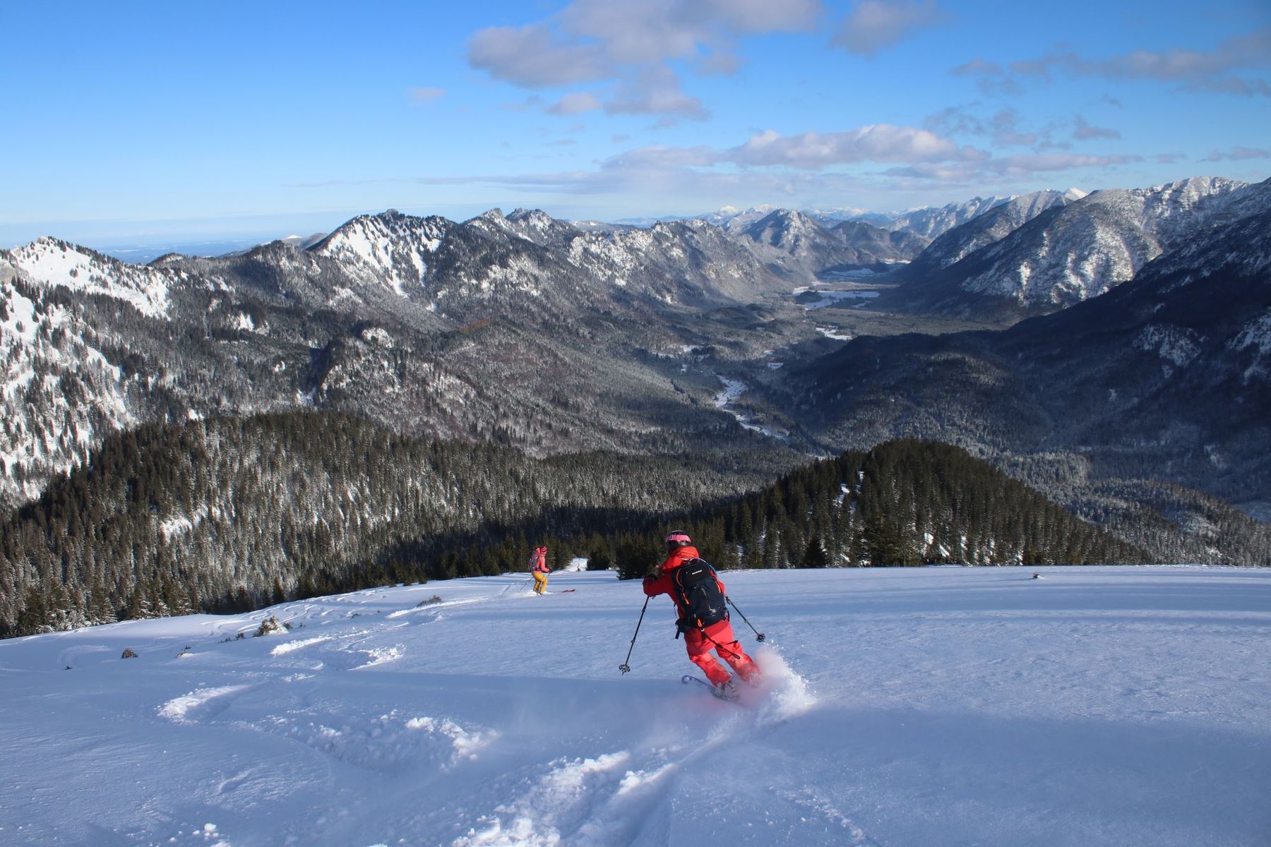 In den Ammergauer Alpen wo wir heute zur Scheinbergspitze unterwegs waren, kann man diese Frage bejahen. Hier liegt ab ca. 1100 – 1200 m ein solides Schneedeckenfundament. Selbst bei der powder-mäßigen Waldabfahrt mit ihren umgefallenen Stämmen und Baumstümpfen hatte ich keinerlei Boden- oder Holzkontakt.