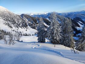 Da sich nun (13 Uhr) langsam Kaiserwetter einstellte, war ich motiviert, noch ein paar Pulverschmankerl an der Mühlhornwand mitzunehmen und bin über die Sulzingalm nochmals da hoch. Bis hier hatte ich alles selber gespurt, da andere Tourengeher sich erst am Nachmittag einfanden. (Daher die Überschrift des Beitrags.) Nach drei herrlichen Abfahrten zur Sulzing machte sich der Tag aber dann doch anheischig dem Abend zu weichen und so fuhr ich via Schreckalm ins Tal. Einen herrlichen Tag und einen bevorstehenden Muskelkater im Gepäck.