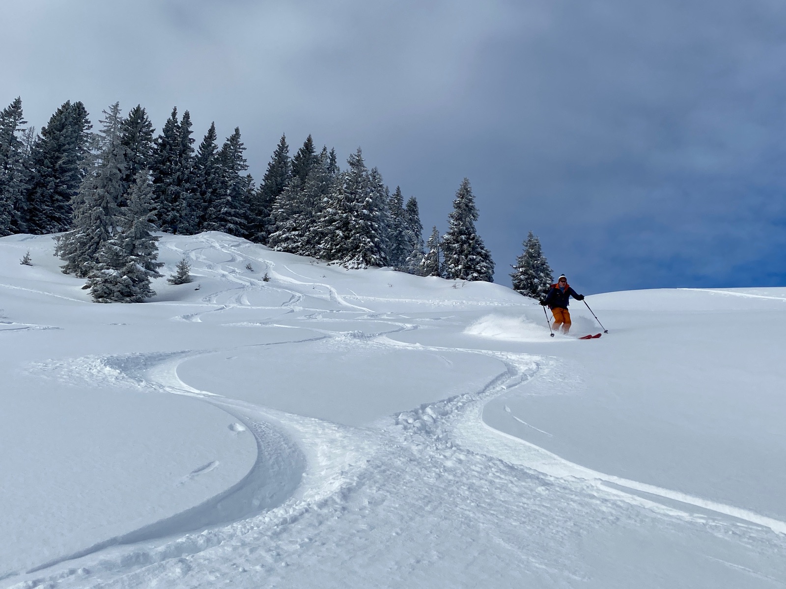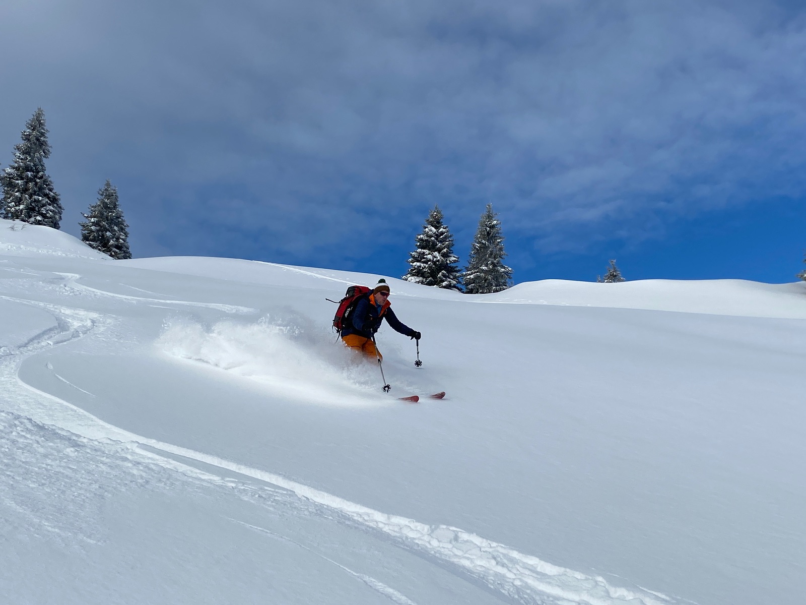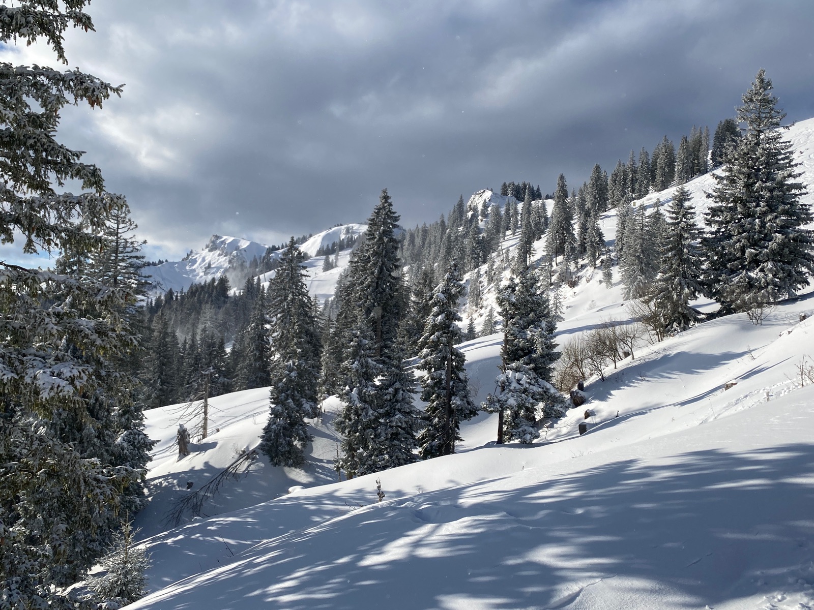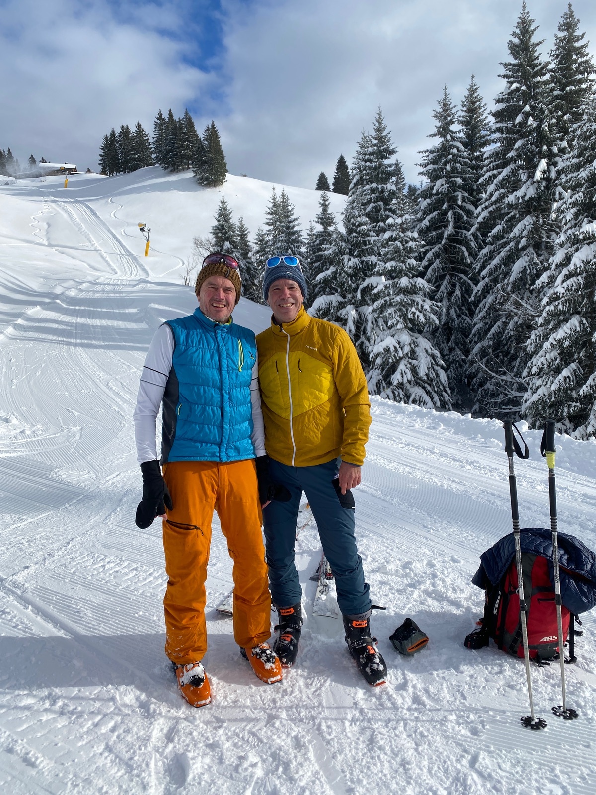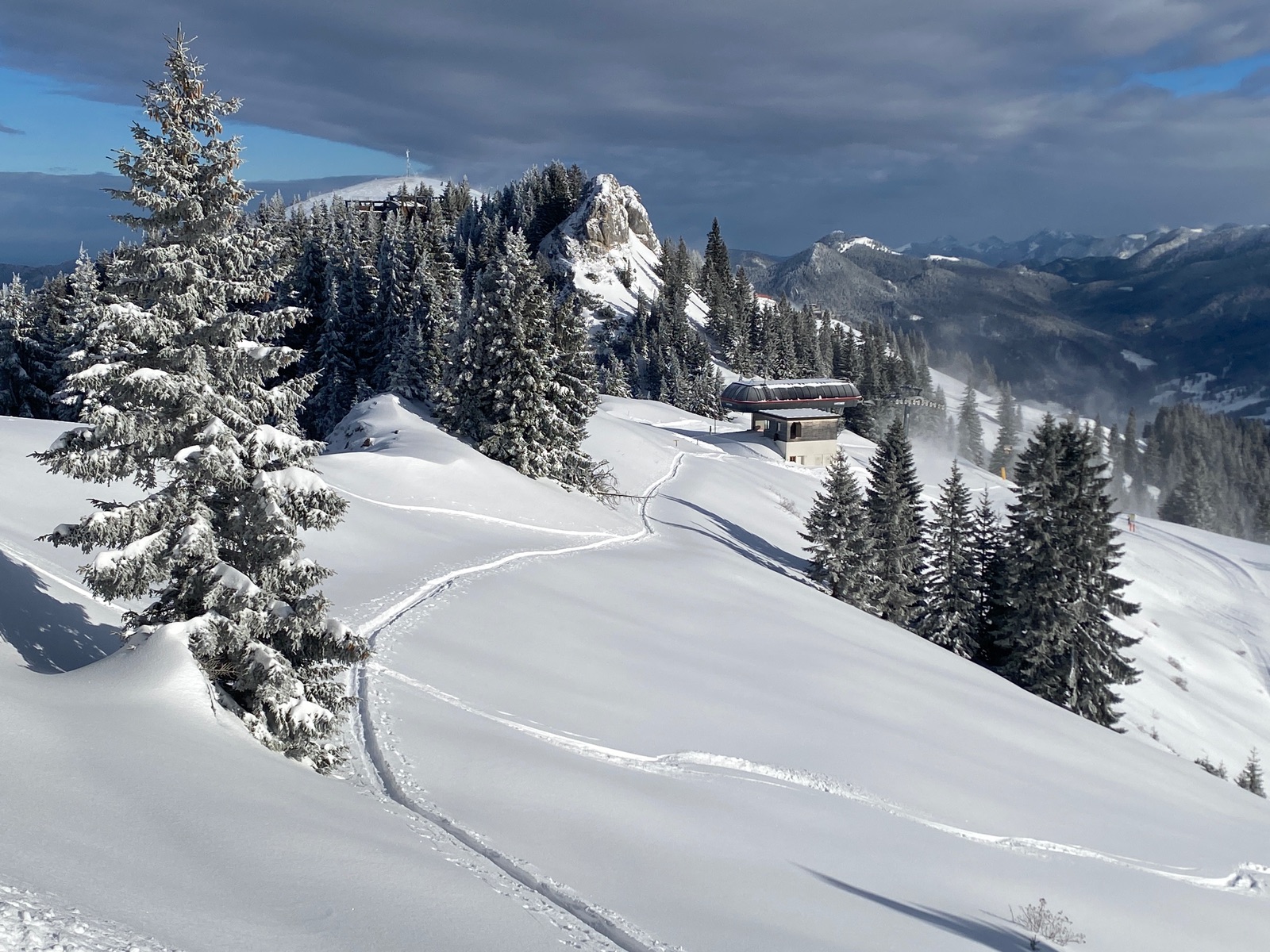 Mittlerweile feuern die Schneekanonen aus allen Rohren, weshalb wir im Aufstieg die offizielle Tourengeherroute durch den Wald nahmen. Oben zog es uns dann nach links zum Stangeneck zwischen Schrödelstein und Latschenkopf - hier fanden wir teils noch unverspurte Hänge mit herrlichem Powder.