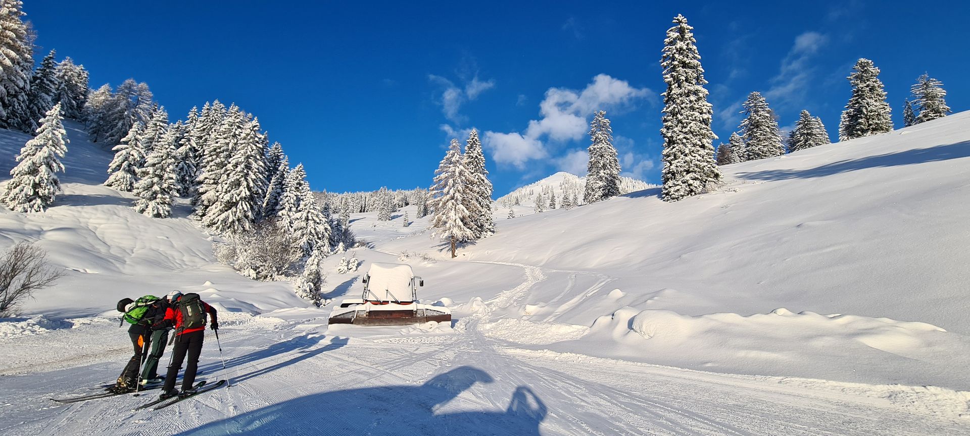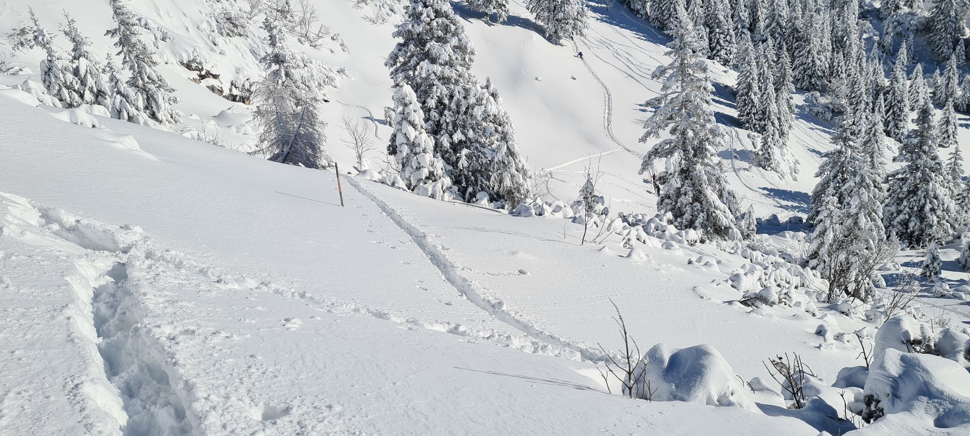 Gefahreneinschätzung: Auf der Normalroute, die übrigens am Morgen nur bis unter das Seewandköpfl gespurt war, unterhalb der Waldgrenze eher mäßige Gefahr: Keine Windzeichen, kein Durchbrechen, die Schneedecke wirkte hier sehr homogen und der Neuschnee hat sich gut mit dem Altschnee verbunden. Bei der Abfahrt in den Soinkessel fühlte sich der Schneedeckenaufbau anders, nicht so homogen an, aber ich habe nicht reingeschaut und es war mehr ein Gefühl.