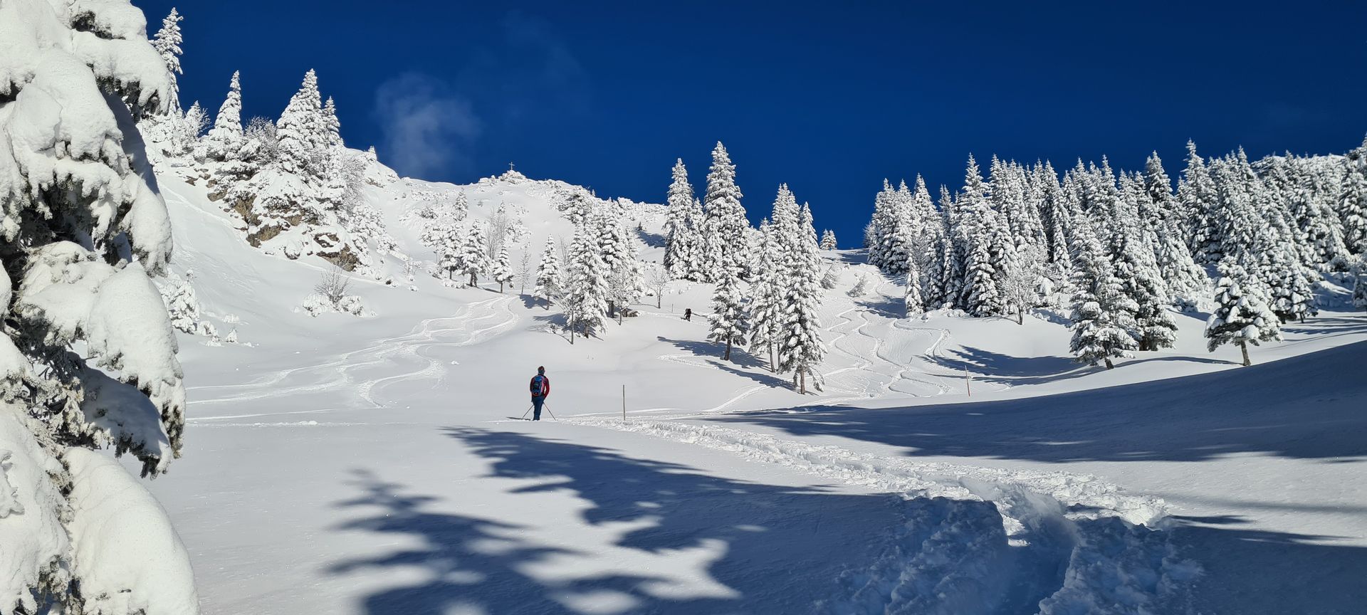 Frischer, in der Sonne glitzernder Neuschnee von mehr als ausreichender Menge. Es ist fast überall eine Unterlage vorhanden, nur im Mittelteil bin ich einmal durchgebrochen.