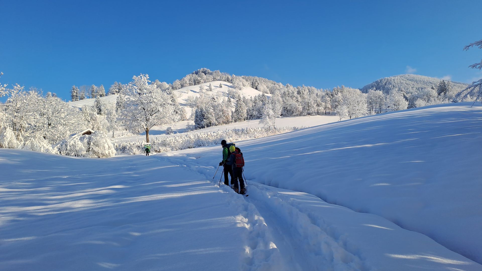 Beim Aufstieg war der Schnee pulvrig und manchmal fast grundlos. Man sollte nicht dem Sommerweg direkt folgen.... Traumhafter Ausblick am Gipfel. Es waren doch einige Tourengeher und Winterwanderer unterwegs.