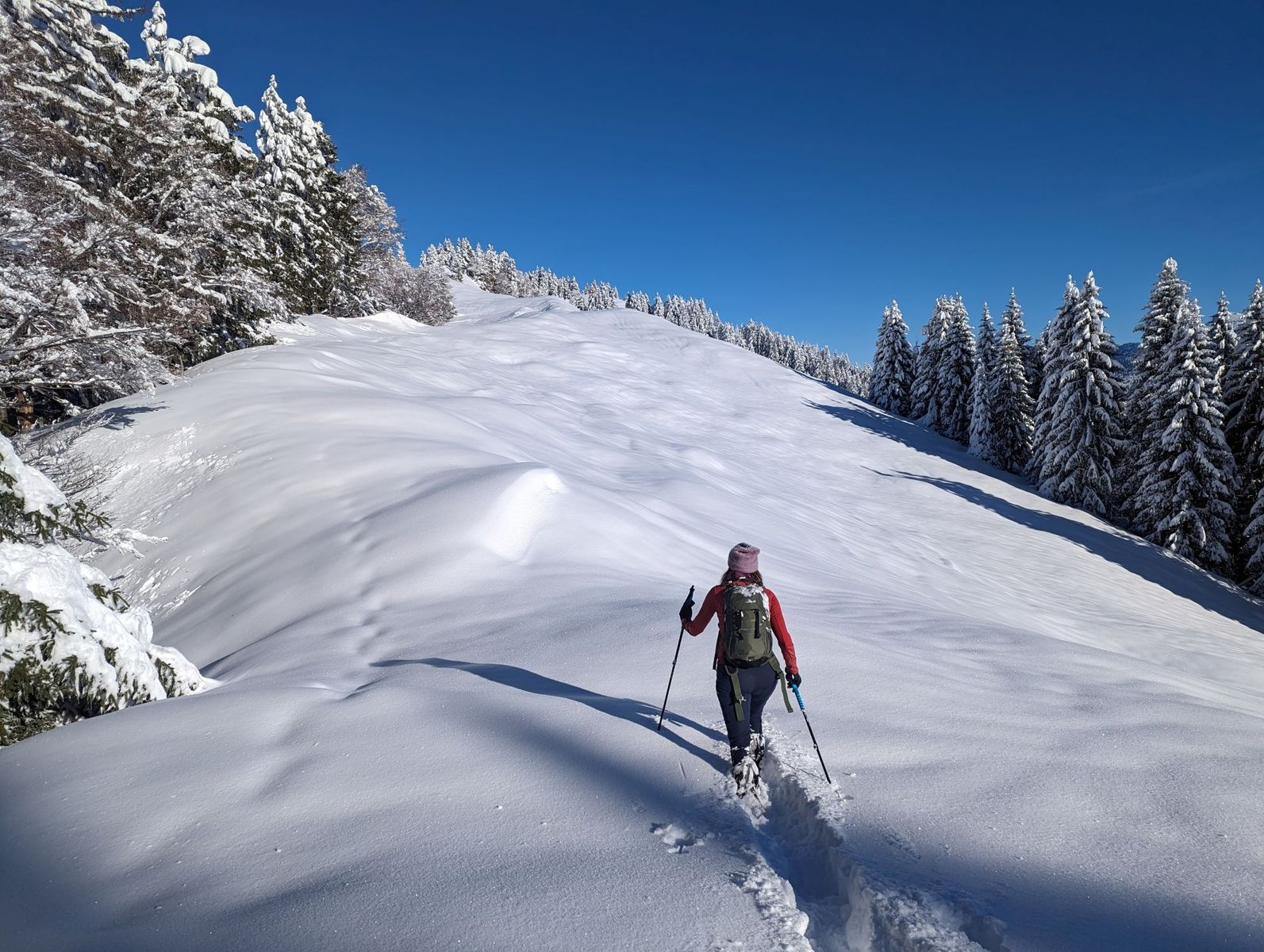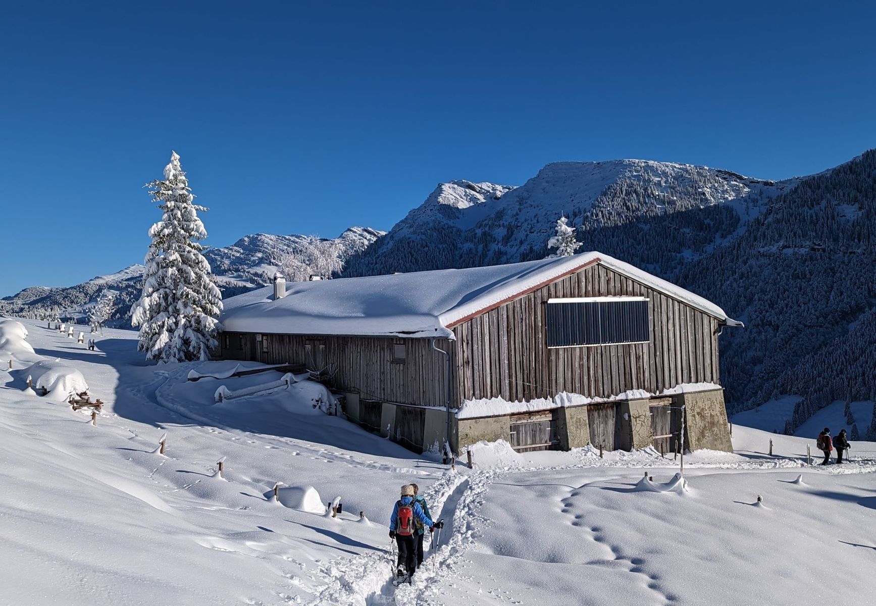 Bis zur Prodelalm hatte wohl der Besitzer am Vortrag gespurt. Ab der Alm dann anstrengende Spurarbeit im teils hüfthohen Tiefschnee. Wir kamen daher nicht ganz bis zum Gipfel. Wir waren ganz allein. Am gegenüberliegenden Hochgrat waren einige Skitourengeher*innen unterwegs.