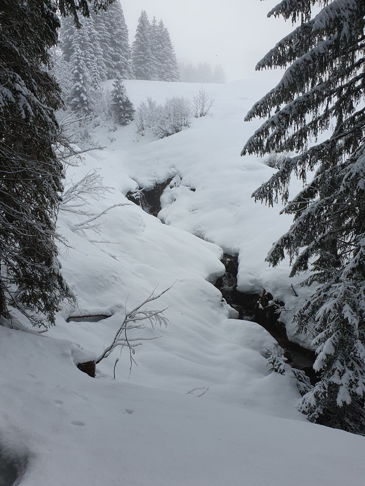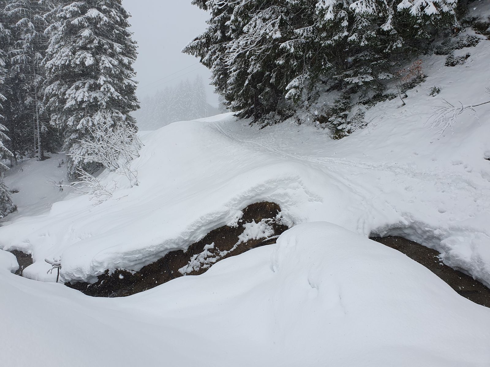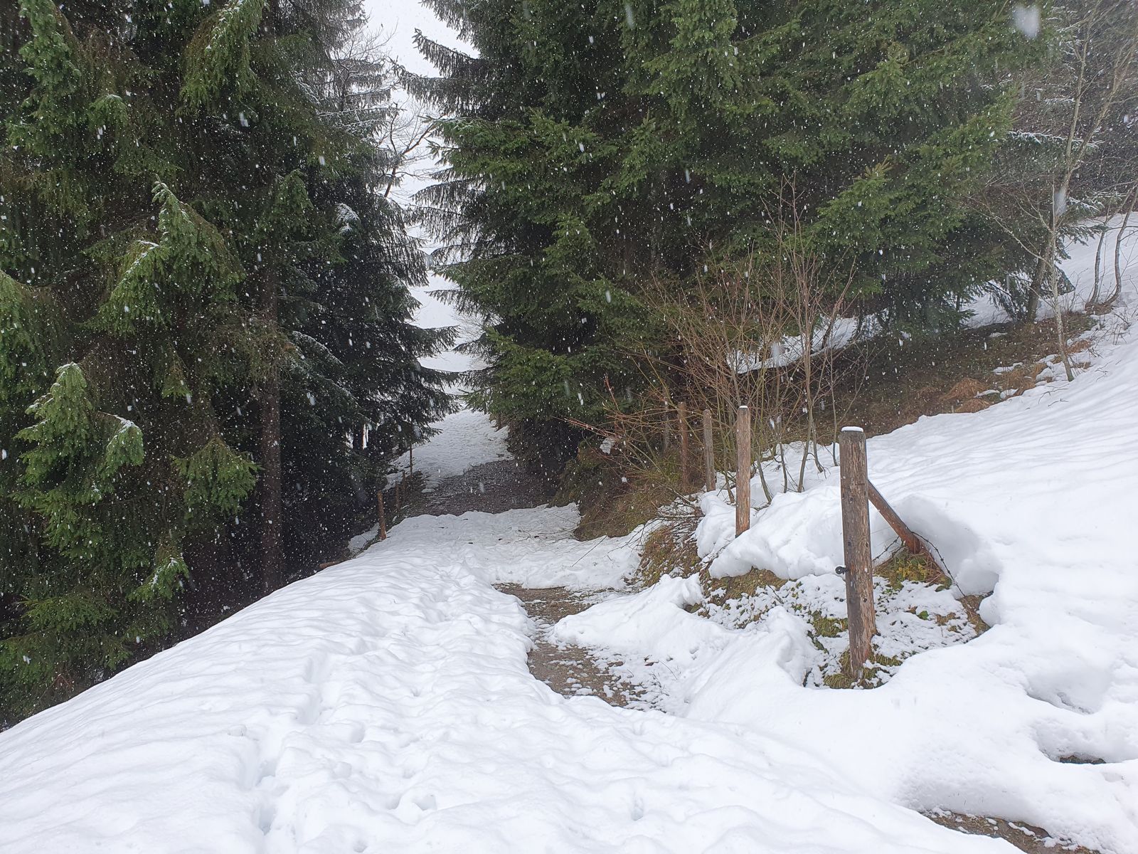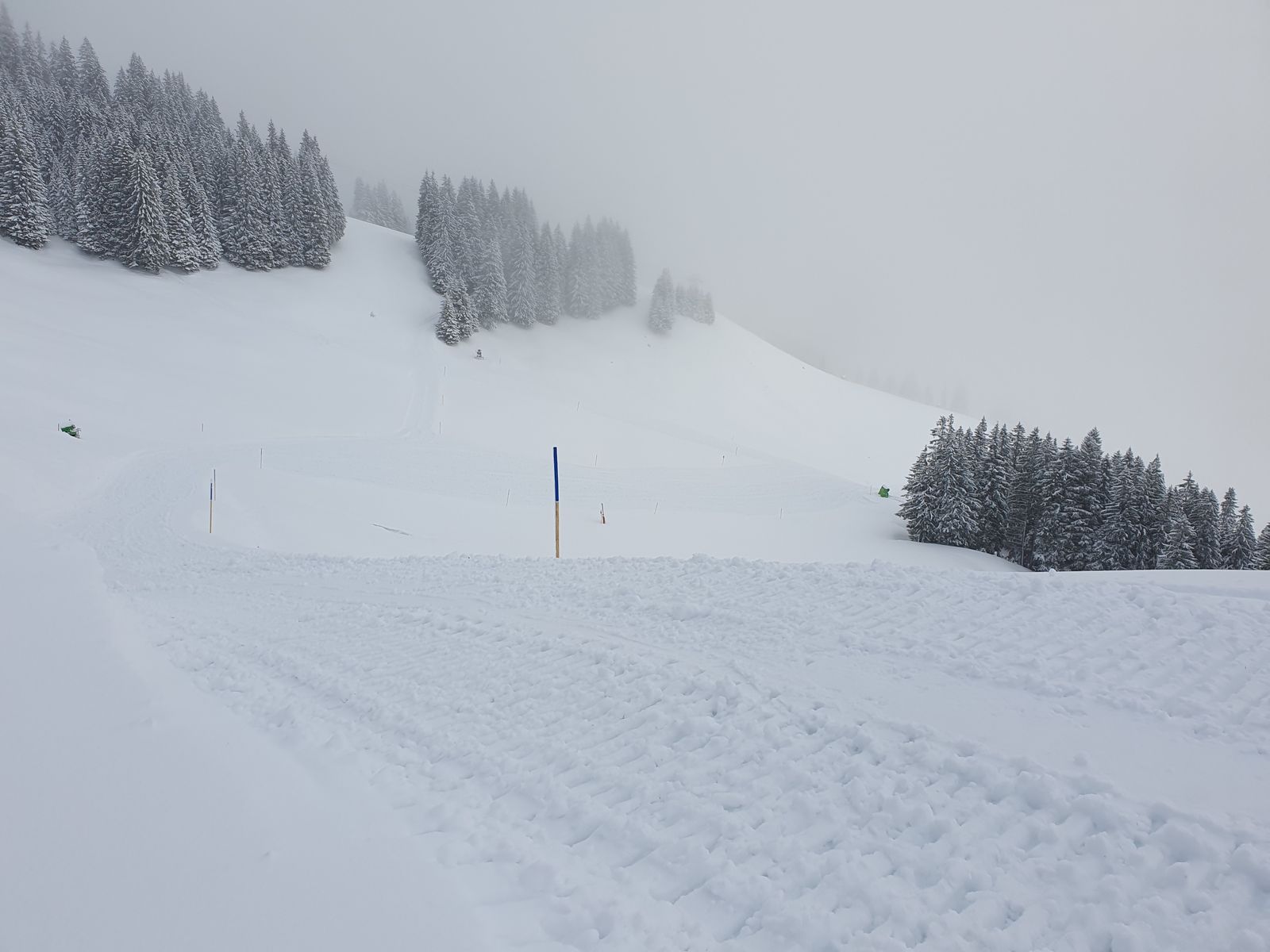 Abfahrt: über den steilen Hang, bergab rechts vom Lift am Waldrand entlang (wegen Sicht) und dann zur Mittelstation und über Piste / neben Piste runter zum Dorflift