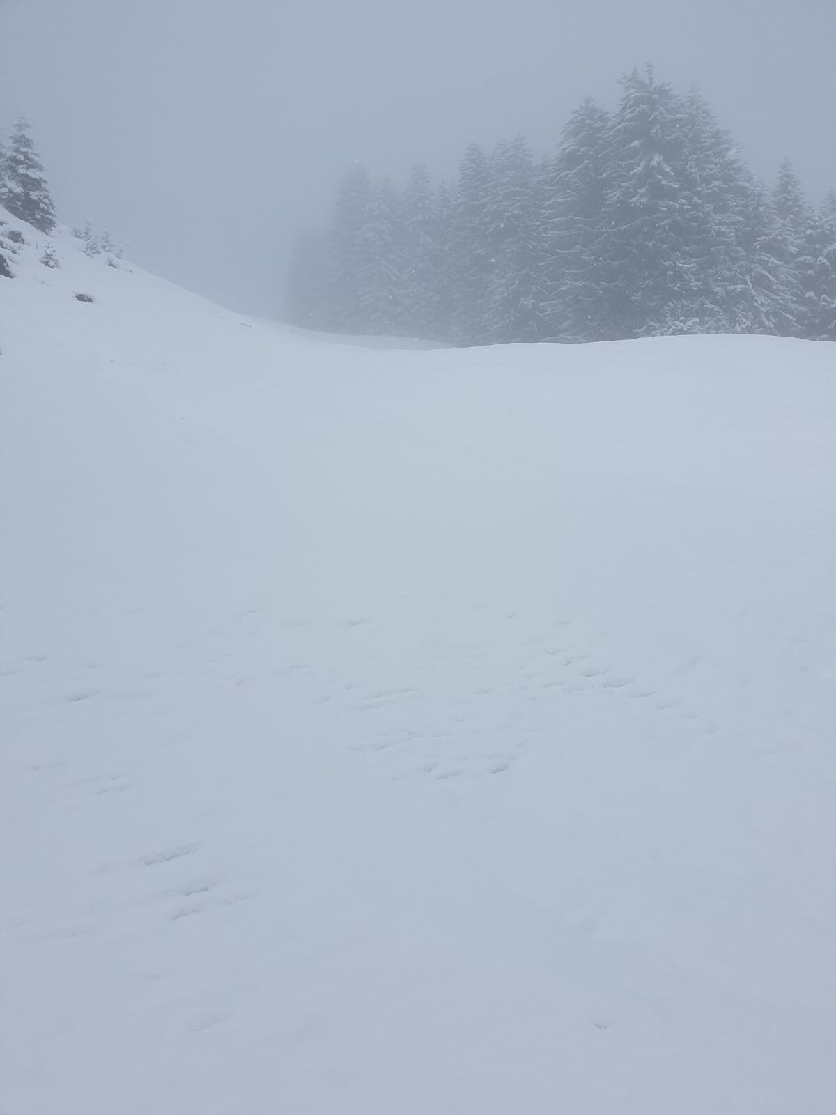Das größere Problem war aber white-out. Orientierung an Bäumen und später an wenigen Stangen. Ab Mittelstation war es besser, dann auch eine gute frische Linie, die ich als Orientierung nehmen konnte.