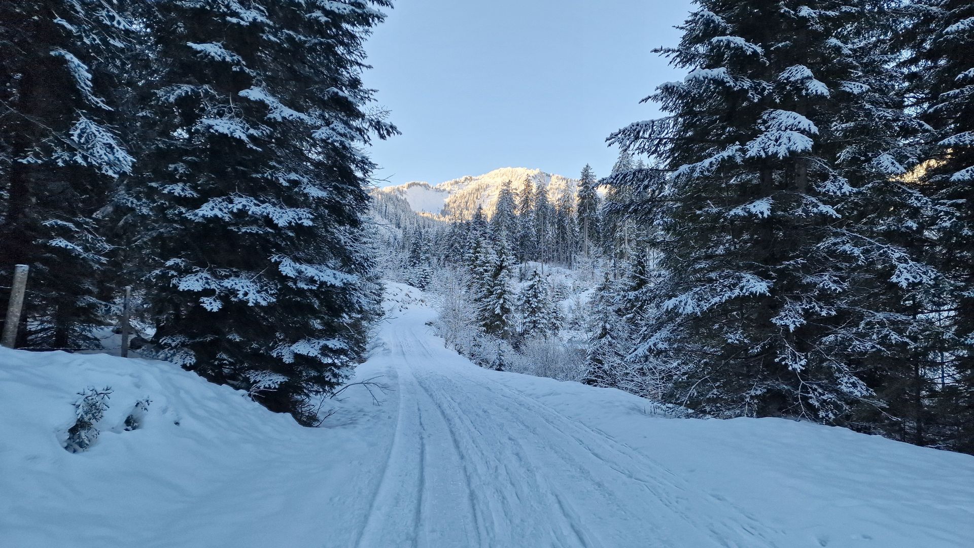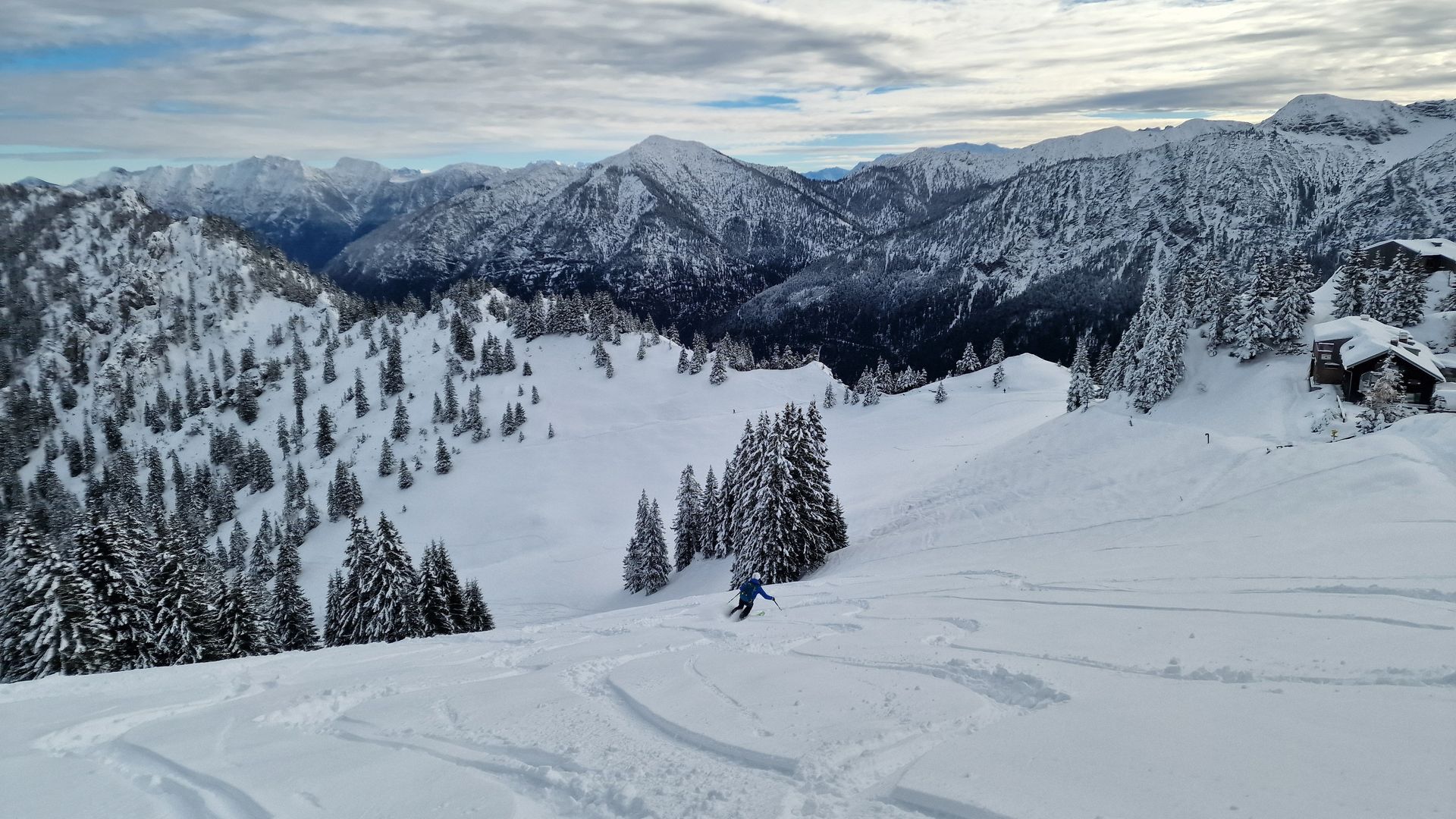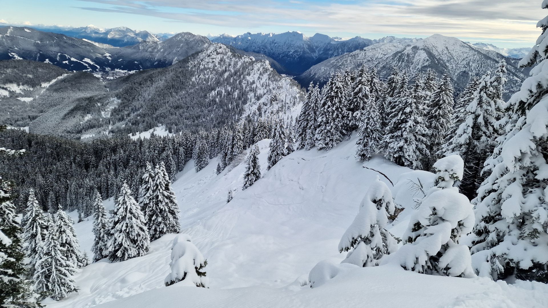 Für die Abfahrt haben wir nicht die übliche Route über den Kurztalgraben genommen, weil wir dort schon beim Aufstieg mehrere halb-eingeschneite Schneemäuler und Lawinenreste im oberen Teil gesehen haben, die wenig vertrauenerweckend waren. Andere Leute sind dort abgefahren, uns war es nicht so geheuer. Wir sind also durch den Wald bis kurz vor dem Pürschlinghaus abgefahren/abgestiegen (Ski dort kein Vorteil). Dann nach links abgefahren über den breiten, noch fast unverspurten Hang mit Pulverschnee (super!) in den Plattenberggraben. Auch danach mehrere schöne fast unverspurte Hänge. Kurz nach der Langenthalalm hatte die Forststraße leider längere apere Stellen, wo man abschnallen musste. Weiter unten kommt man wieder auf die Aufstiegsforststraße, dort flott auf hartem Schnee fast bis zum Auto.