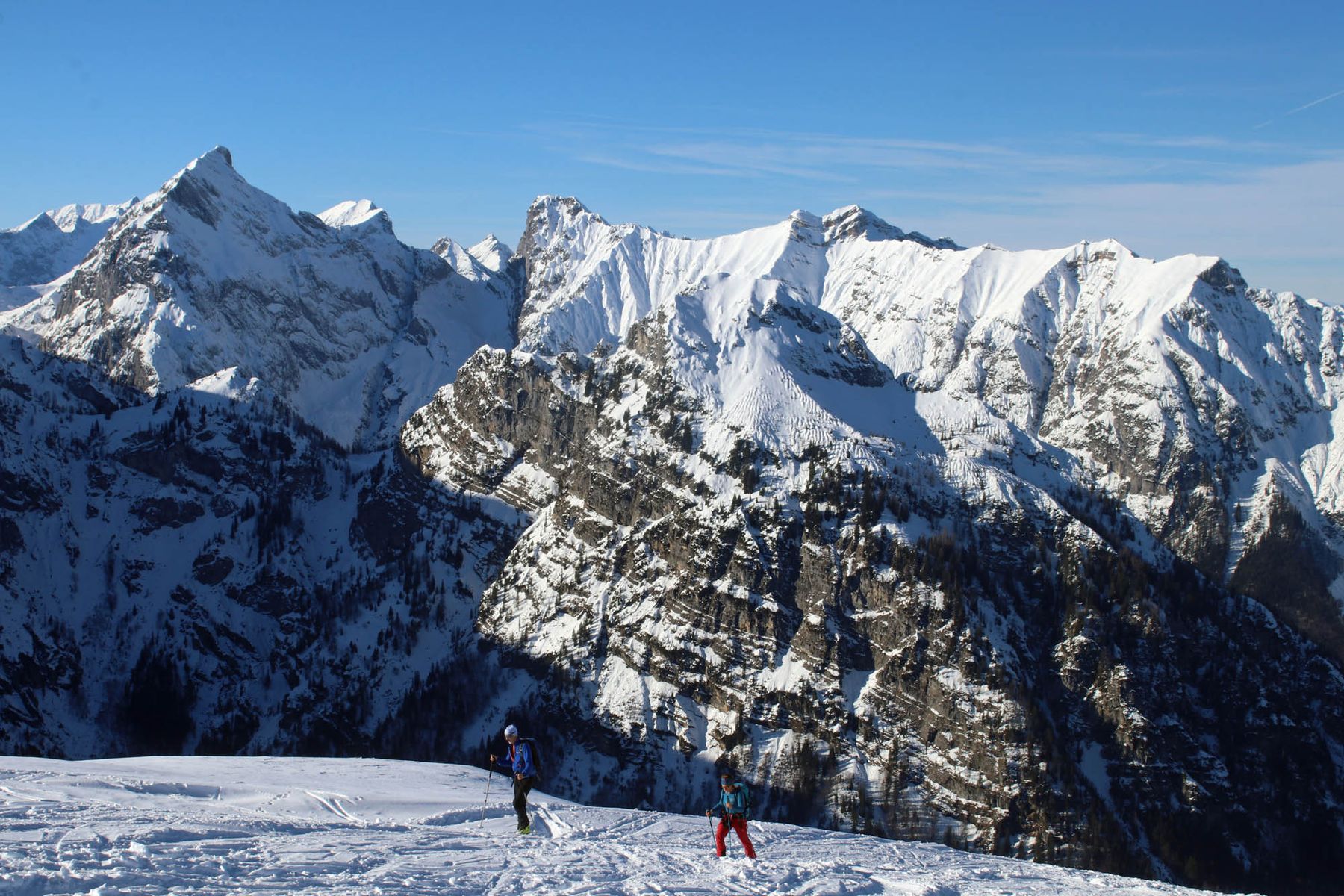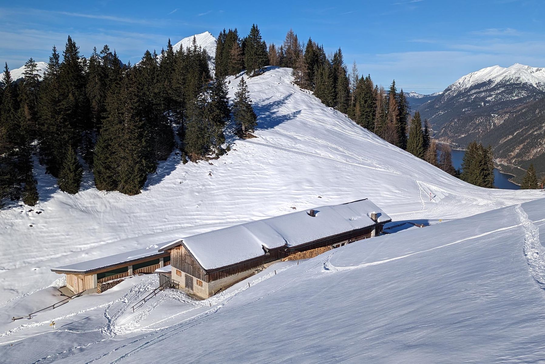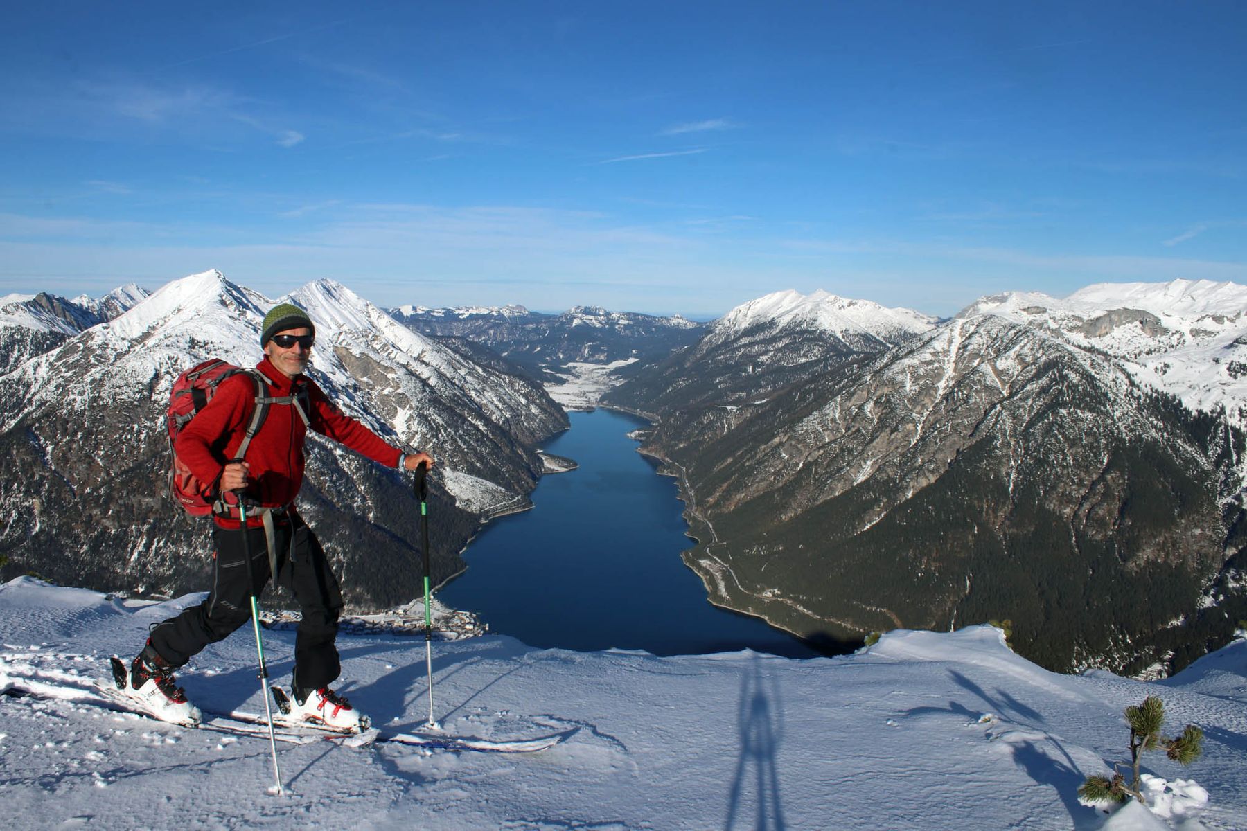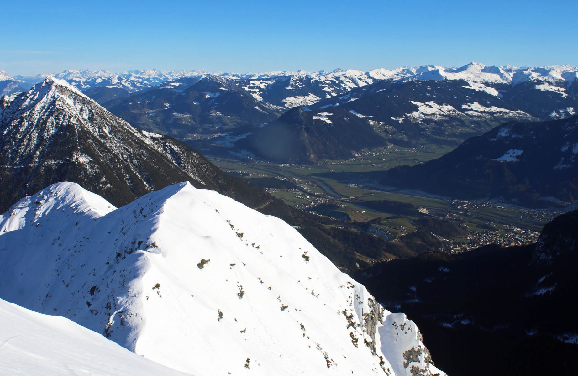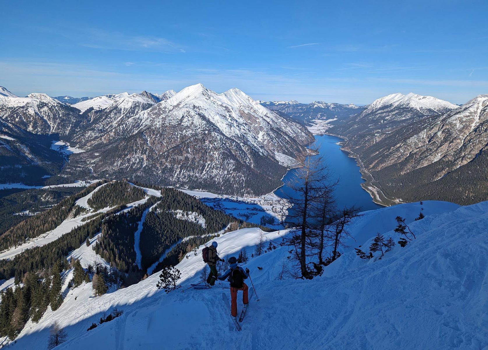 Zudem ist die Tour skifahrerisch sehr lohnend! Am recht steilen Gipfelhang gab´s sogar heute noch (Dank der Westexposition) brauchbaren Powder. Die untere Hälfte, die auf einer rasanten Naturschnee-Piste erfolgt, war zwar recht hart aber griffig. Vom Start weg liegt ausreichend Schnee. Rund um den Achensee dürften die meisten Skiouren derzeit gut möglich sein.