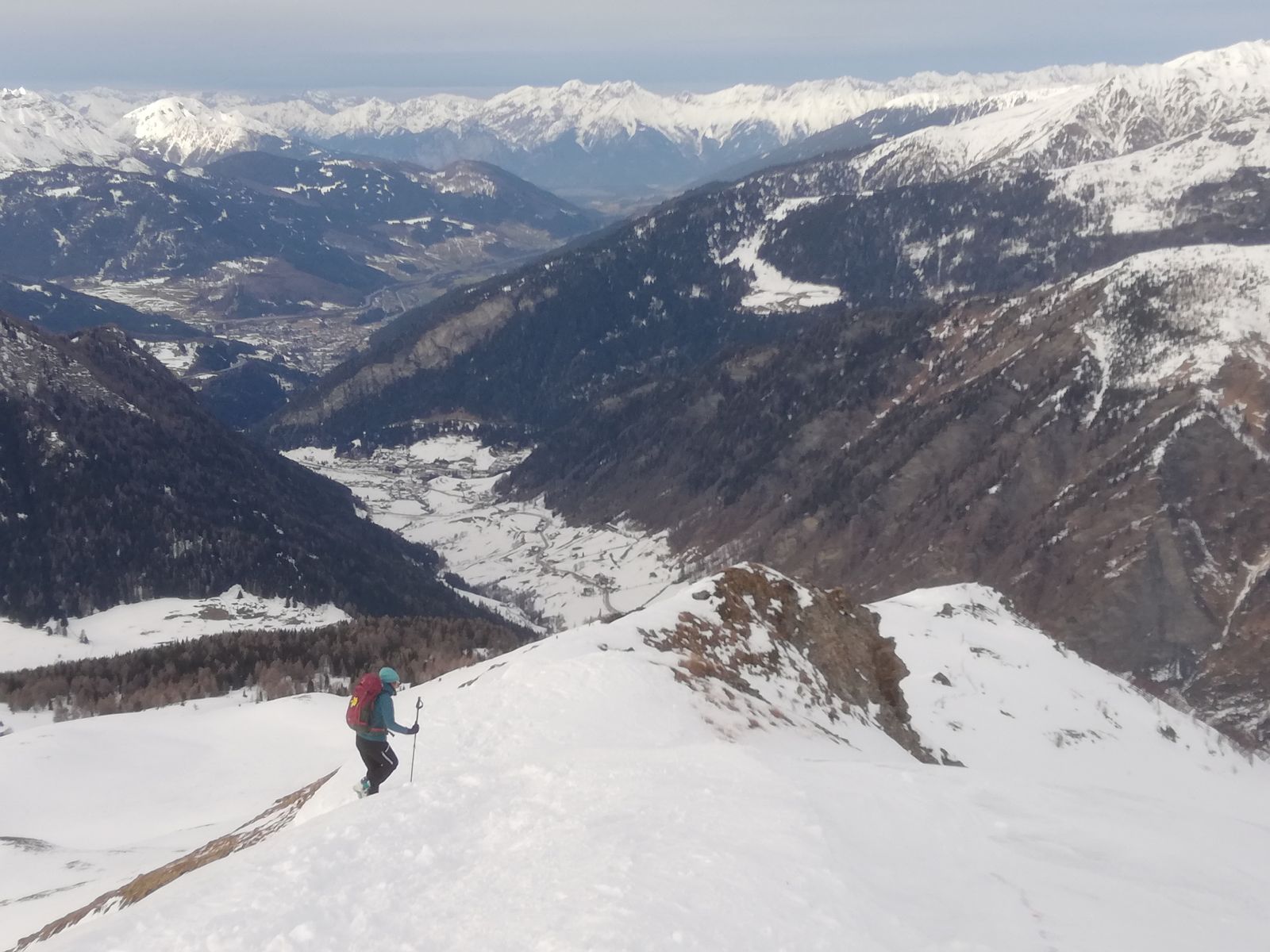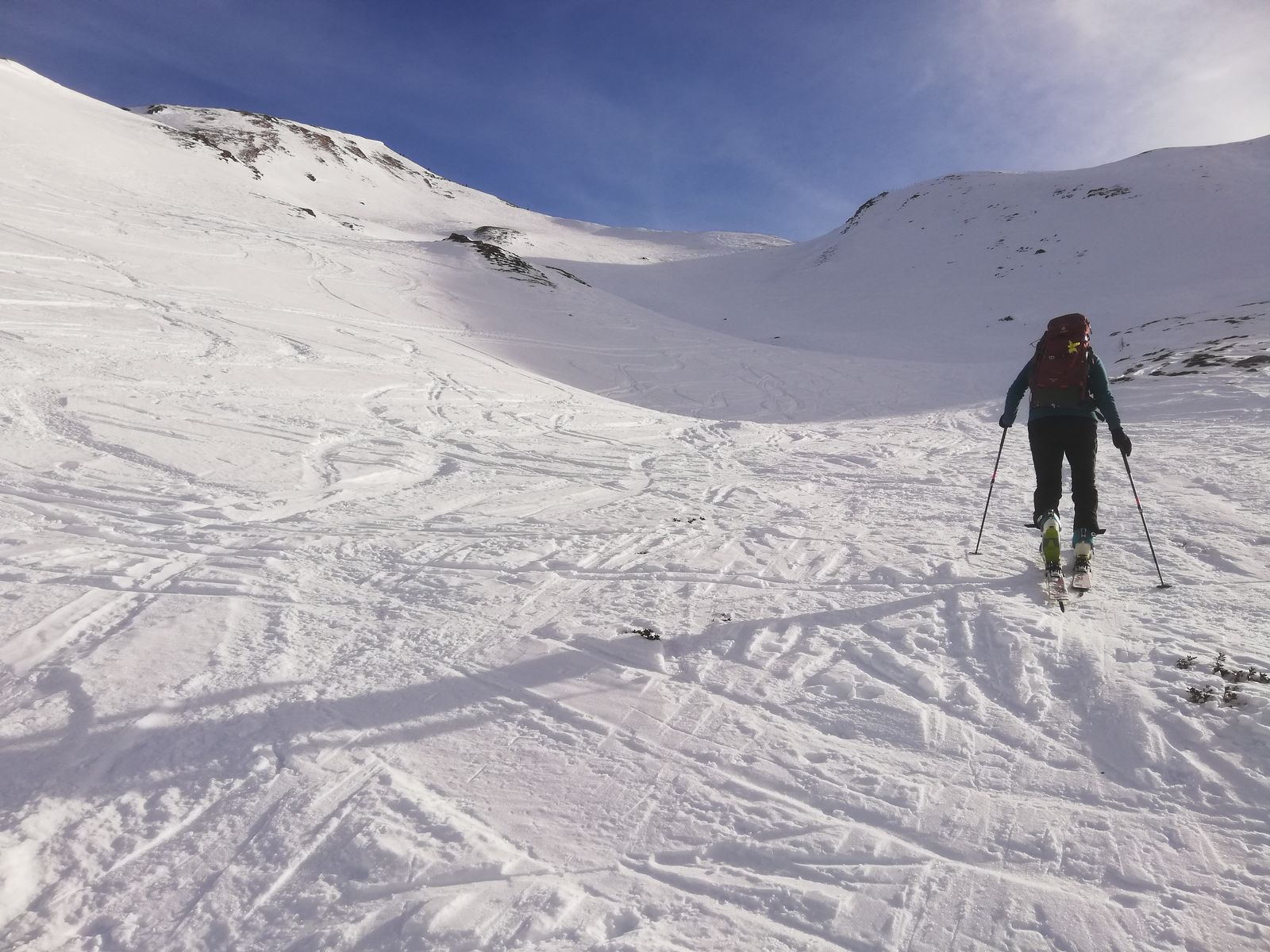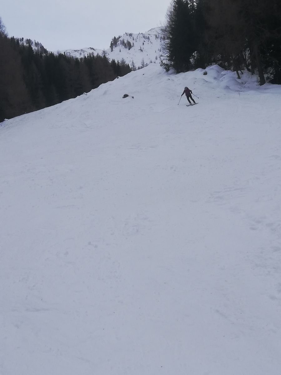 Im Anstieg Harsch Eisen angenehm, aber nicht zwingend. Die ganze Abfahrt ist pistenmäßig ausgefahren, heute meist griffiger Harsch, in der Waldschneise harte, stellenweise eisige Buckelpiste.