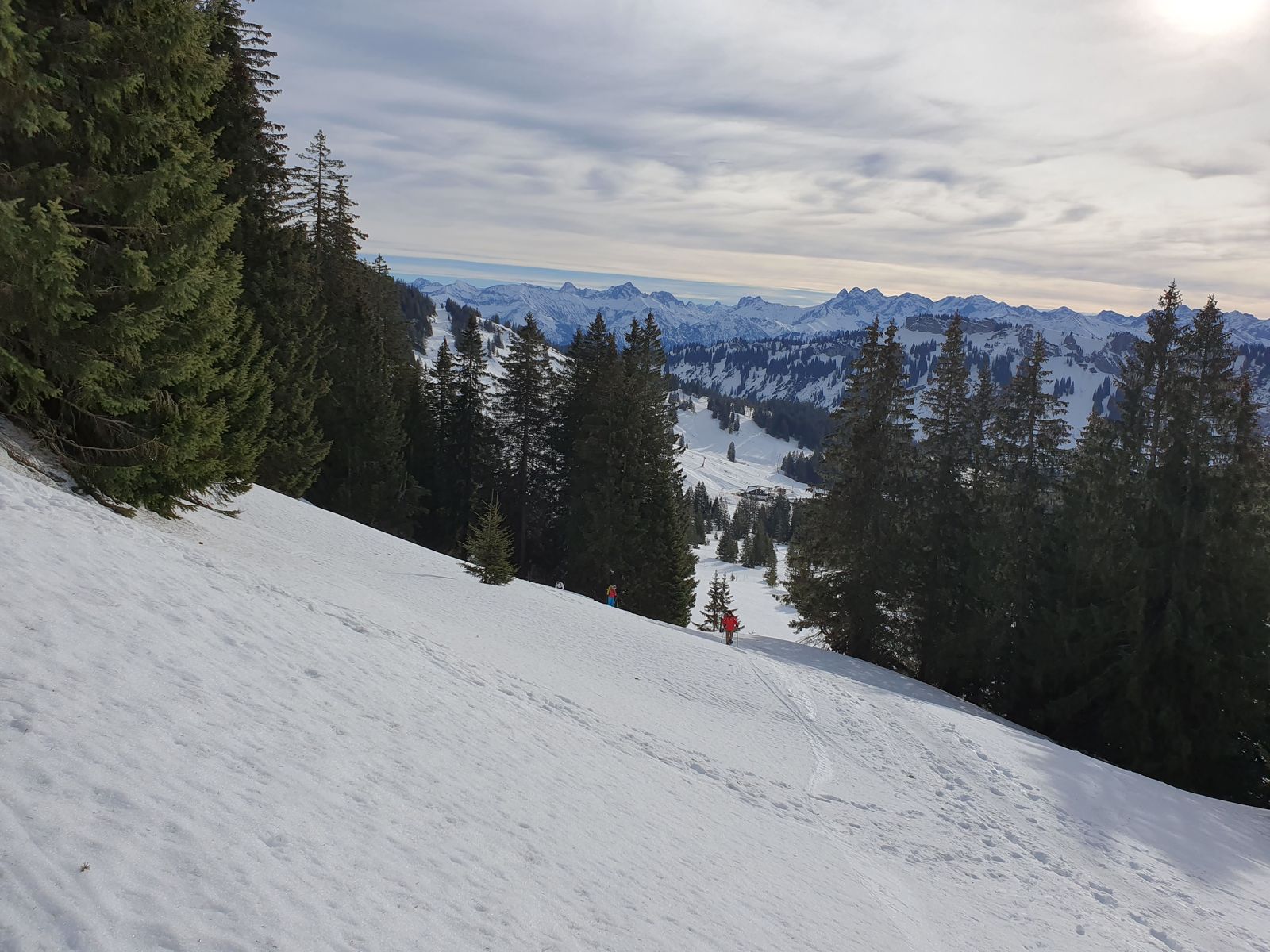 Abfahrt über linken Bergrücken (aus Talsicht) Richtung rote Piste (Schlepplift) und dann zur Talstation. Danach noch zum Bolgen über Piste hoch und runter.
