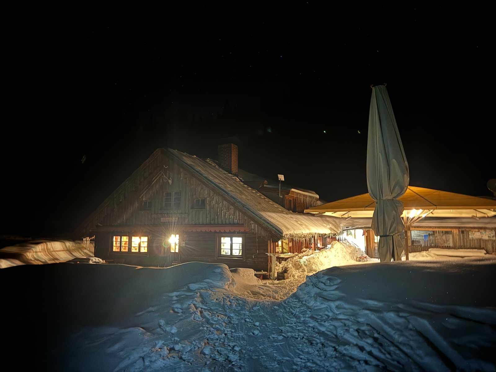 Aufstieg um 18.30 auf der offiziellen Nachtskitour Route (alte Piste / Lochgraben). An der Bergstation rechts runter zur Oberen Maxlraineralm. Tolle Einkehr, relativ wenig los:), Die vielen Stirnlampen sind wohl alle ins Taubensteinhaus. Aufstiegsroute mit genug Schnee, komplett eingefahrene Tourenpiste, unten teils schon eisig. Insgesamt aber solide Bedingungen. Dank eines glücklichen Zufalls Abfahrt über die Maxlrainer Skipiste mit Sondershuttle ab der gesalzenen Teerstraße zum PP!!