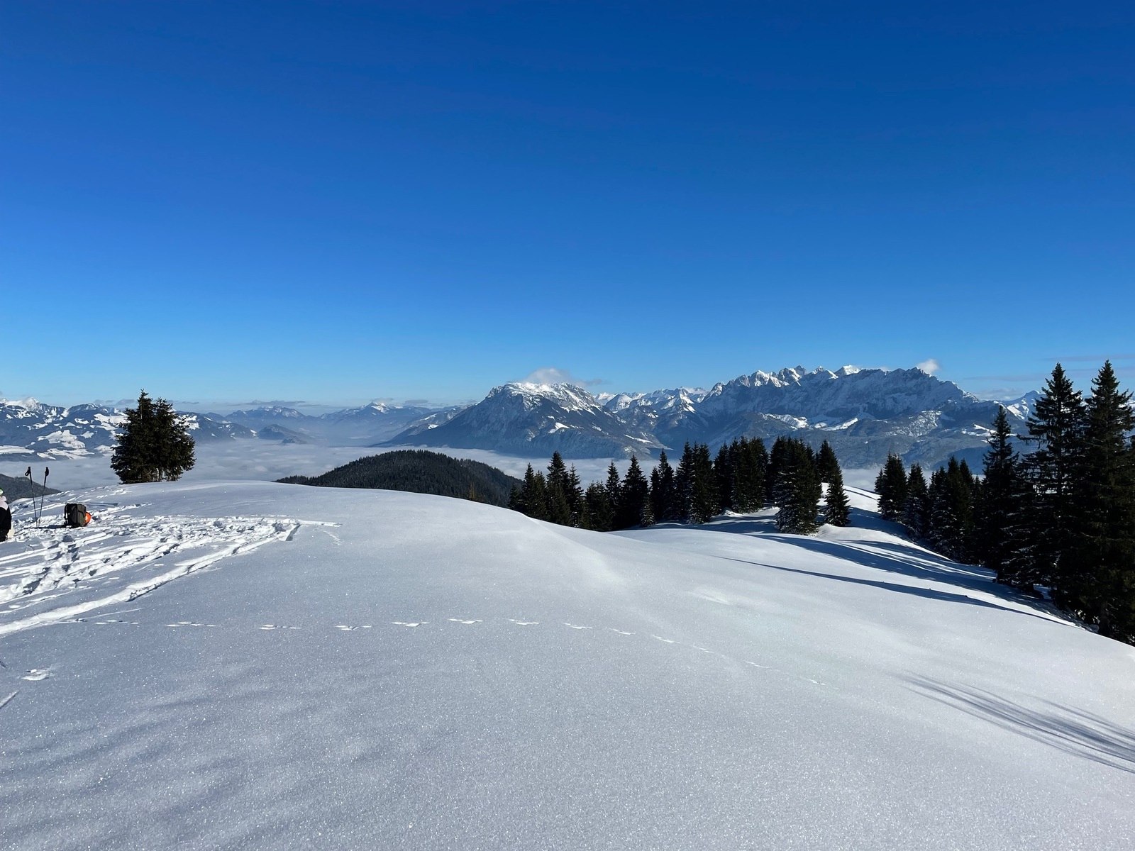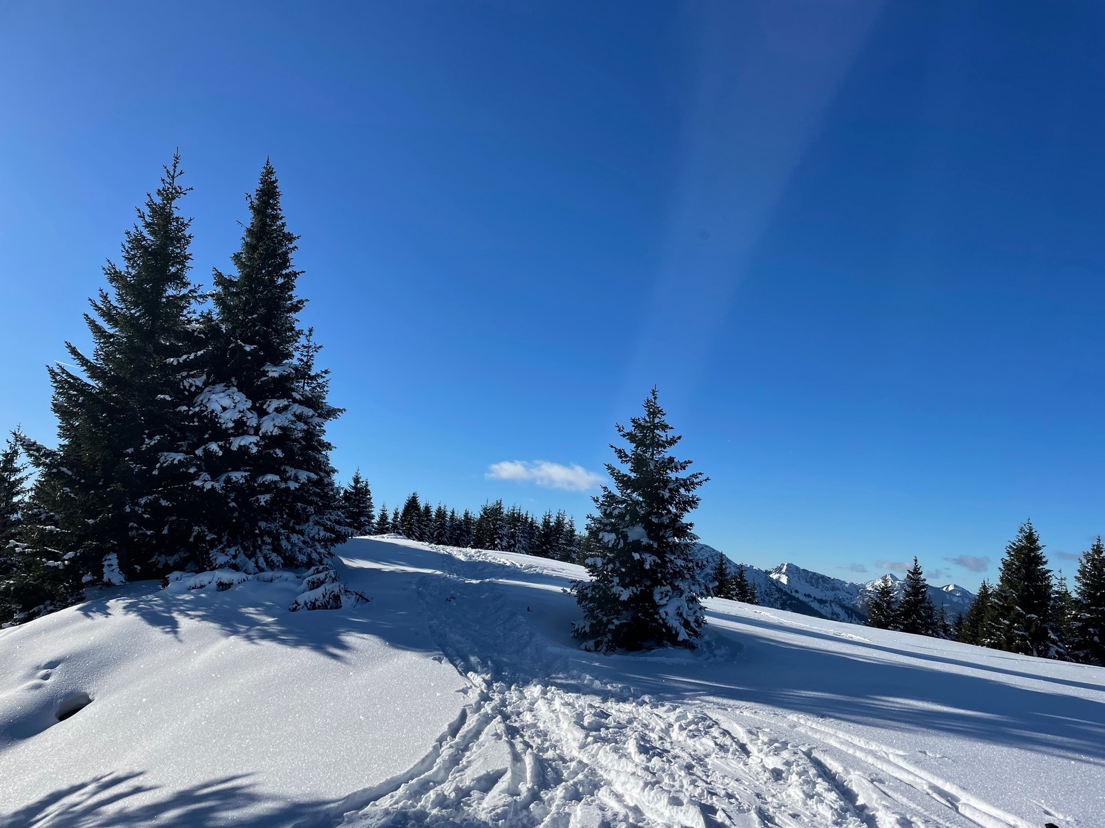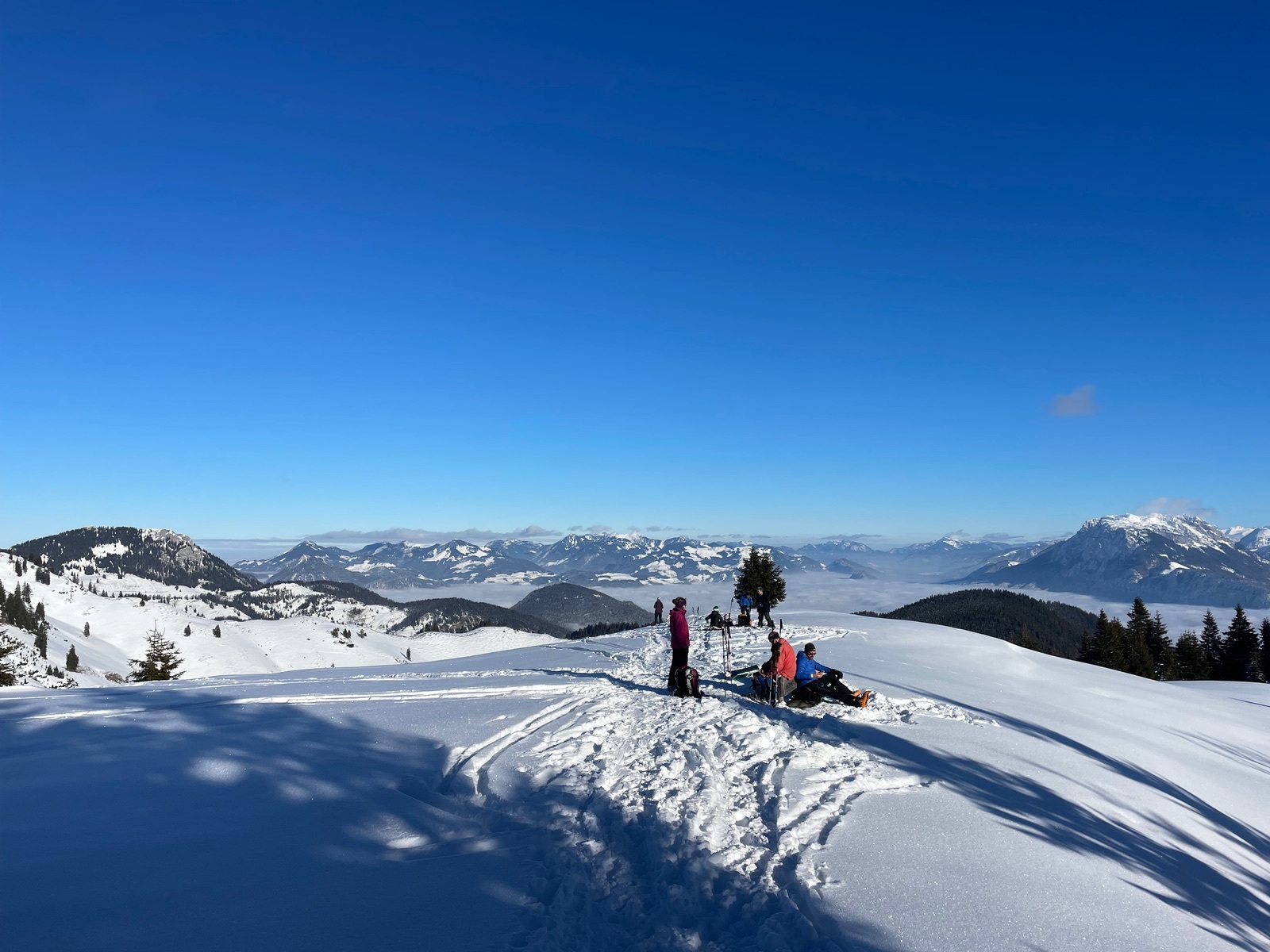 Heute ging’s vom PP Mariandlalm auf den Semmelkopf (neben Trainsjoch) im Bayrisch/ Tiroler Grenzgebiet. Die Forststraße/Rodelbahn im unteren Teil hat leider wenig Schnee. Aufstieg OK bei der Abfahrt haben wir abgeschnallt um das Material zu schonen (sehr steinig). Weiter oben ging’s dann besser aber allgemein weniger Schnee wie z.B. am Spitzing. Deutlich besser der Gipfelhang zum Semmelkopf. Oben bei dem Hammerwetter ein Traumpanorama nach Bayern und Tirol. Erster Abschnitt der Abfahrt feinster Pulver, dann heißt es bei den rasanten Querungen etwas aufpassen, aber trotzdem spaßig. Wenn es nicht schneit oder wärmer wird ist es aber schnell vorbei. Haben in der Abfahrt (wegen Hunger und Durst !!) nochmal aufgefellt und sind auf der Forststraße/Rodelpiste hoch zur Mariandlalm. Schöne Einkehr und dann auf der Rodelpiste runter bis wir aus Materialgründen abgeschnallt habe. Fazit: wegen des Traumwetters sehr schöne Tour die aber wegen der geringen Schneeauflage bald nicht mehr zu empfehlen ist.