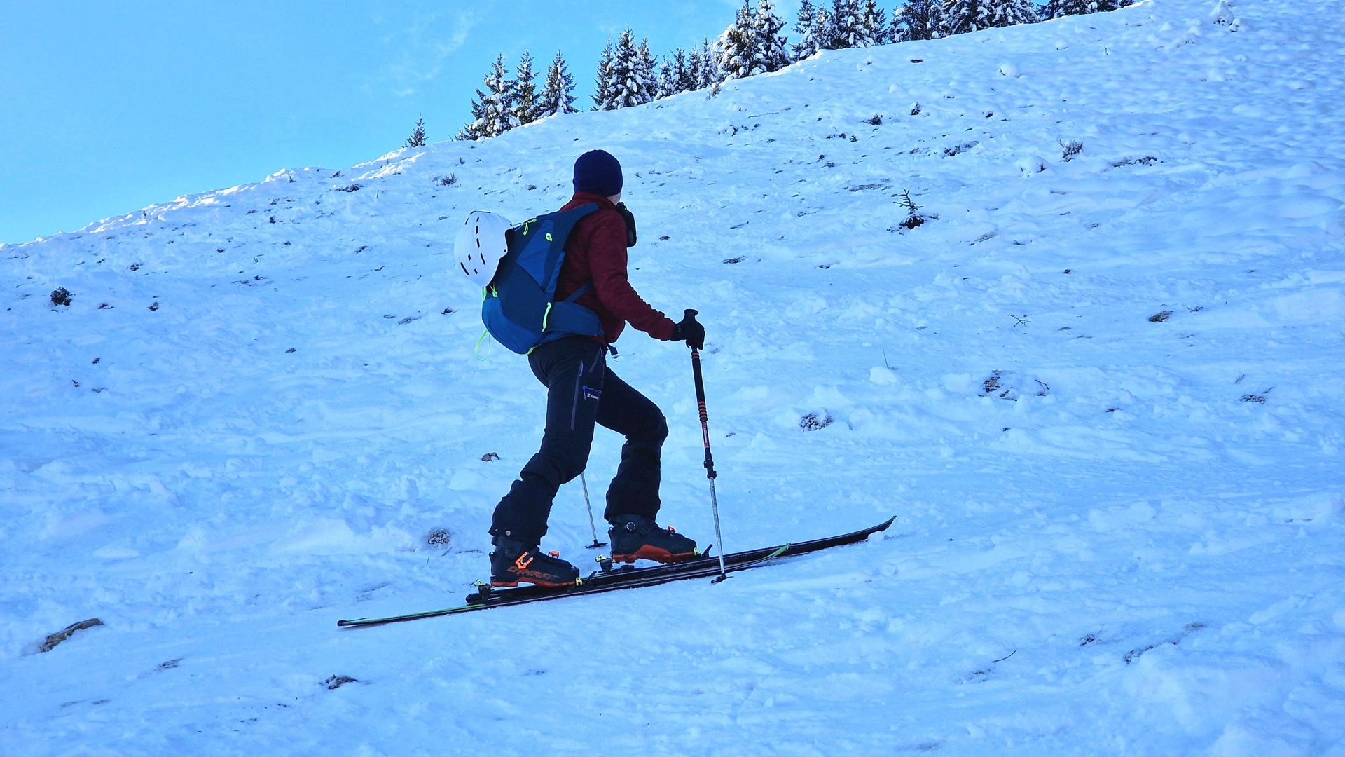 Ein anderer Tourengeher, der auf die Brünnsteinschanze gegangen war, hat uns später gesagt, dass beim Aufstieg zur Brünnsteinschanze Harscheisen notwendig sind (wegen Blankeis). Die Nordabfahrt vom Gipfel sei in Ordnung gewesen.