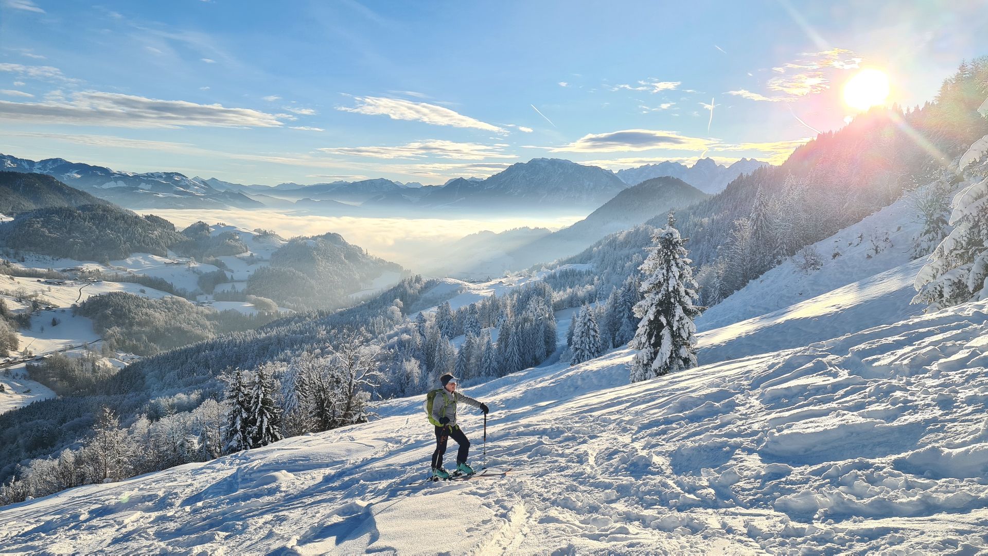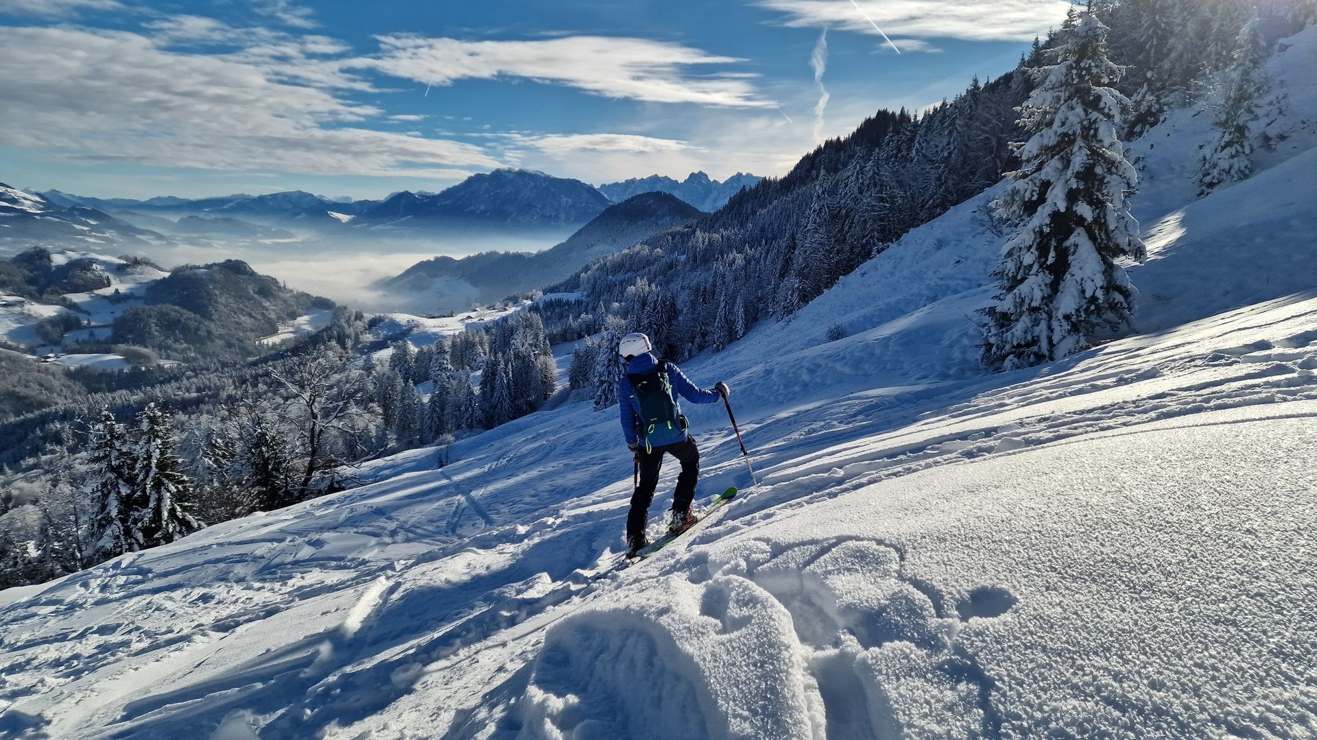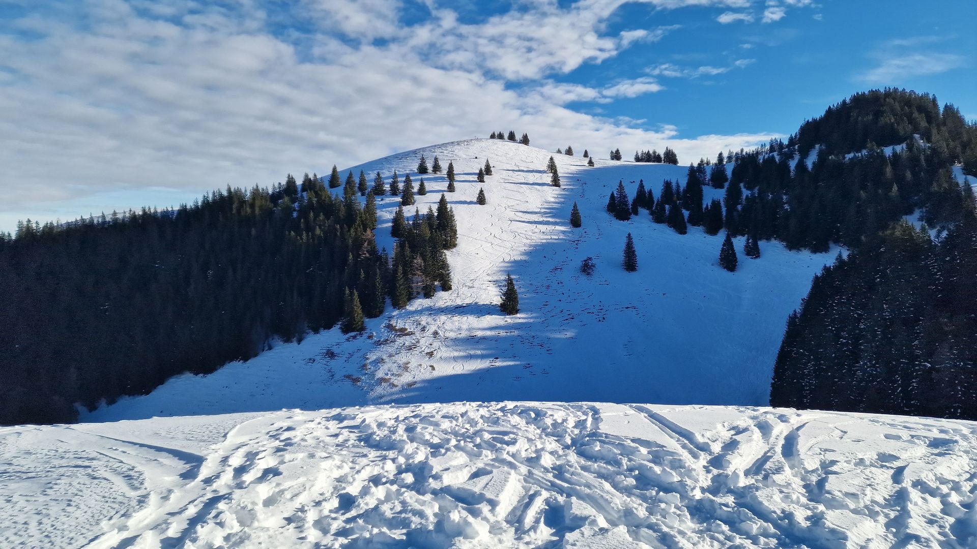 Geplant war heute eine kurze Vormittagstour auf die Brünnsteinschanze. Da sich aber schon beim Aufstieg gezeigt hat, dass das wohl abfahrtstechnisch kein Genuss wird, sind wir oberhalb der Seelacher Alm nach rechts anstatt nach links zur Brünnsteinschanze abgebogen.