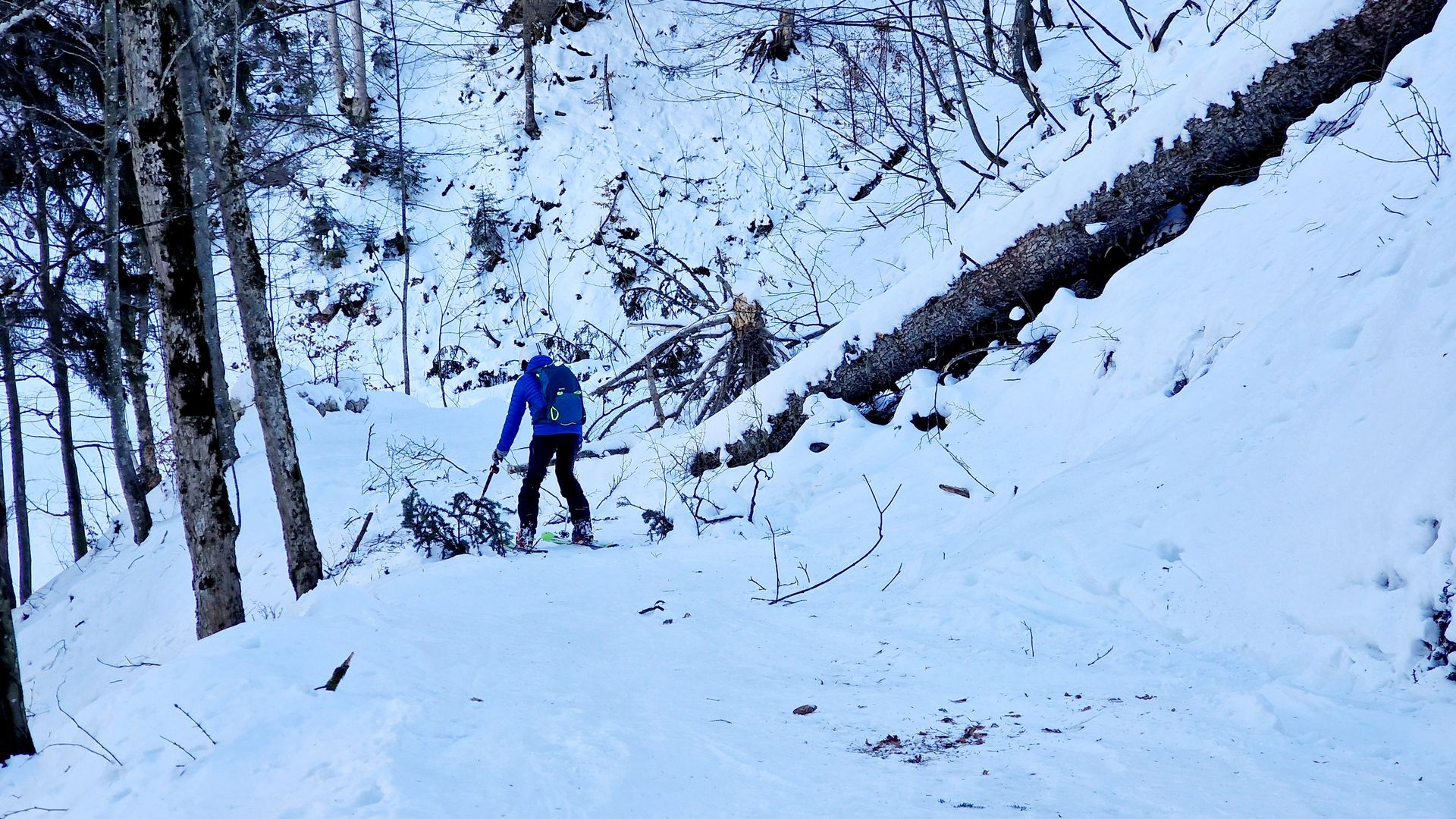 Man trifft weiter unten wieder auf die Forststraße, die im Aufstieg über die Hänge abgekürzt wird. Für die weitere Abfahrt sind wir nicht auf der Aufstiegsroute abgefahren, sondern haben den Abzweig auf Höhe 915 m nach links genommen. Diese Forststraße ist trotz zum Teil magerer Schneeauflage und einigen Hindernissen (umgestürzter Baum, ab und an Steine) für die Abfahrt deutlich skischonender. Ab 885 m geht es in einer engen Rechtskurve wieder zurück Richtung Aufstiegsroute.