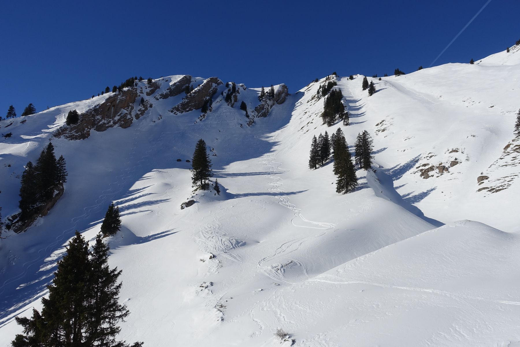 2-Tages Tour per Bahn und Taxi ins Allgäu. Start in Balderschwang (Bahnhof Fischen dann per Taxi oder man erwischt den Bus), von dort Aufstieg recht weicher Schnee südseitig auf den Heidenkopf, Abfahrt bei fantastischem nahezu unverspurtem Pulver zur Alpe Scheidwang, Aufstieg zum recht verblasenen Gipfel Hochgrat - brettlharte, windverpresste Abfahrt zum Staufnerhaus (nur wenige Höhenmeter)- Samstag bestes Wetter, tagsüber wenig Wind, Sonne - nur der Bodensee lag unter einer Wolkendecke. Nach Übernachtung am Sonntag wieder Aufstieg zum Hochgrat - dann stetige Abfahrten und Aufstiege über die nächsten Berge - Rindalphorn, Gündeleskopf, Buralpkopf, Sedererstuiben, Stuiben. Der Hüttenwirt hatte uns Pulver in den breiten Rinnen zugesagt - leider teilweise windverpresst Richtung Bruchharsch (über Nacht und am Sonntag hat der Wind start zugenommen) - trotzdem waren viele gute Schwünge dabei. Wir waren praktisch alleine auf Tour - bis auf ein paar Schneeshuhgeher und einen Skitourengeher. Die meisten Rinnen und Hänge haben Abfahrtsspuren - aber eben nicht an dem Wochenende. Die Tour geht im stetigen Abfahrt/Anstieg - 200-300hm rauf und runter. Die Abfahrten gehen durch herrliche meist ost ausgereichtete Rinnen bis zum letzen Gipfel dem Stuiben. Von da in einer letzten super Abfahrt über Alpe Gund, dann recht flach weiter zur Alpe Mittelberg (bewirtschaftet am Wochenende, urgemütlich, verkauft auch eigenen Käse) weiter über die Rodelbahn nach Immenstadt. Den letzten km vor Immenstadt mussten wir die Skier tragen (mehr Split als Schnee auf der Rodelbahn). Man landet praktisch 10min vom Bahnhof entfernt und steigt bequem in den nächsten Zug gen München.