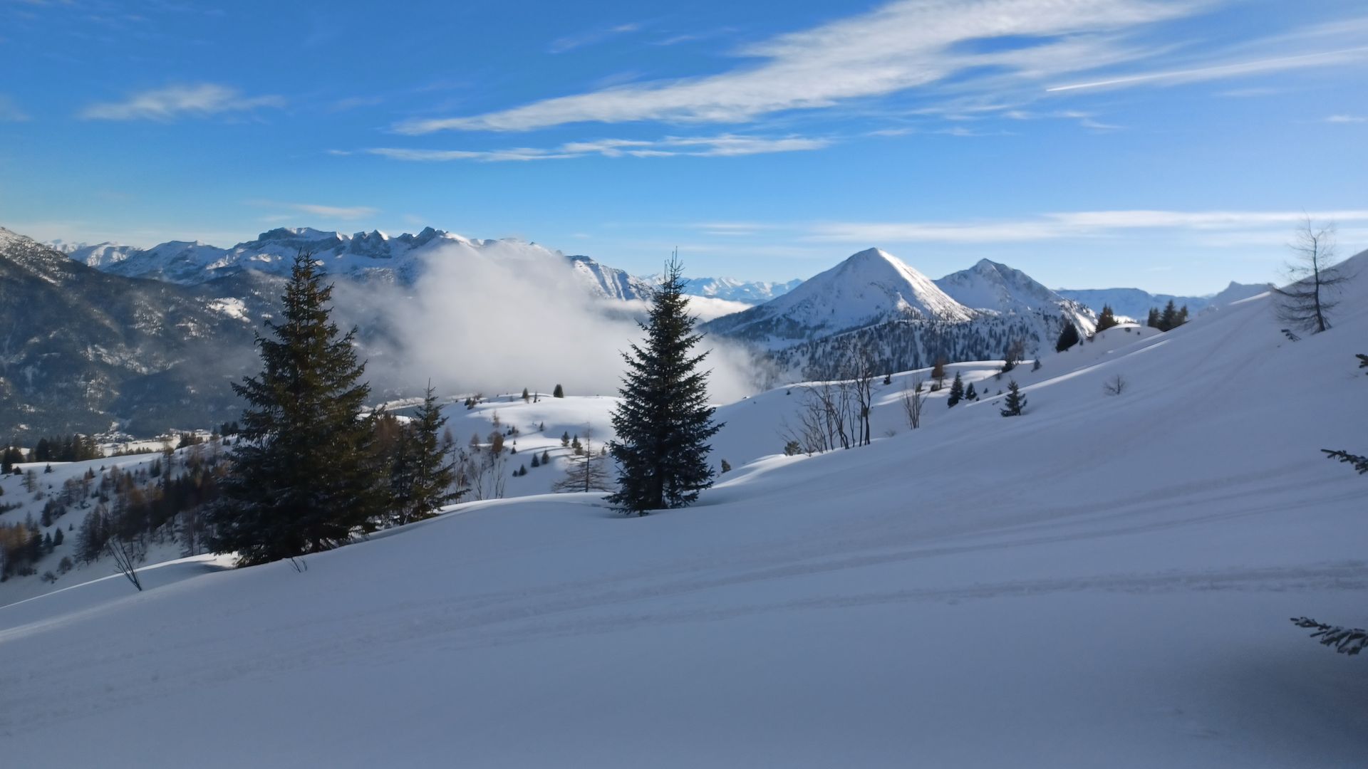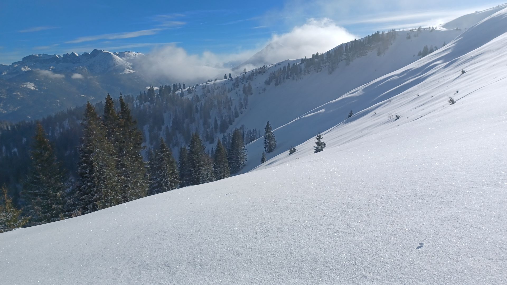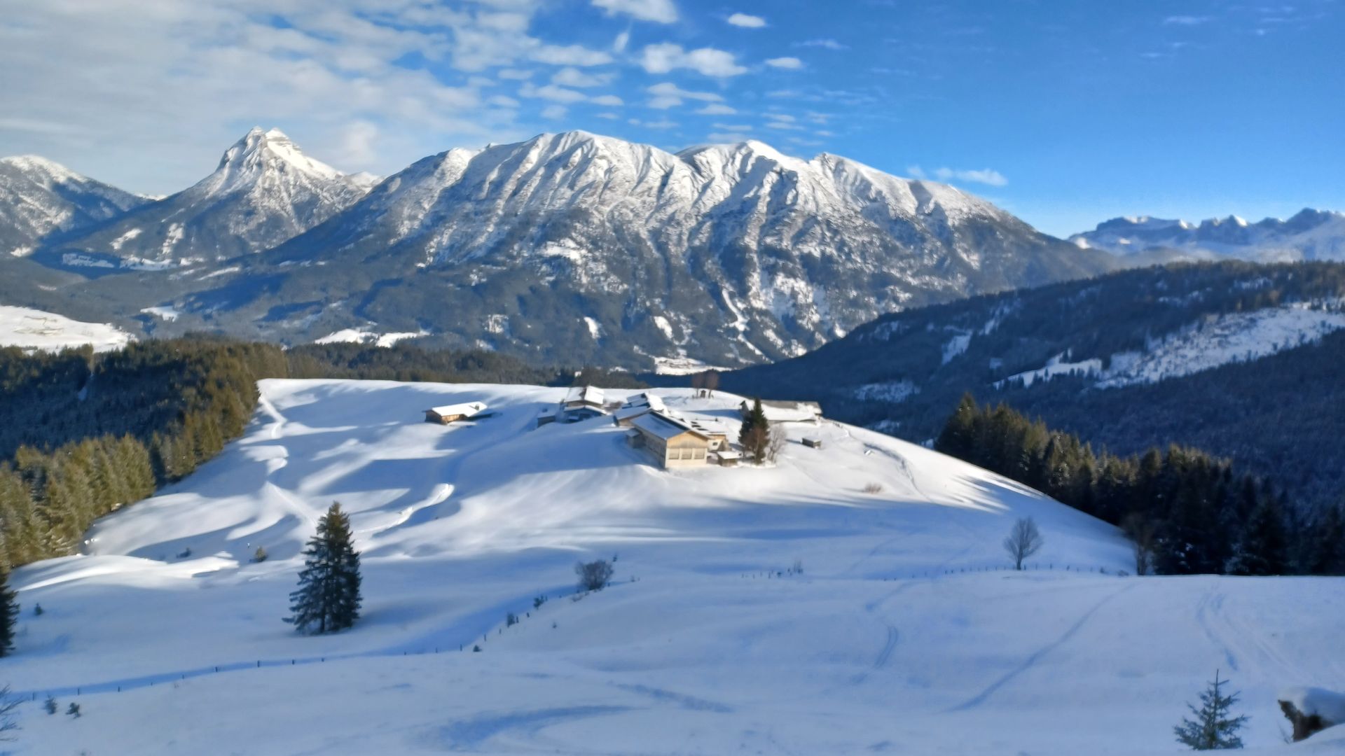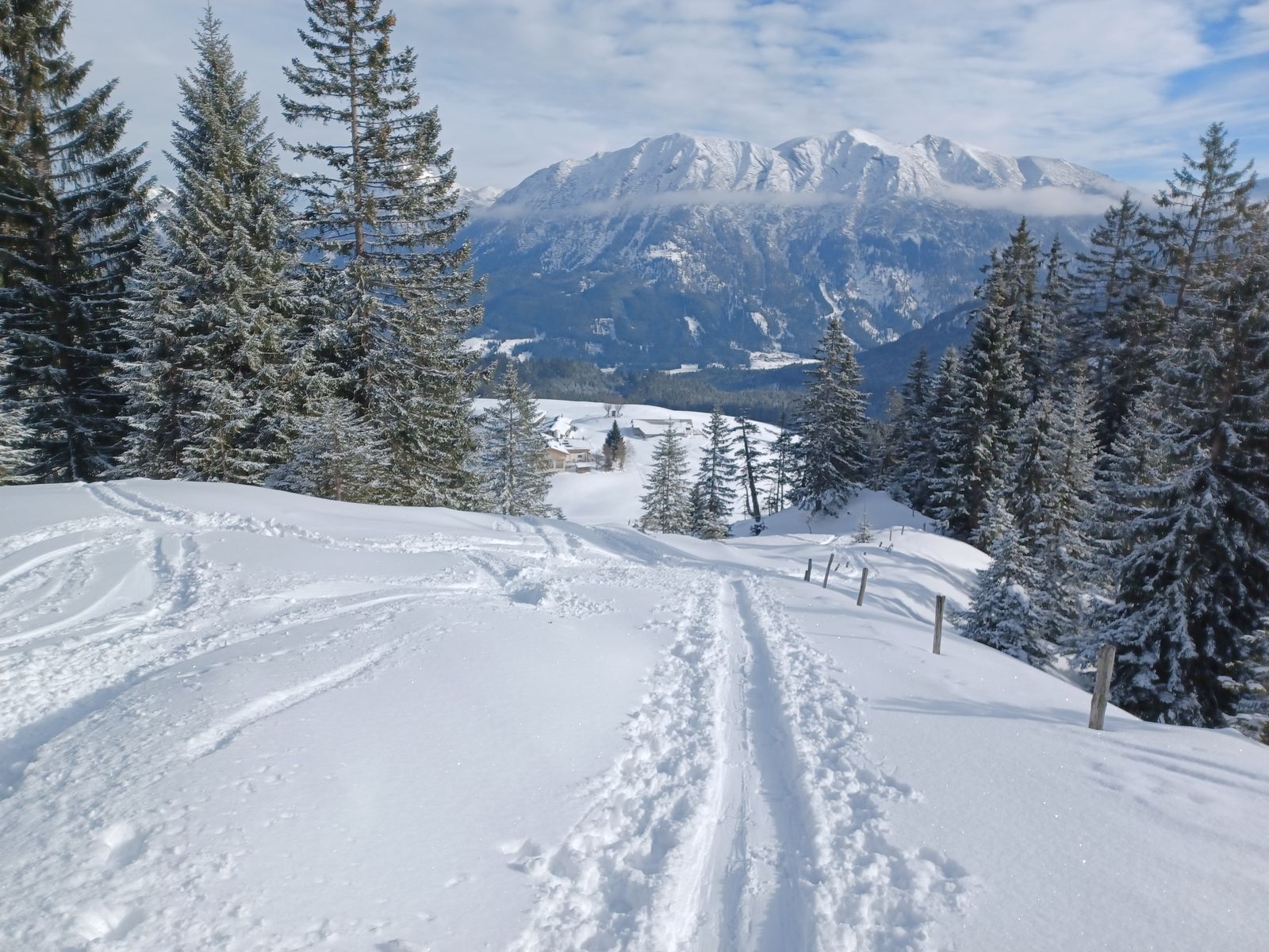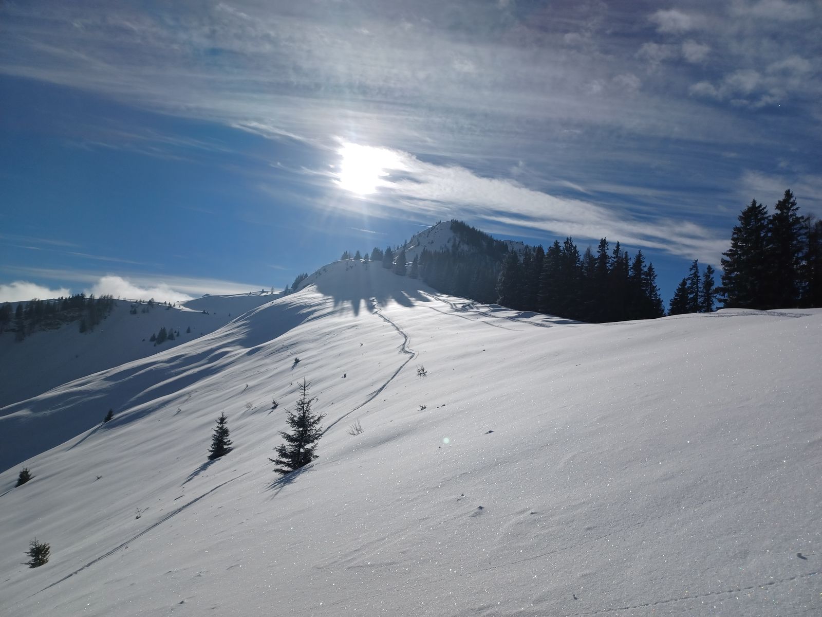 Beste Skitourenbedingungen! Sonne und 15 cm fresh auf einer eingefahrenen Skitourenpiste machten heute richtig Spaß. Alte Spuren waren nur hin und wieder leicht störend. Nur im Aufstieg auf dem Falkenmoossteig schauen etliche Steine hervor, für die Abfahrt nimmt man sowieso die Forststrasse. Und die ging super. Ich habe die Hochplatte selten so gut erwischt wie heute.