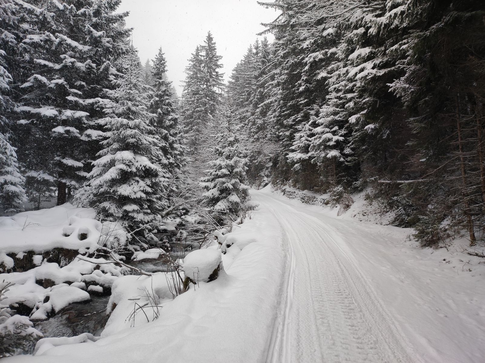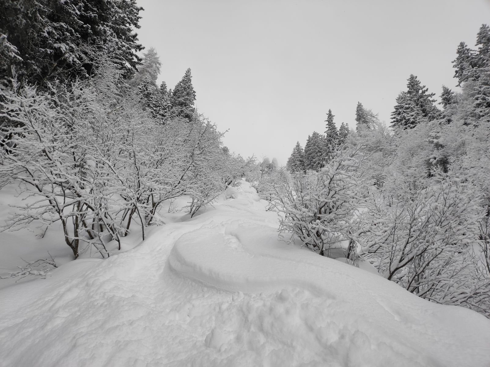 Heute Morgen bin ich bei starkem Schneefall in Grinzens Richtung Salfeins gestartet. Zunächst geht es über 90 Minuten zunächst auf der Rodelbahn der Kemater Alm und dann auf der Forstraße (kann abgekürzt werden) zur Salfeins-Alm meditativ bergan. In tiefen und mittleren Lagen hat es in der Gegend weniger Schnee als zum Beispiel in den Kitzbühelern und erst ab etwa 1400 Metern kann man von einer wirklich soliden Unterlagen sprechen. Es gab weiter unten insgesamt 10-15cm Neuschnee; ziemlich genau bei 1700 Metern verdoppelt sich die Neuschneemenge aber abrupt auf etwa 30cm.