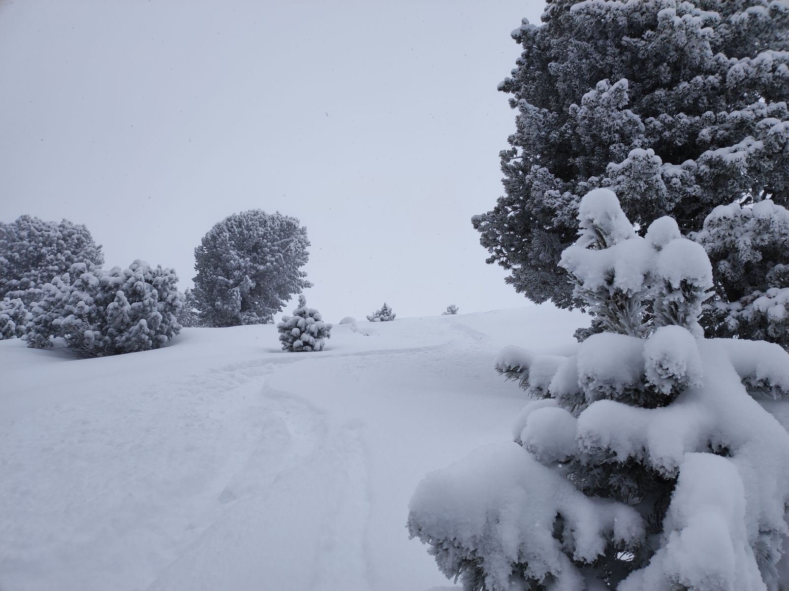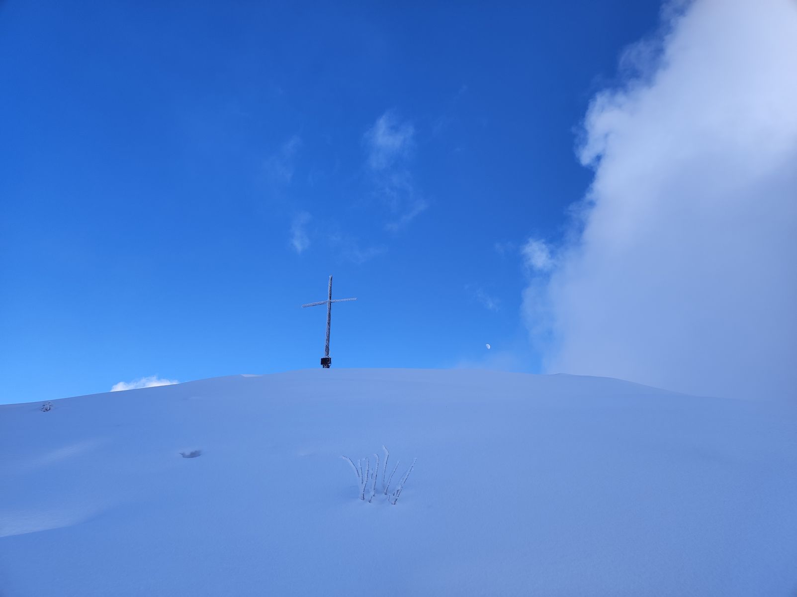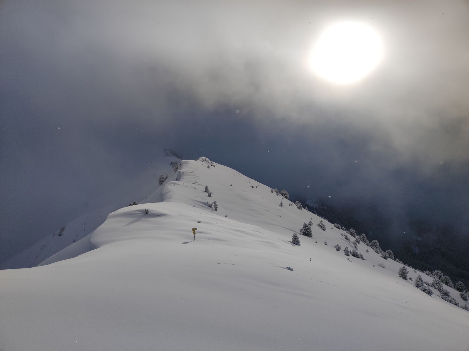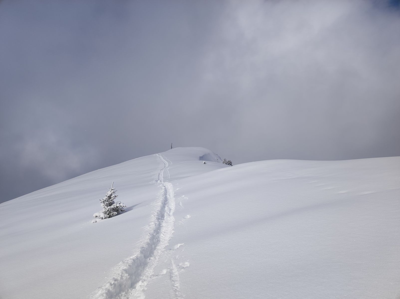 Nachdem ich zwei Abfahrten dieser Art in dichtem Nebel, bei aber ausreichender Sicht (dank des lichten Zirbenwaldes) genossen habe, bin ich nochmal hoch und dieses Mal weiter bis zum Grieskogel. Mein Kalkül war, dass sich das Wetter am Nachmittag so weit bessert, dass ich von dort über die freien Hänge abfahren kann. Hat funktioniert! Genau am Gipfel kam die Sonne raus.🥳
