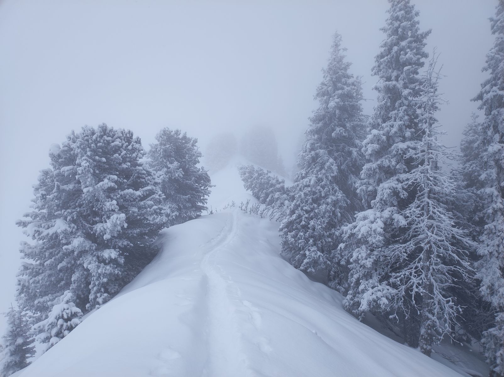 Nachdem ich zwei Abfahrten dieser Art in dichtem Nebel, bei aber ausreichender Sicht (dank des lichten Zirbenwaldes) genossen habe, bin ich nochmal hoch und dieses Mal weiter bis zum Grieskogel. Mein Kalkül war, dass sich das Wetter am Nachmittag so weit bessert, dass ich von dort über die freien Hänge abfahren kann. Hat funktioniert! Genau am Gipfel kam die Sonne raus.🥳