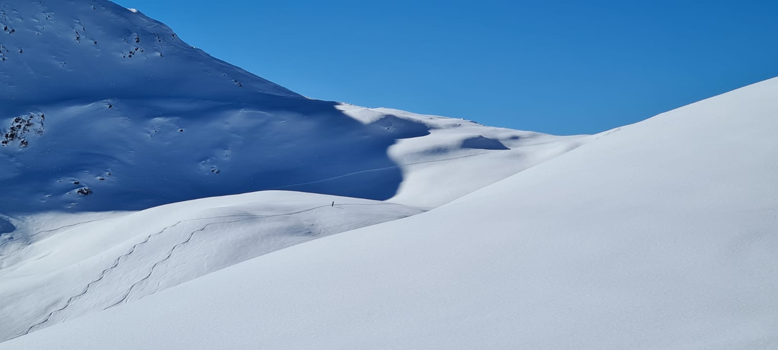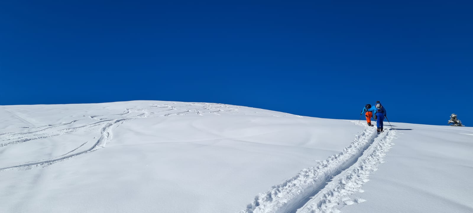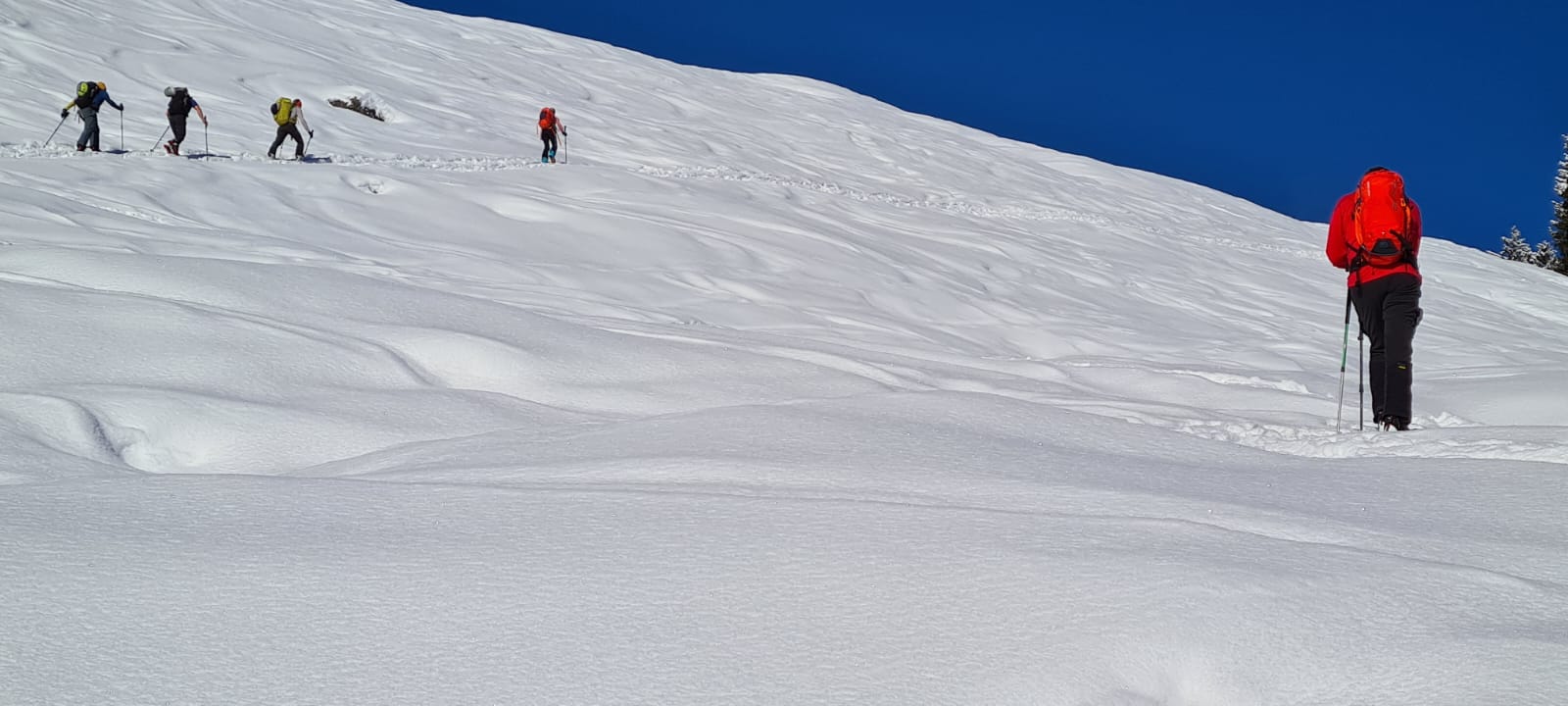 Eiskalt heute morgen am Ausgangspunkt. Bei -12 Grad war die Unterlage (von ca. 40 cm im Tal) gut gefroren. Ein Durchbrechen war daher ausgeschlossen, Feindkontakt auch sehr unwahrscheinlich, allerdings hat man die alten Spuren und Scherhaufen schon durchgespürt. Insgesamt aber dennoch sehr feine Bedingungen.