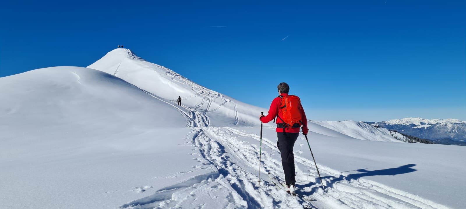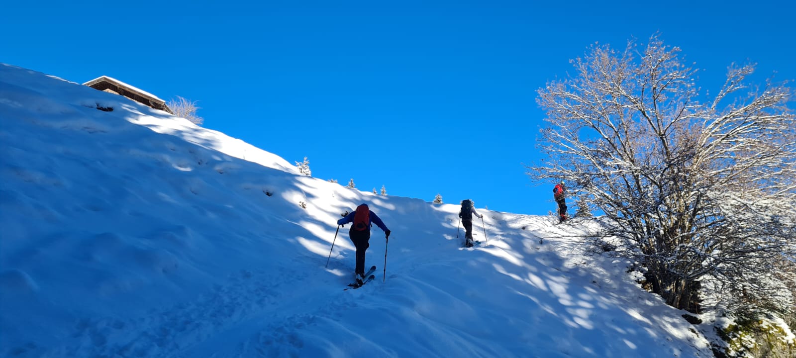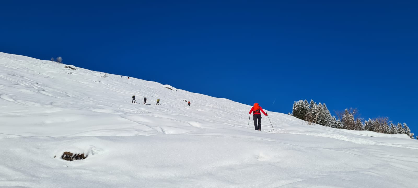 Eiskalt heute morgen am Ausgangspunkt. Bei -12 Grad war die Unterlage (von ca. 40 cm im Tal) gut gefroren. Ein Durchbrechen war daher ausgeschlossen, Feindkontakt auch sehr unwahrscheinlich, allerdings hat man die alten Spuren und Scherhaufen schon durchgespürt. Insgesamt aber dennoch sehr feine Bedingungen.