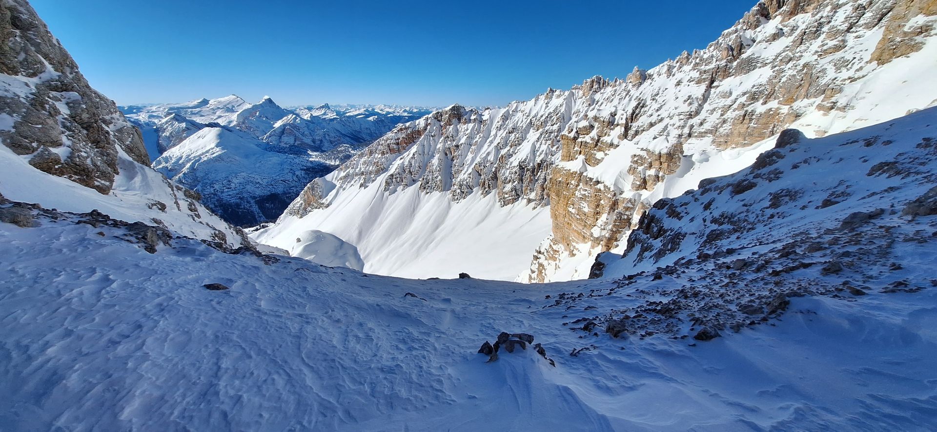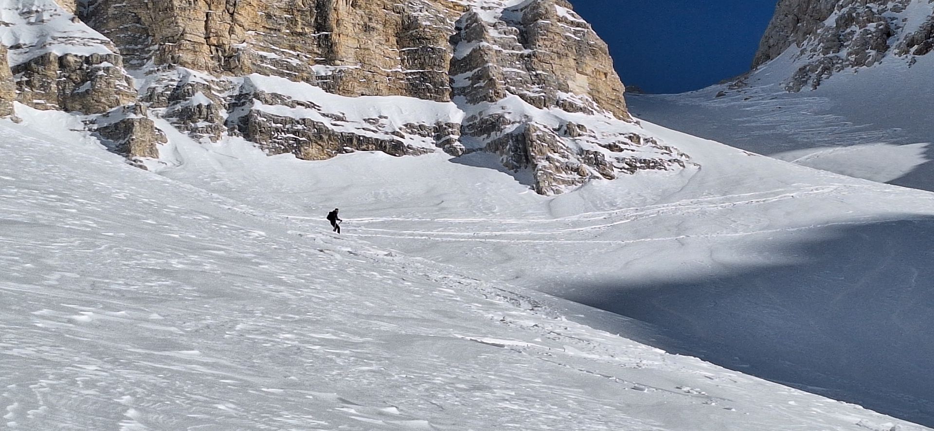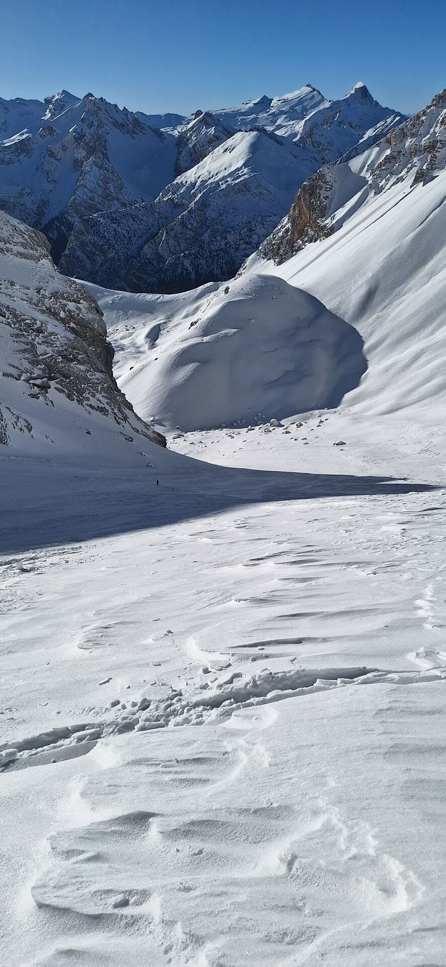 Eine kurze Schrägabfahrt in nordöstlicher Richtung, ca 100hm, zum Beginn des Kars und weiter unter den Felsen des Castels de Valbon ins eigentliche Kar. Rechts haltend in das immer steiler werdende Kar aufsteigen(bis 45 Grad) bis die Scharte erreicht ist.