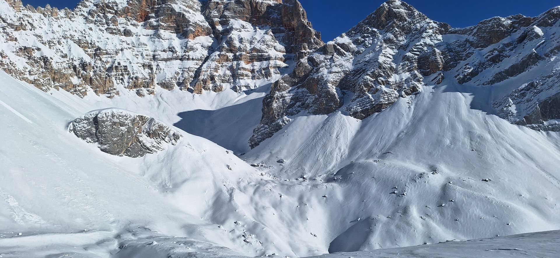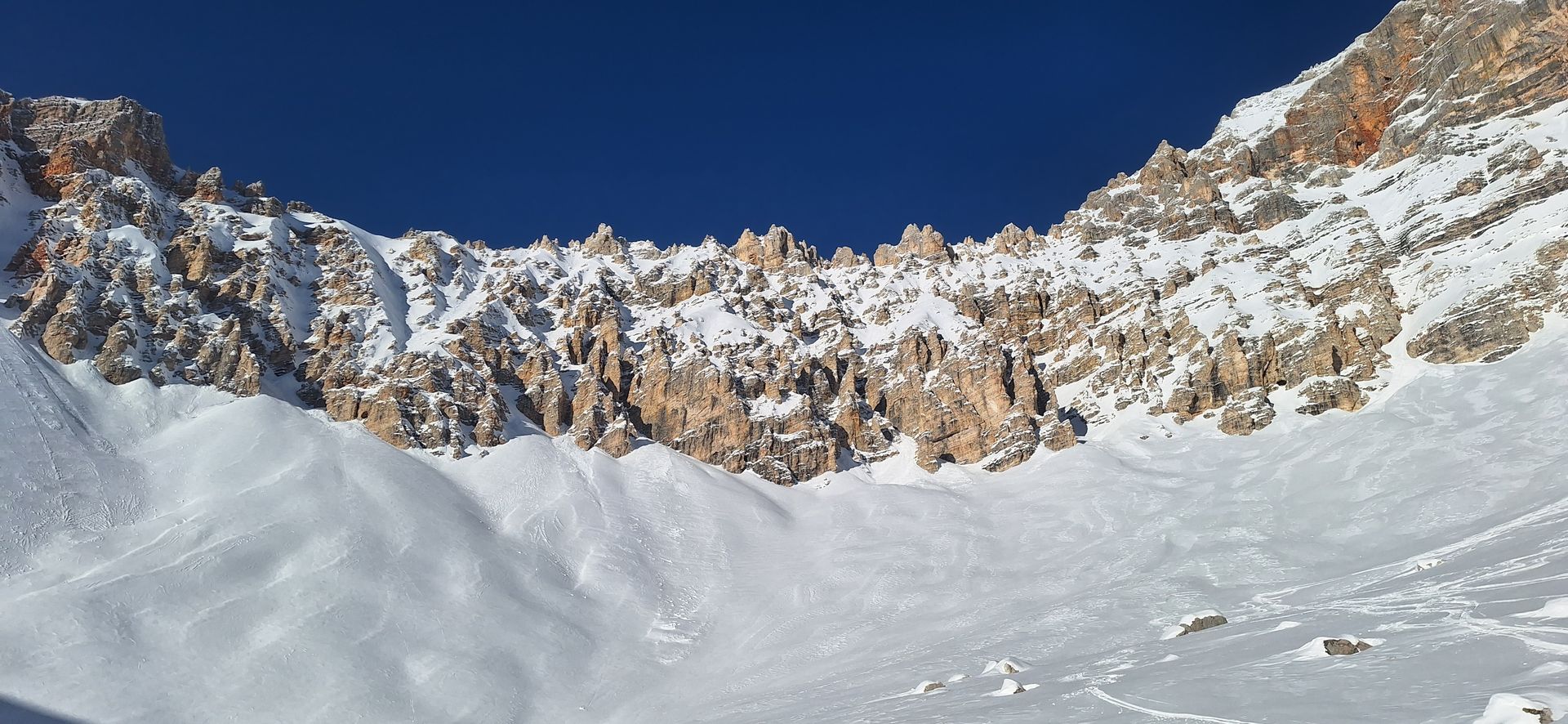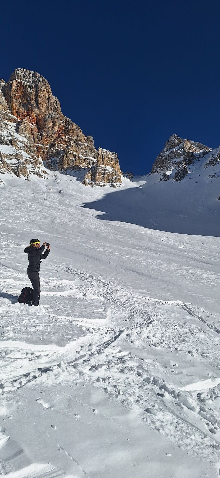 Eine kurze Schrägabfahrt in nordöstlicher Richtung, ca 100hm, zum Beginn des Kars und weiter unter den Felsen des Castels de Valbon ins eigentliche Kar. Rechts haltend in das immer steiler werdende Kar aufsteigen(bis 45 Grad) bis die Scharte erreicht ist.