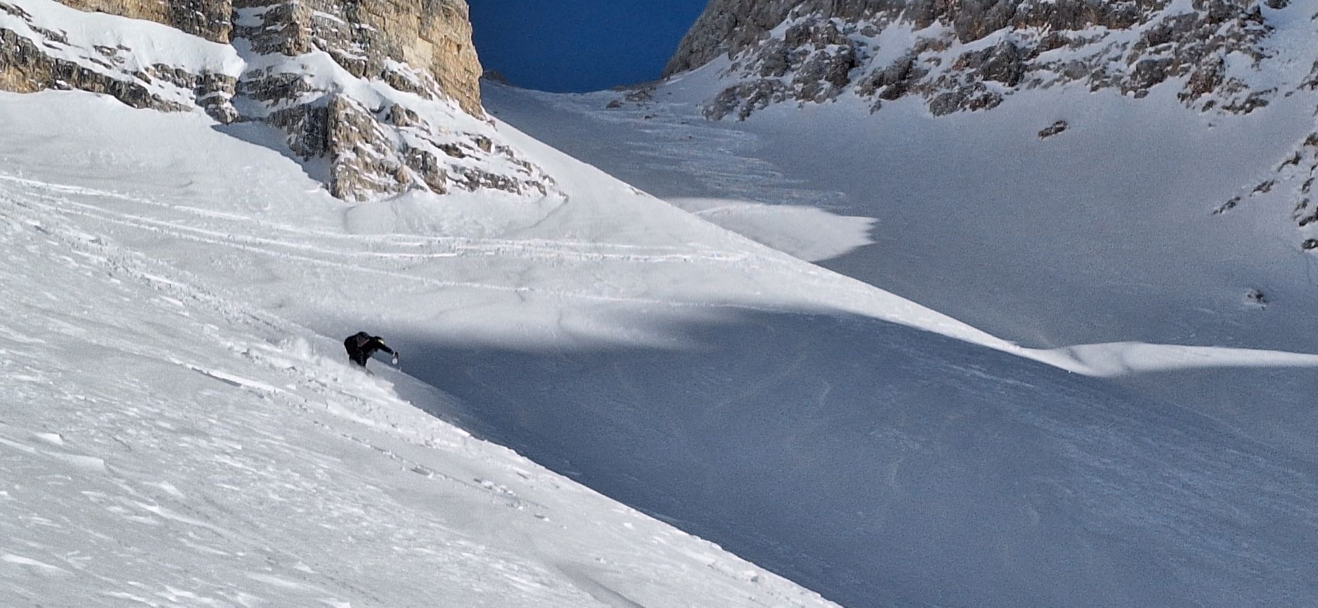 Eine beeindruckende Skitour, die mit Christalloscharte oder Cresta Bianca zu vergleichen ist, in der Westvariante 1450 hm und 40 bis 45 Grad.