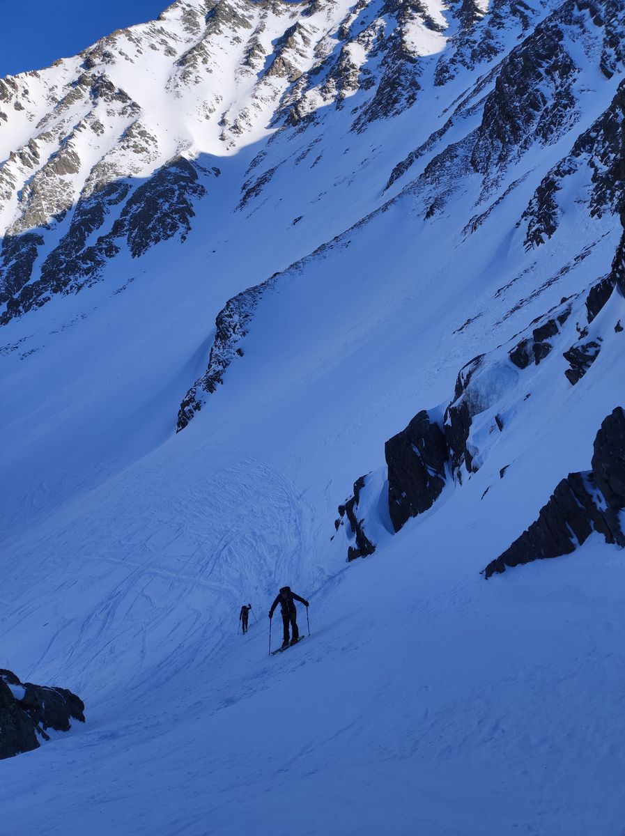 Die Untere Zwing ist im Aufstieg momentan wirklich hantig, um nicht zu sagen gefährlich. Ich habe nach meinem Schreckerlebnis letztes Jahr (siehe Bericht hierzu vom April) schon vor der Bachquerungen Steigeisen angelegt und die Skier an den Rucksack getan. Das ging gut. Ein Aufstieg mit Harscheisen ist nach meinem Dafürhalten nicht möglich. Ein einheimischer Habitue hat es versucht, aber es auch sein lassen. Er meinte oben: "Ma! So schlecht beinond hon i de Zwing a no nit ghod." Einige Kollegen haben gleich den Umweg über den Sommersteig genommen. Für die Abfahrt gilt das, was Robert letztens in seinem Bericht schrieb: Mit runden Kanten wird man da ordentlich ins Schwimmen (hoffentlich nicht wörtlich...) kommen. Auf den Bildern wird man die schlechten Verhältnisse vielleicht nicht so deutlich erkennen, weil ich eben an den blödsten Stellen auch nicht stehen bleib, um das Handy rauszufriemeln.