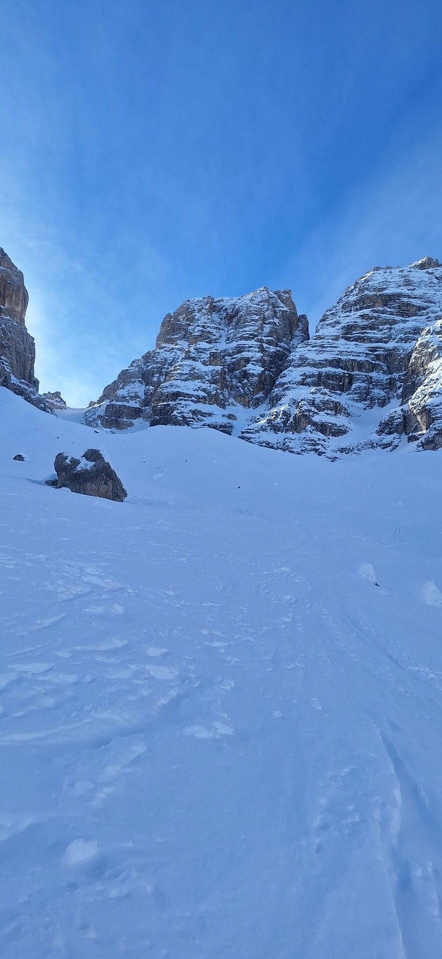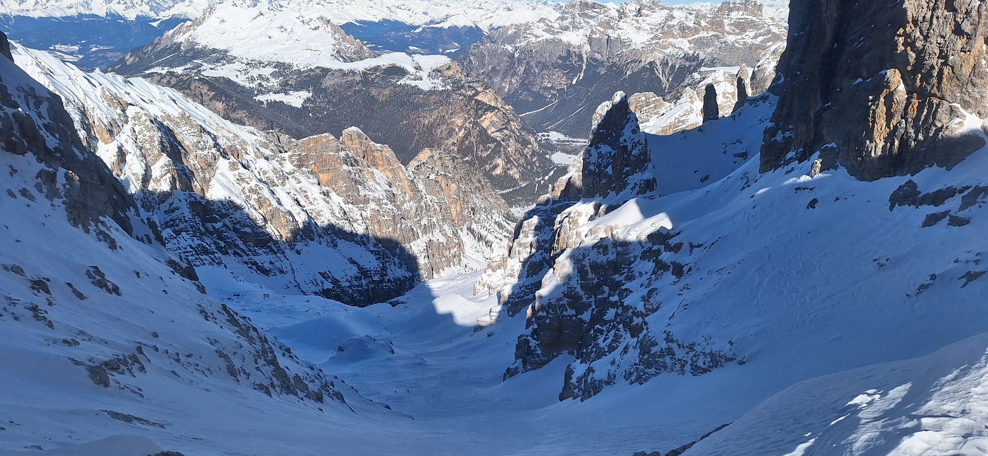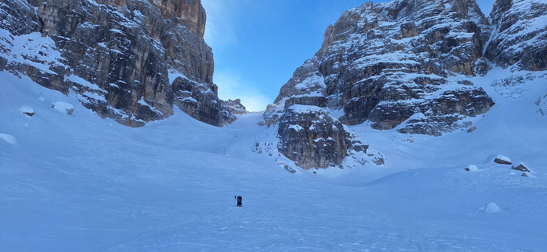 Am Austieg der Rinne, im Circ de Cristallo sind es dann noch 700hm zur Scharte, Die Neigung beträgt ca. 30° bis 35° und wir waren verwundert dass wir fast allein unterwegs waren.