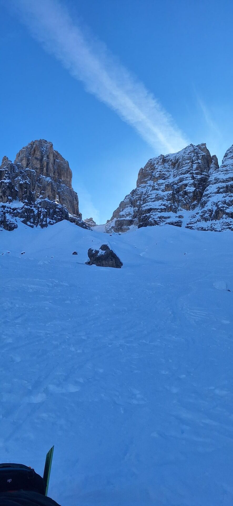 Den Rest bis zur Scharte harter windgepresster Schnee. Dementsprechend dann die Abfahrt ein Mix aus Bruchharsch, windgepresstem Schnee und ein paar Stellen sogar Pulver.