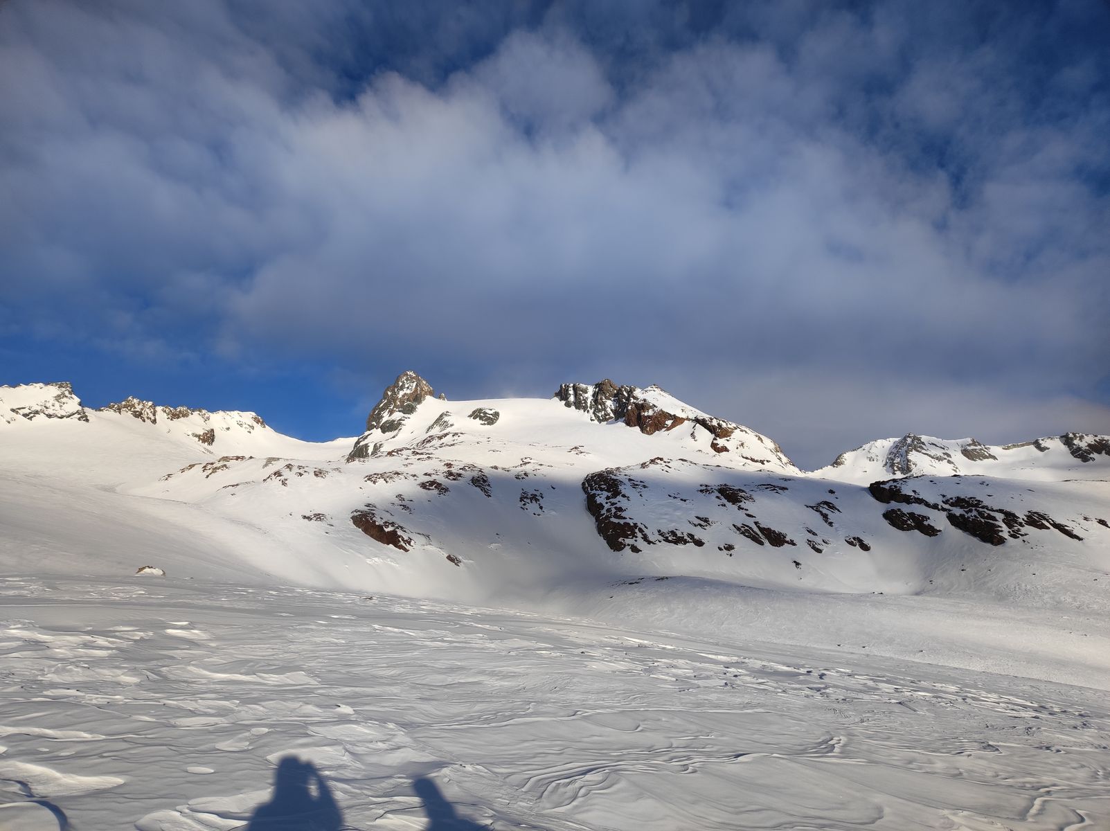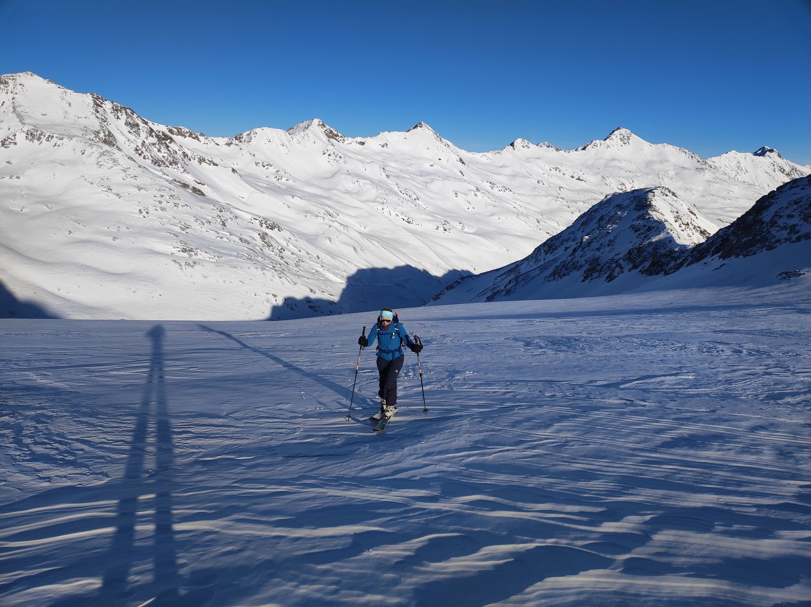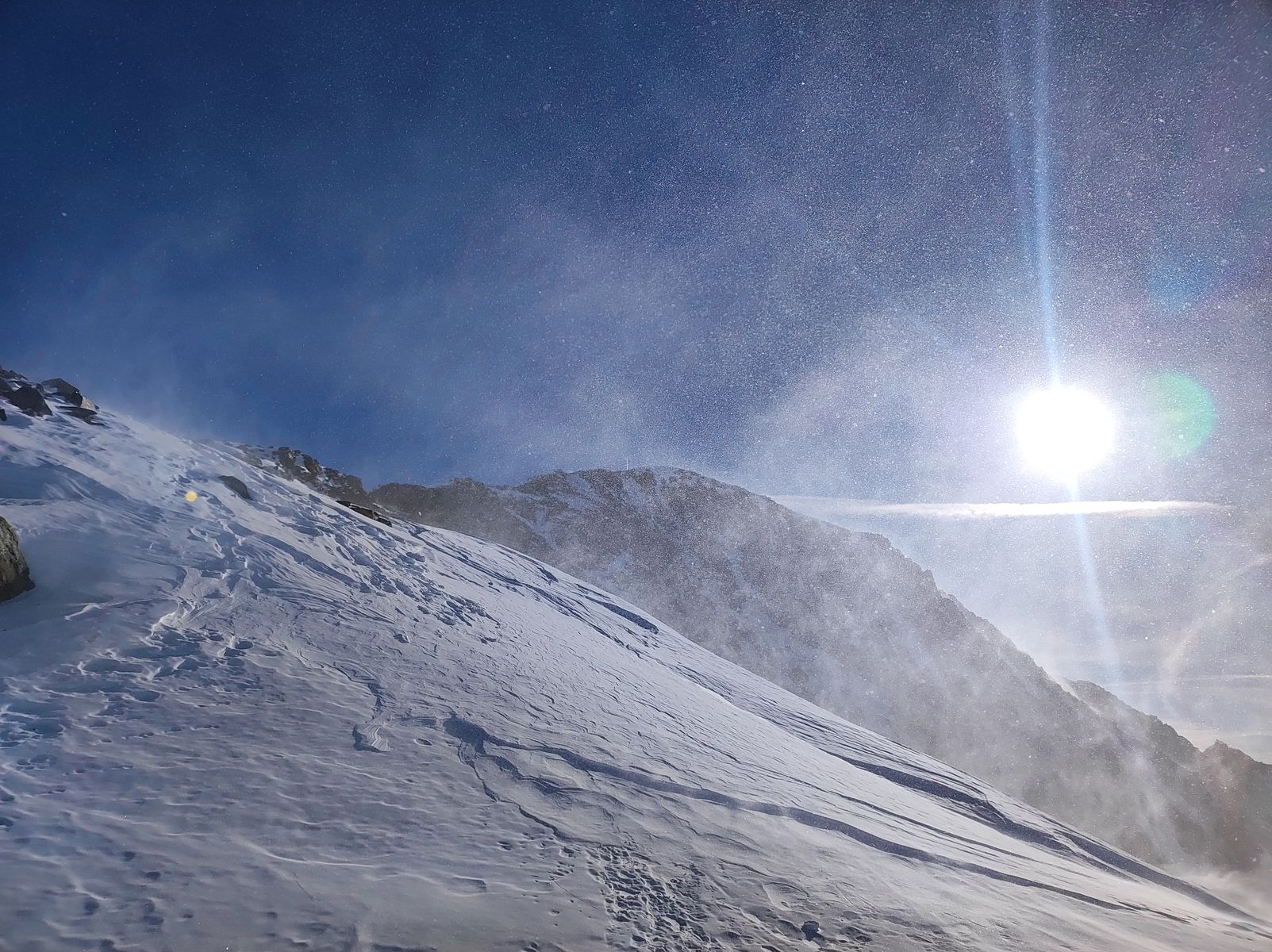 Irgendwie aber auch einfach ein eindrucksvolles Naturerlebnis! Im Anstieg zur SWS herrschte am Gletscher immer ein starker Wind (um 50km/h), der ständig die Richtung wechselte. Beim Blick zum Kamm hoch, konnte man dann in Form von mächtigen Schneewirbeln immer auch schon frühzeitig erkennen, dass die Söhne und Töchter des Aiolos sich wieder rüsten, um mit voller Gewalt über den Skitourengeher hereinzubrechen. Bei den Böen musste man einfach kurz stehenbleiben, damit es einen nicht umhaut...