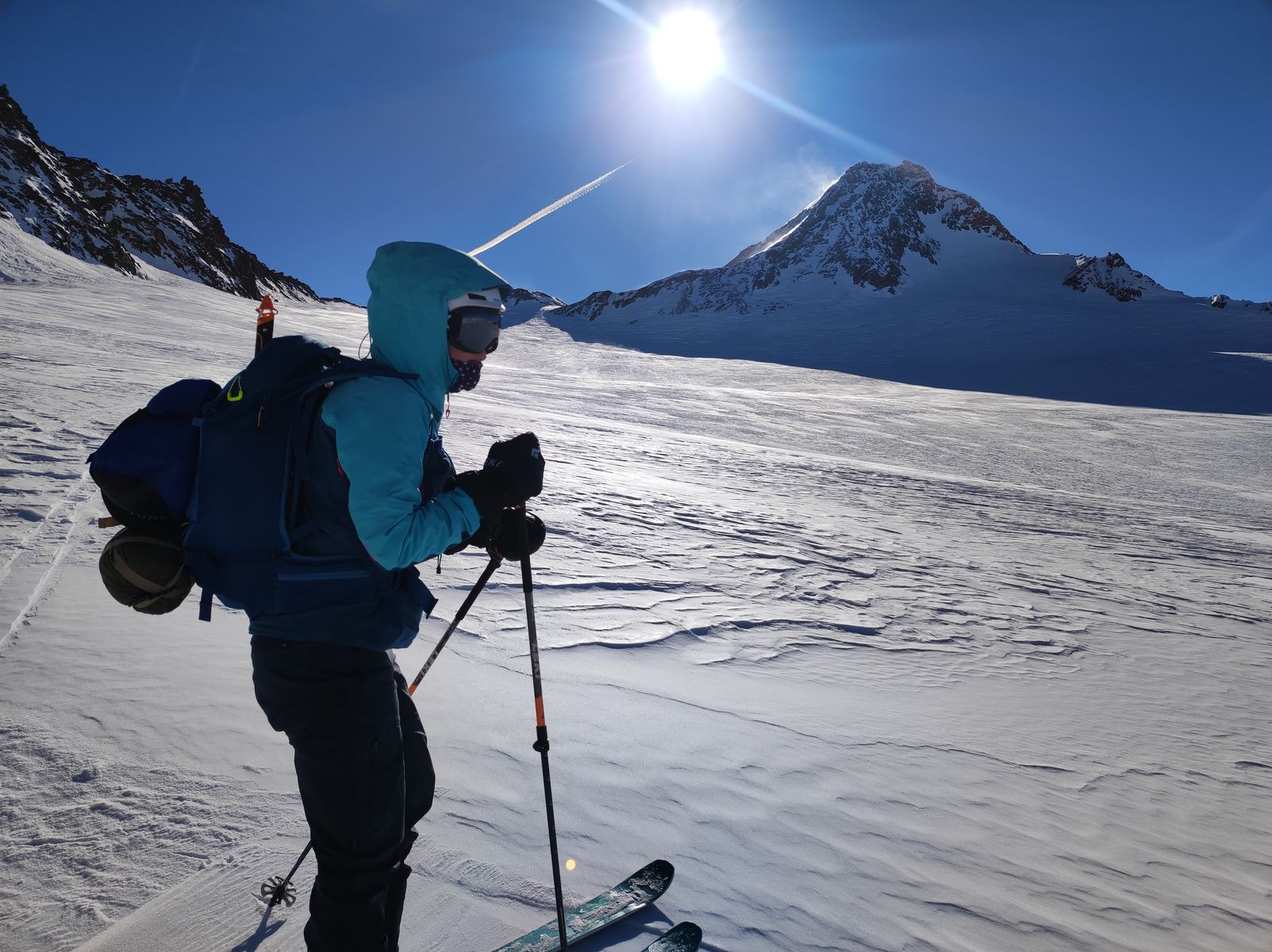 Gute, oberhalb von 2500 Metern sehr gute Schneelage. Der Wind hat den Schnee sehr kompakt gepresst und auf den Gletschern (,auf denen wir waren,) kann man daher ohne Seil unterwegs sein. Lawinengefahr in meinen Augen fast gegen Null tendierend: Es waren nicht einmal an klassischen Punkten (zB Aufstieg zur Martin Busch) Rutsche zu erkennen. Die Schneequalität war deutlich besser als man bei dem vielen Wind meinen würde. Verschiedene Formen von windgepresstem Schnee, die sich aber bei entsprechender Entschlossenheit wirklich gut fahren ließen.