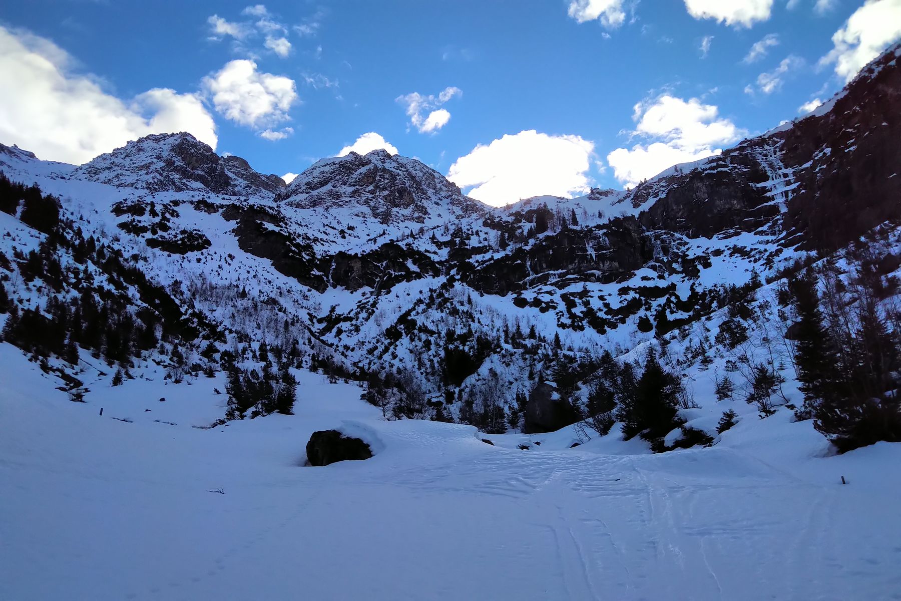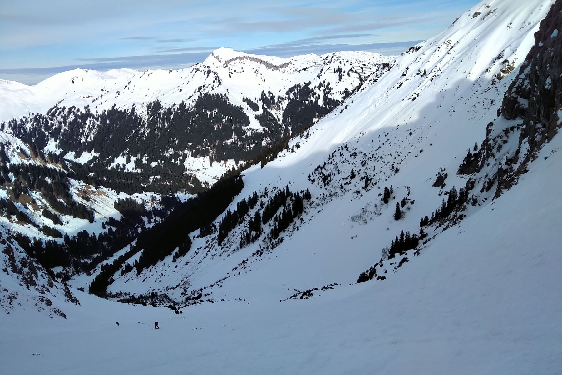 - Einfahrt auf der Ostseite ging gut, der obere Teil ging gut zu fahren, nach unten wurde der Schnee weicher. Man konnte aber bis zu Bernhards Gemstelalpe abfahren und musste dann auf dem Forstweg nur paarmal kurz abschnallen. Danach von Alpenwald mit dem Bus wieder zurück nach Baad