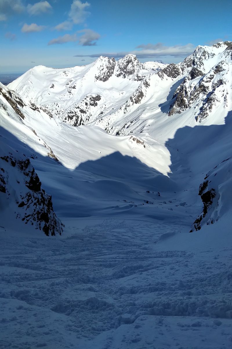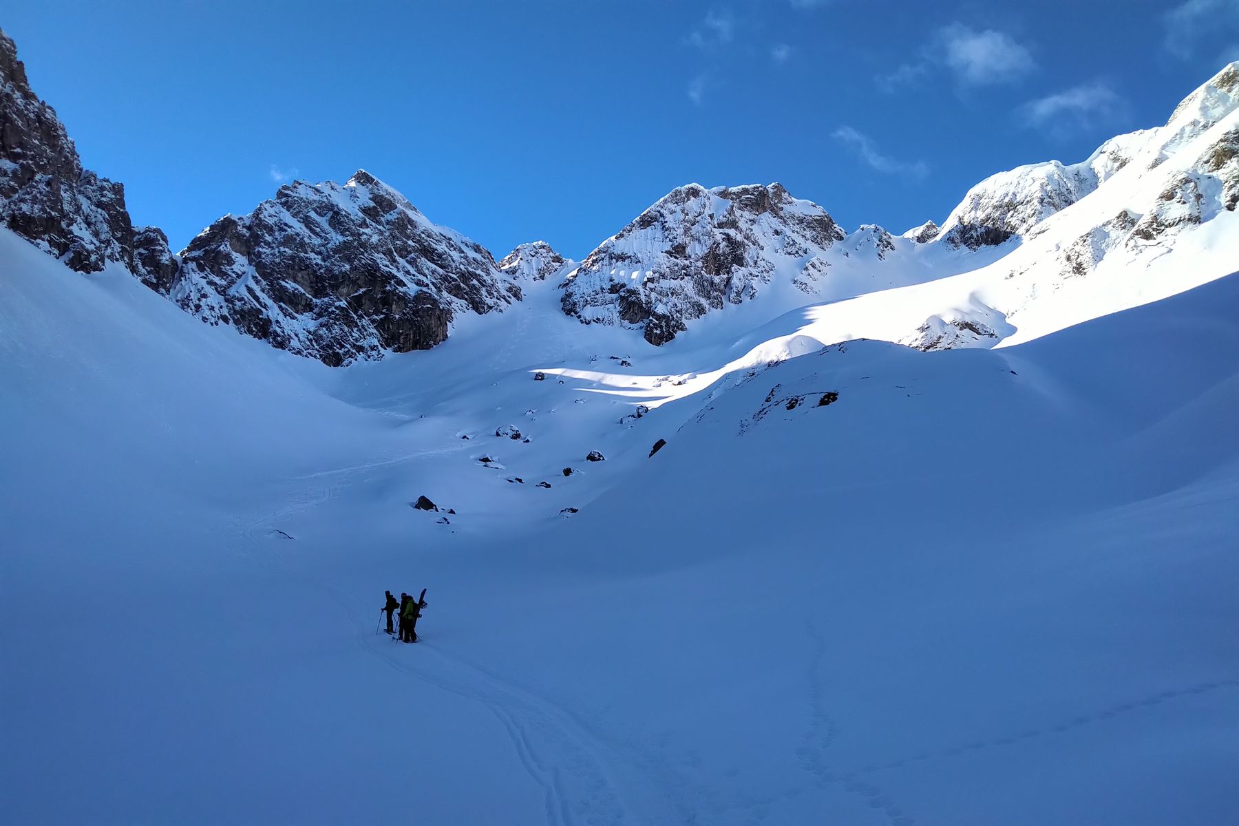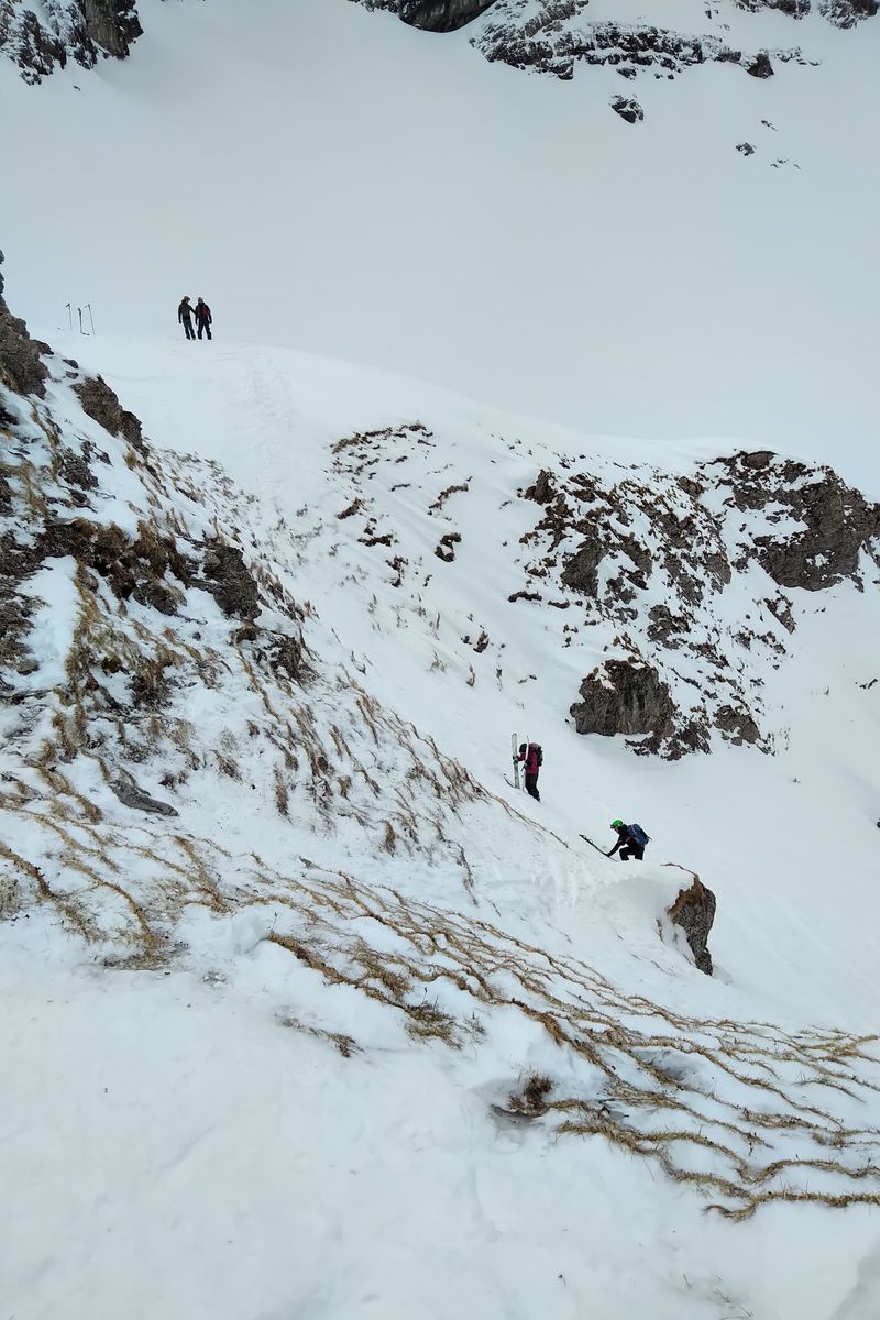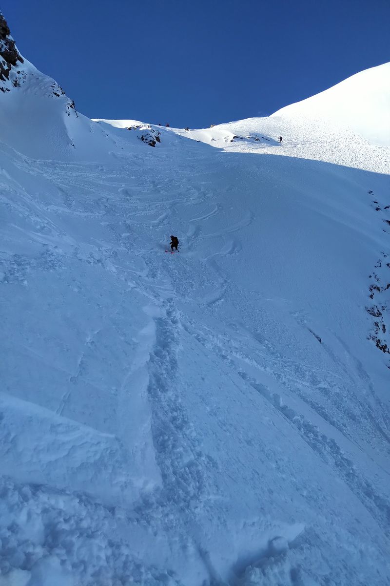 - Wir sind lieber wieder ein Stück abgefahren und haben eine Rinne weiter nördlich nochmal angefellt. Im Nachhinein wäre es wohl gegangen, ein paar sind die Querung gefahren und es hat machbar ausgeschaut (aber schon etwas haklig).