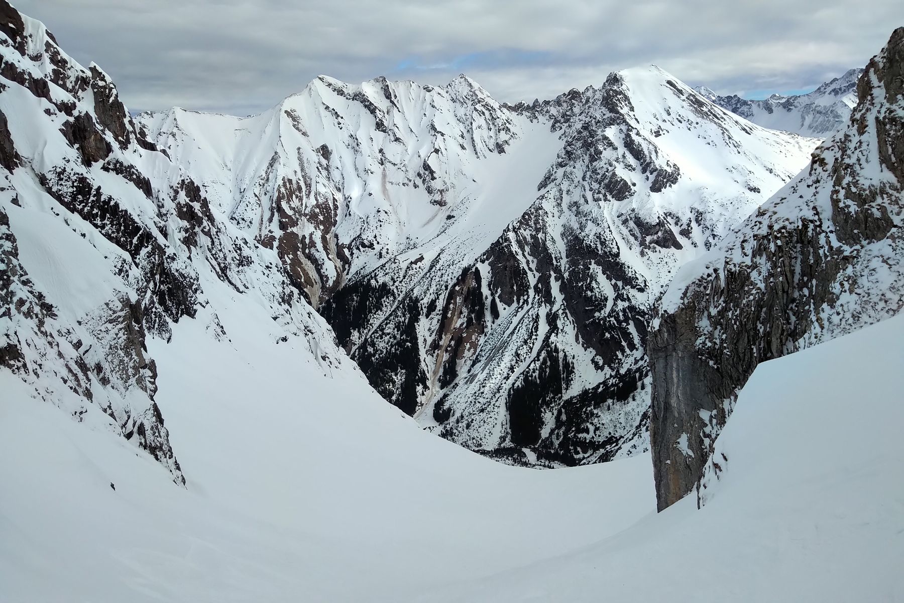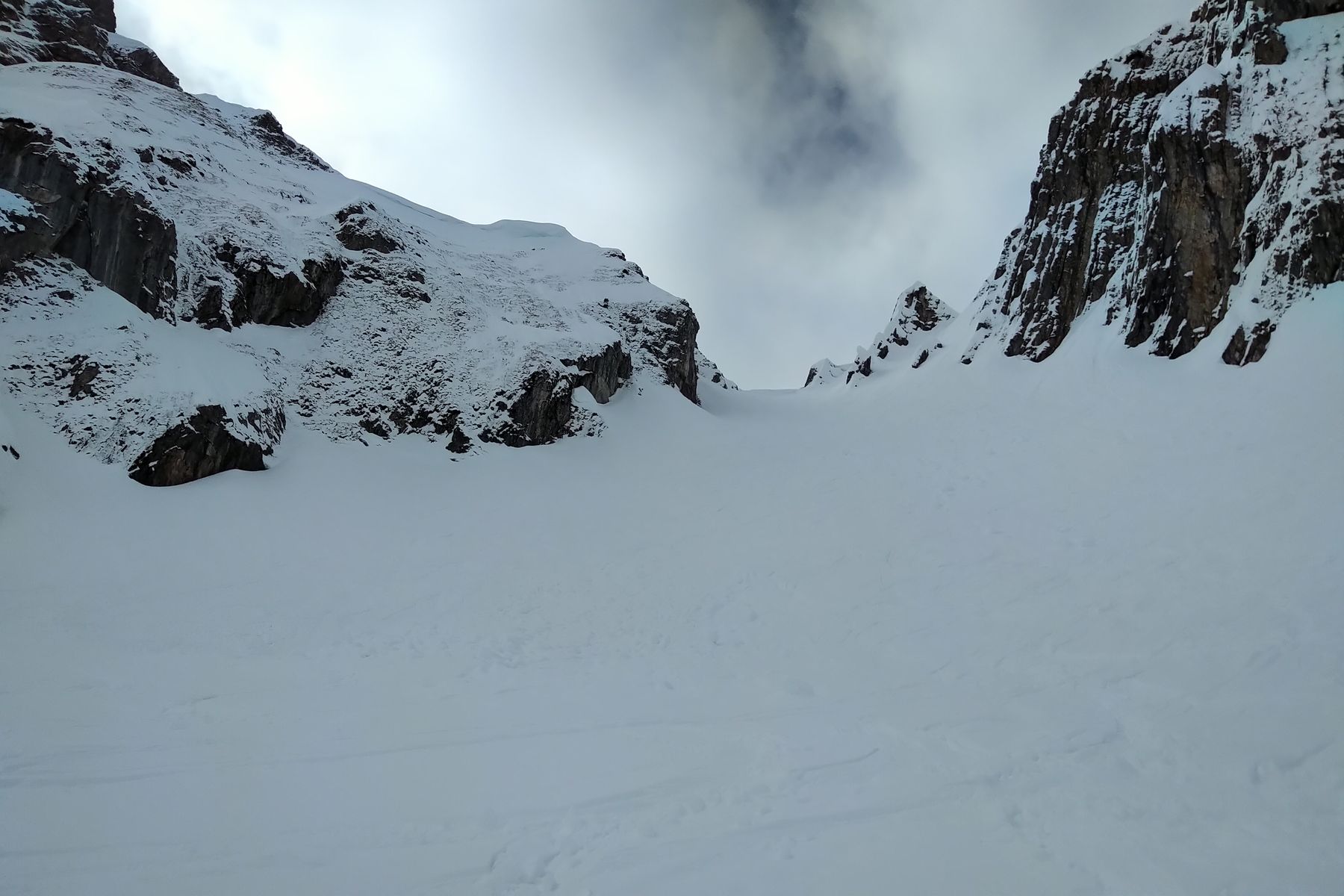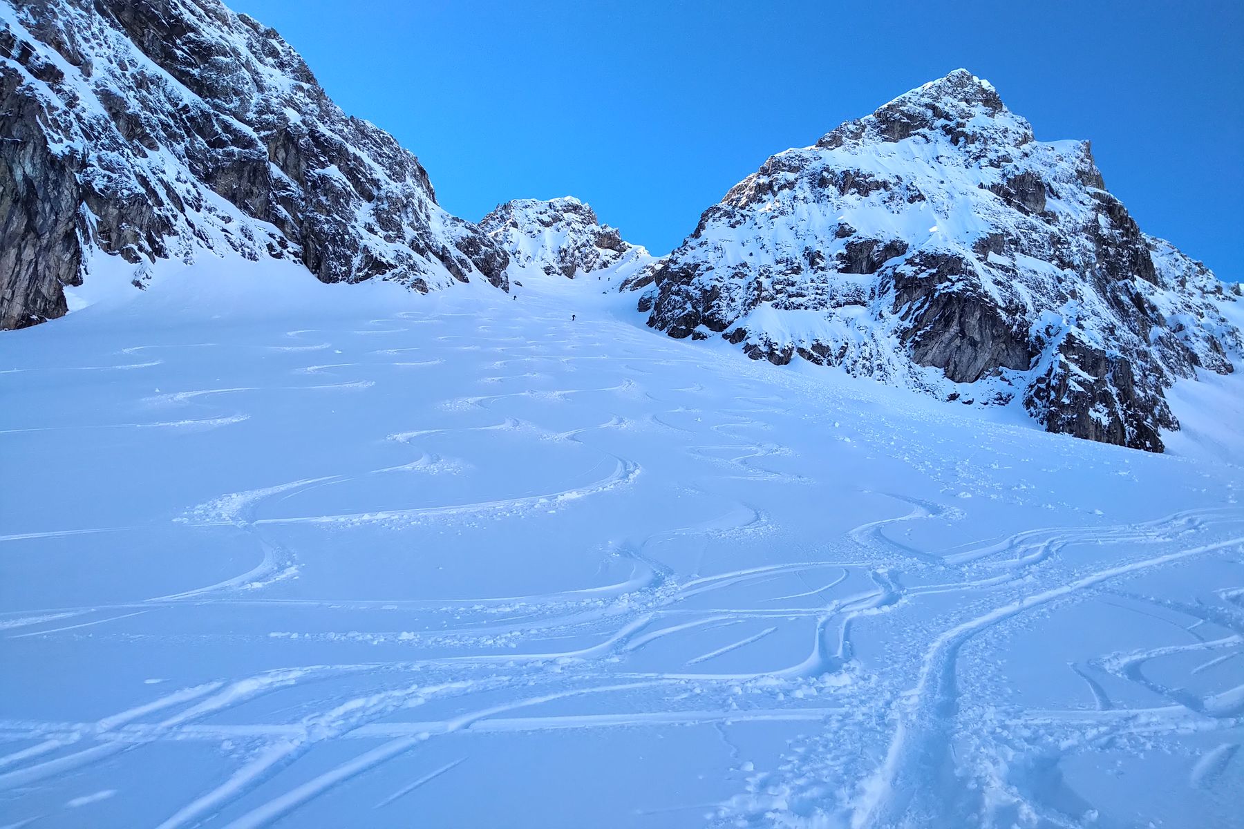 - Wir sind lieber wieder ein Stück abgefahren und haben eine Rinne weiter nördlich nochmal angefellt. Im Nachhinein wäre es wohl gegangen, ein paar sind die Querung gefahren und es hat machbar ausgeschaut (aber schon etwas haklig).