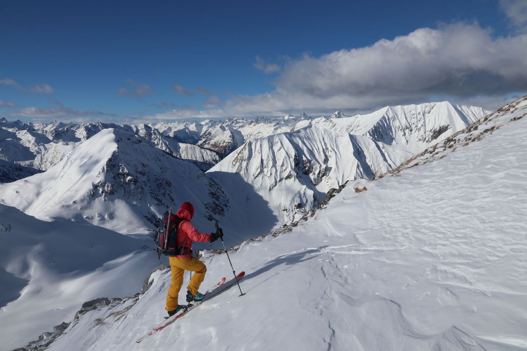 Auch der Aufstieg zu und über eine Wechte, die sich im nachhinein als Schlüsselstelle herausstellt macht den zweiten Tag recht spannend. Dahinter aber sehen wir, das der Kamm oft abgeweht ist, so dass wir nicht Gafhar laufen mit einer Wechte abzustürzen. Zudem ist die steile, zu querenden Südhänge zwar hart. Doch die mitgenommenen Steigeisen bleiben im Rucksack.