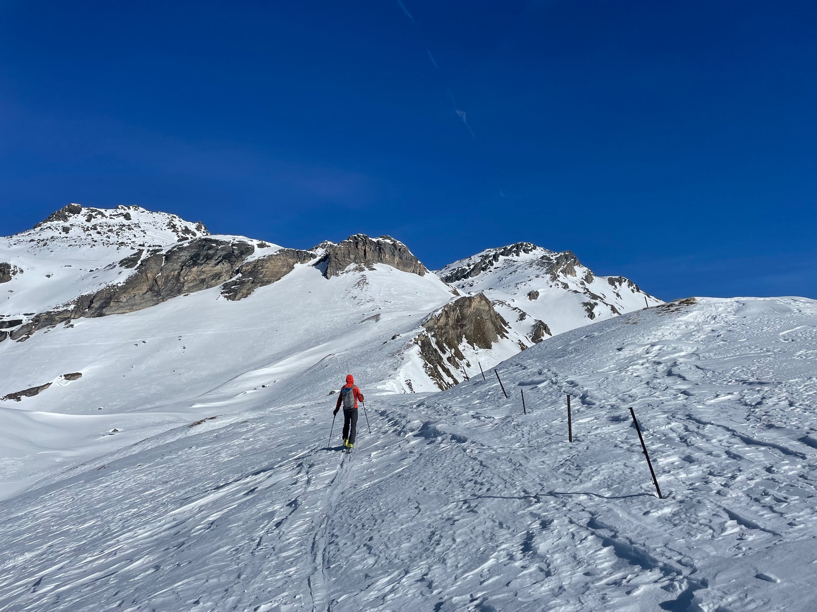 Am Dienstag Start mit Aufstieg zur Torspitze, hart aber griffig. Dank der sehr stabilen Lawinenlage war die steile Variante ins Eiskarjoch östlich des Gipfels bedenkenlos möglich, eine weitere geniale Abfahrt. Wenn auch unten raus etwas angeharscht. Dann wieder Felle raus und hoch zum Almkogel. Bei der steilen Querung kurz vor dem Gipfel kamen dann doch mal die Harscheisen zum Zug, dank der ein oder anderen vereisten Passage war das auch besser so.