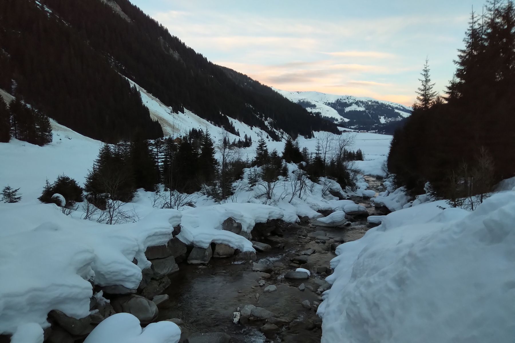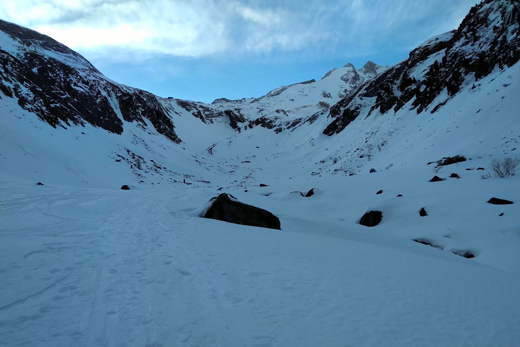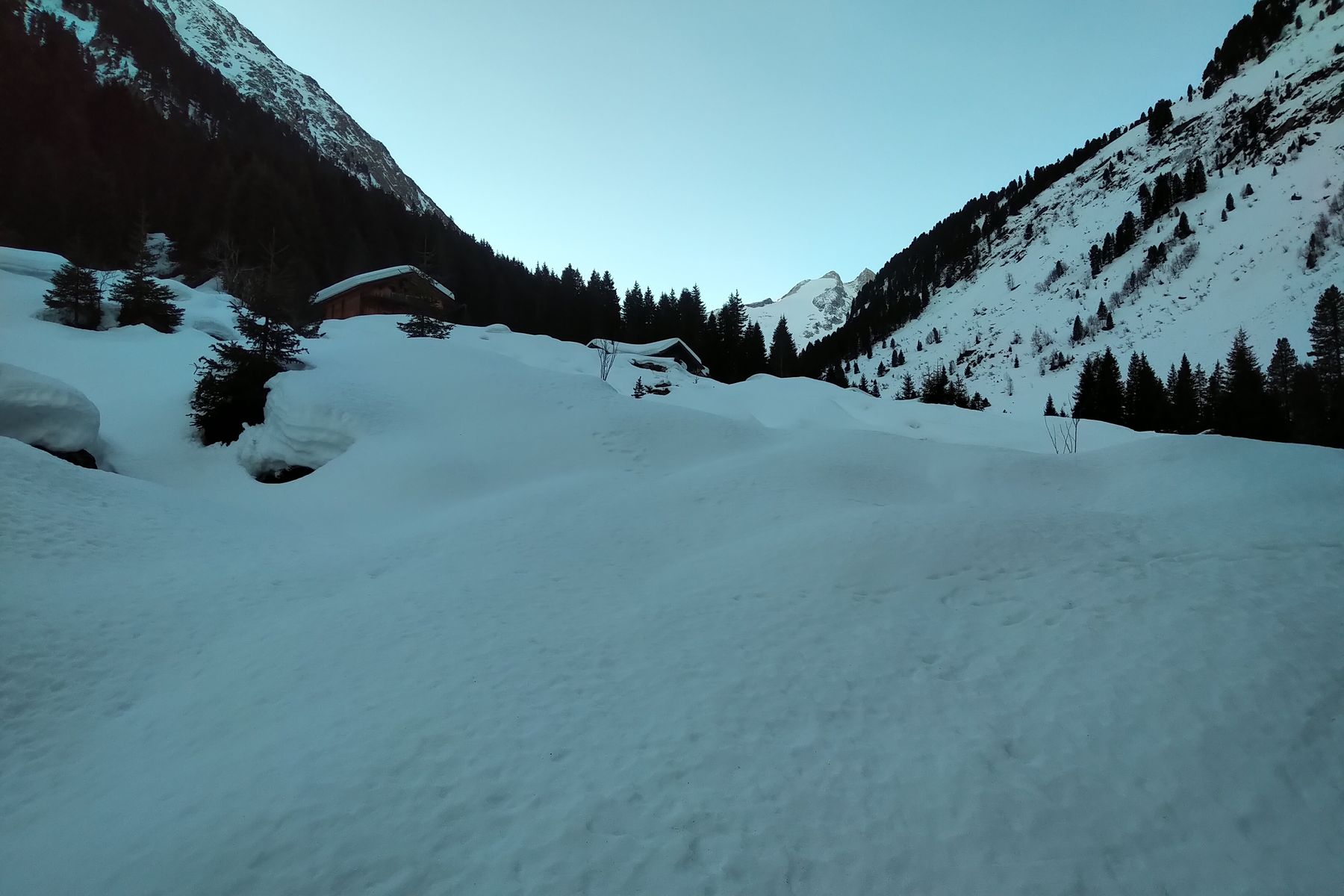 Dass ich keine aktuellen Infos über die Verhältnisse finden konnte, hat mich dabei neugierig gemacht. Immerhin waren heut einige Aufstiegs-Spuren von den letzten Tagen zu sehen, das hab ich als gutes Zeichen interpretiert. Und im Wildgerlostal sieht die Schneelage noch vergleichsweise gut aus!