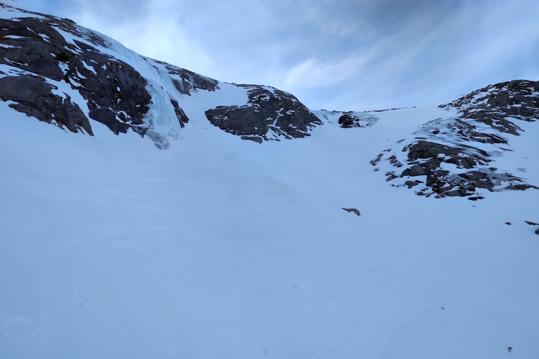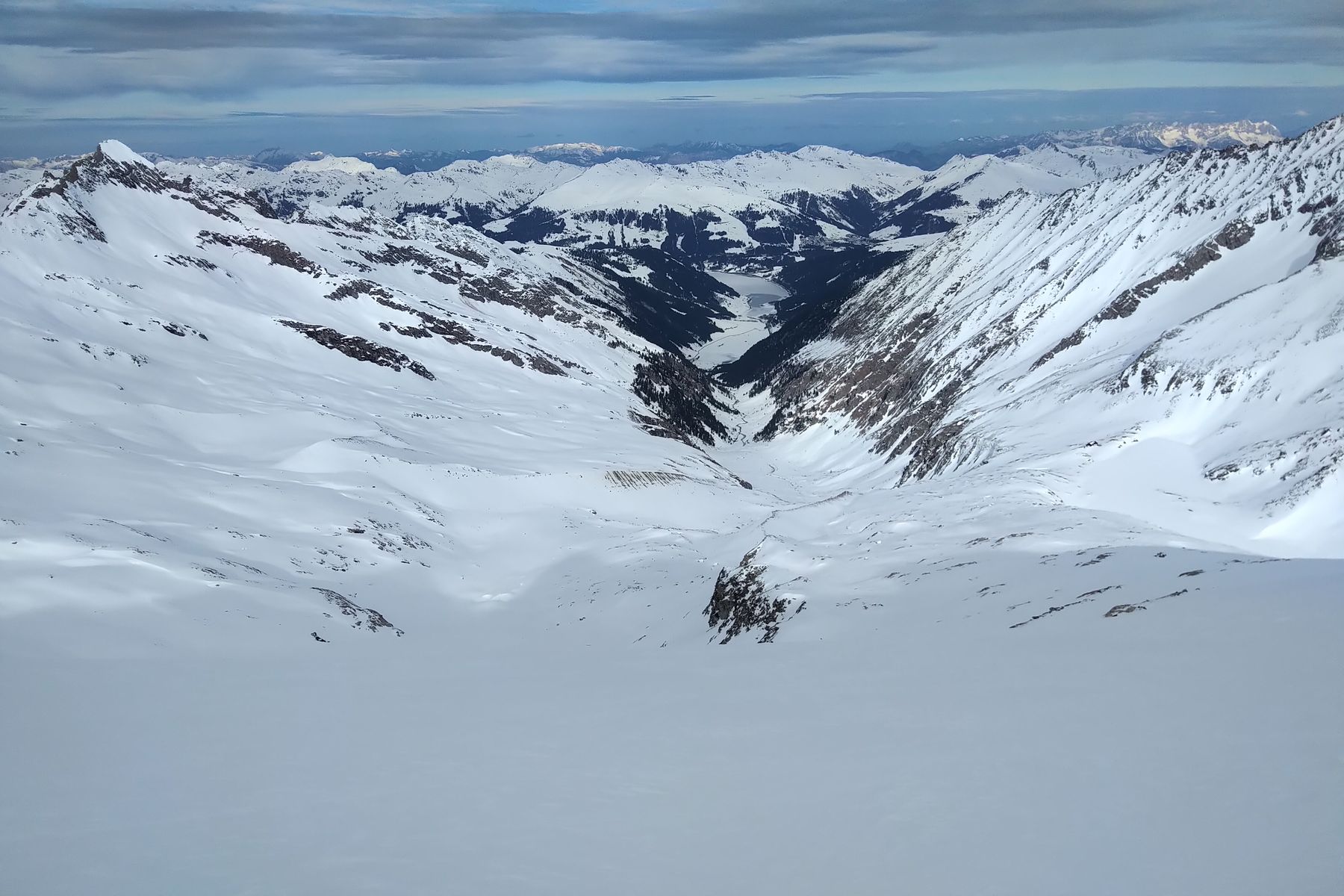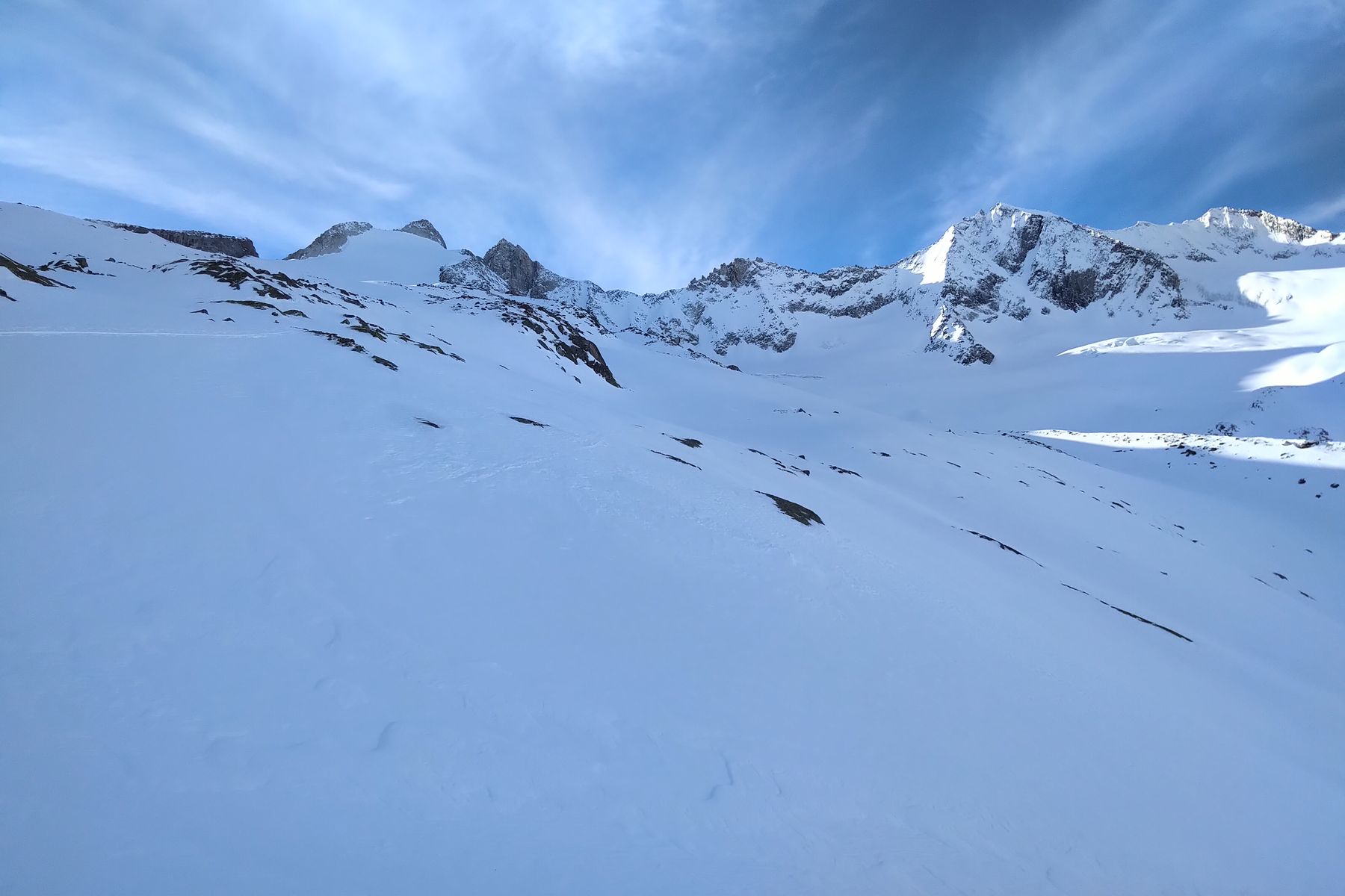 Die Steilstufe unterhalb der Zittauer Hütte wird im Winter meistens über eine Rampe etwas rechts von der Bildmitte erklommen: