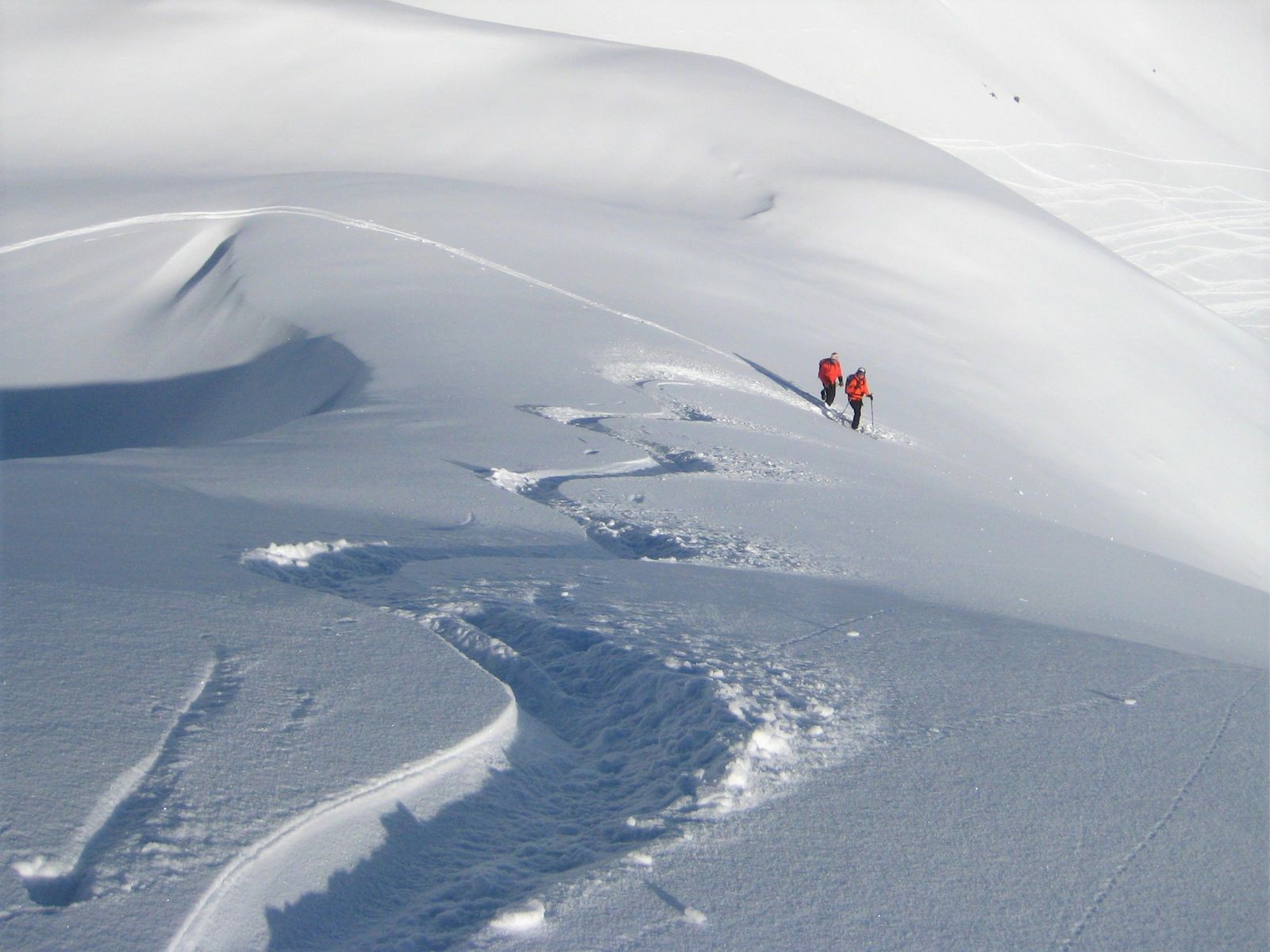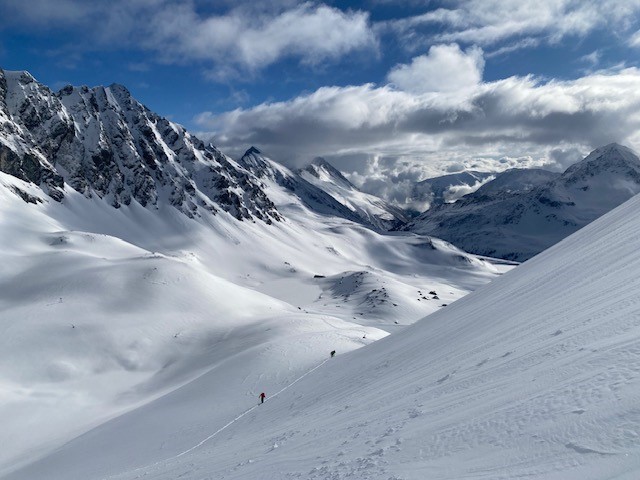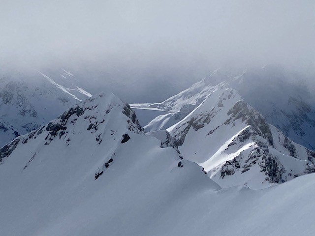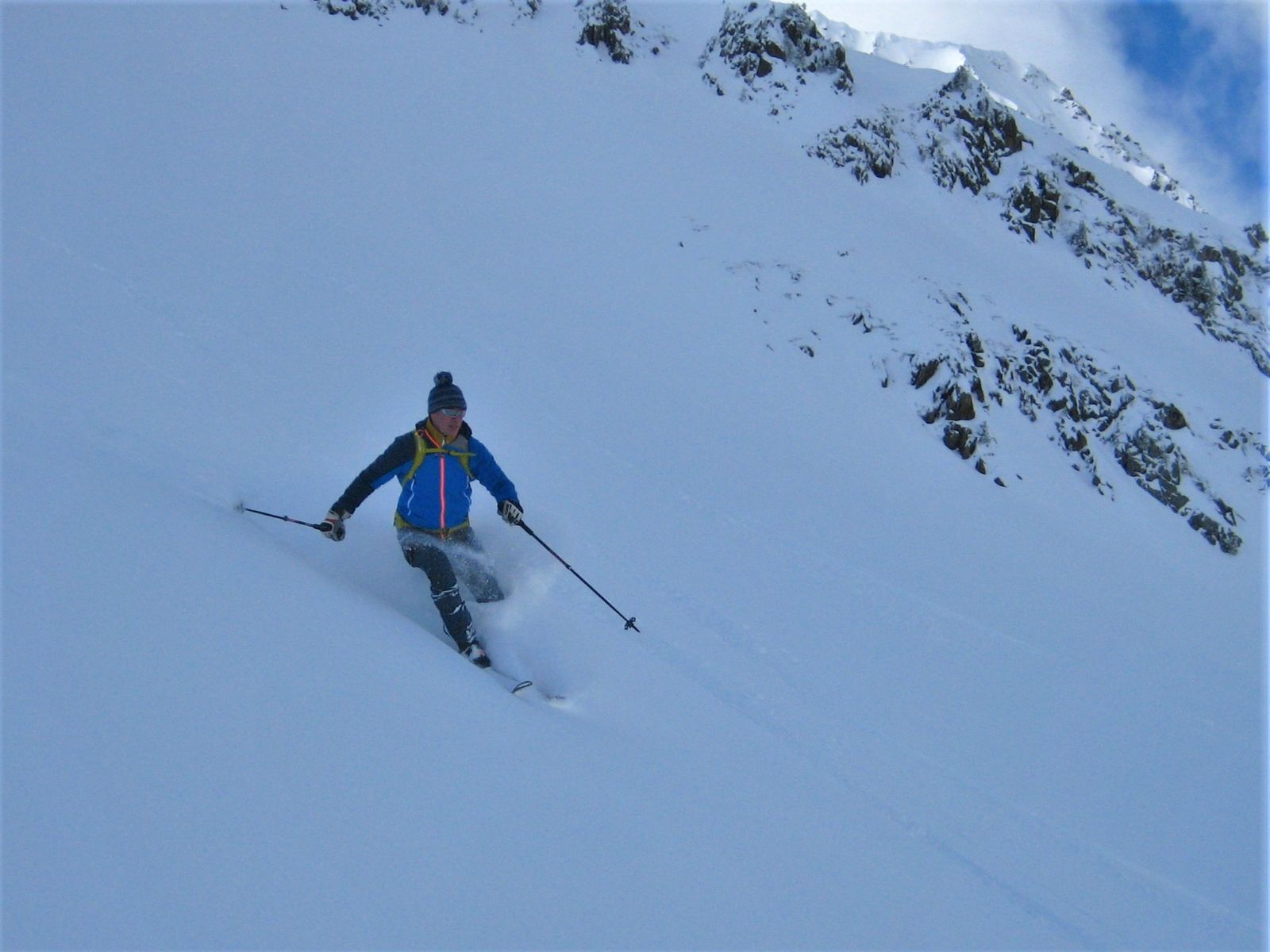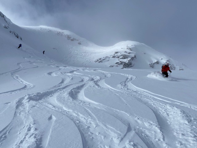 Unterwegs waren wir in einer recht großen Gruppe (sechs Leute), die sich bisweilen etwas auseinanderzog, weil der ein oder andere einen starken Fokus darauf legte, First Lines und staubende Tiefschneeschwünge filmerisch zu dokumentieren.